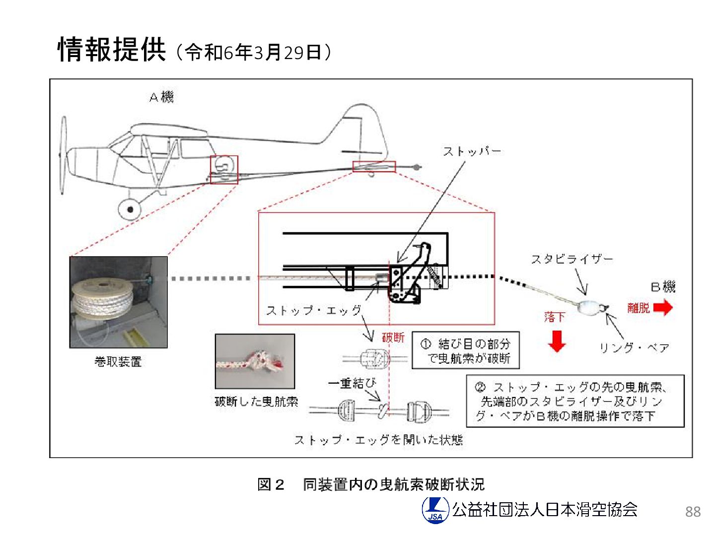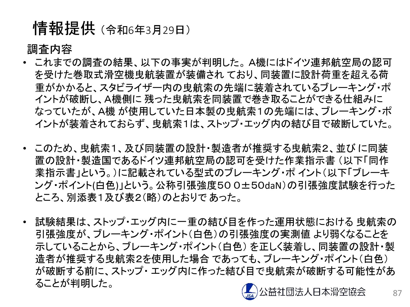情報提供 (令和6年3月29日) 87 調査内容 • これまでの調査の結果、以下の事実が判明した。 A機にはドイツ連邦航空局の認可 を受けた巻取式滑空機曳航装置が装備され ており、同装置に設計荷重を超える荷 重がかかると、スタビライザー内の曳航索の先端に装着されているブレーキング・ポ