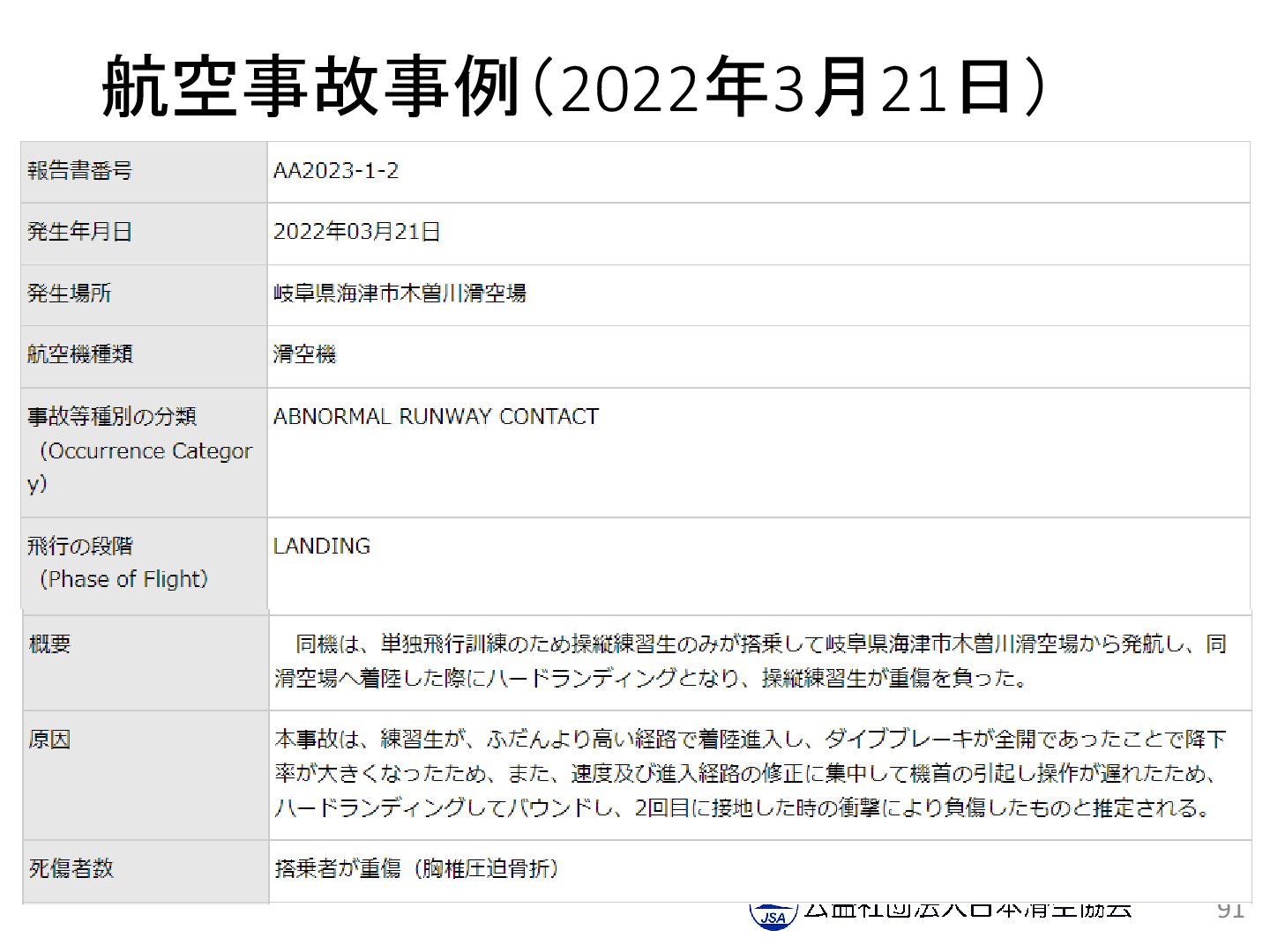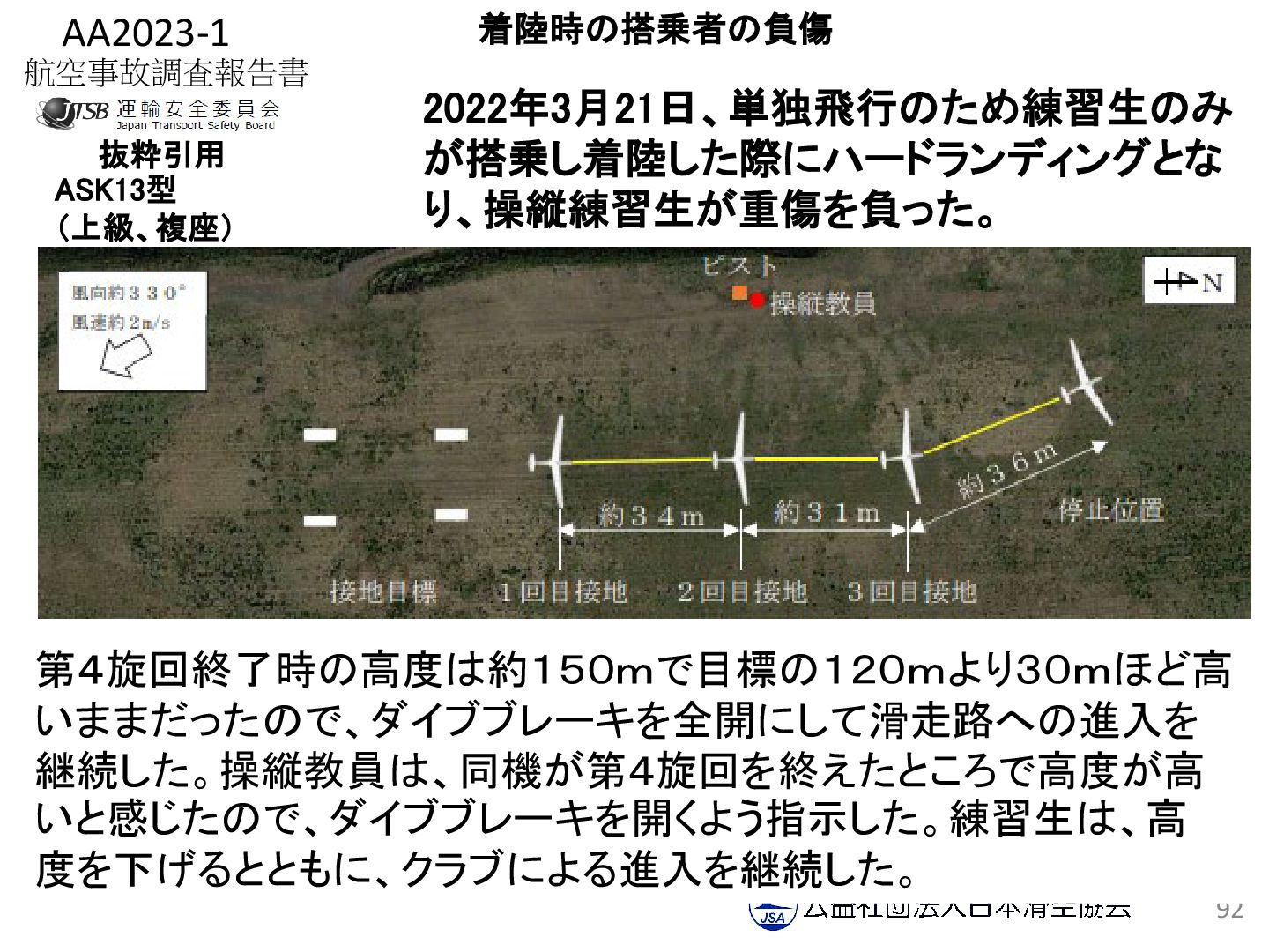 着陸時の搭乗者の負傷 AA2023-1 航空事故調査報告書 抜粋引用 2022年3月21日、単独飛行のため練習生のみ が搭乗し着陸した際にハードランディングとな り、操縦練習生が重傷を負った。 92 第4旋回終了時の高度は約150mで目標の120mより30mほど高 いままだったので、ダイブブレーキを全開にして滑走路への進入を