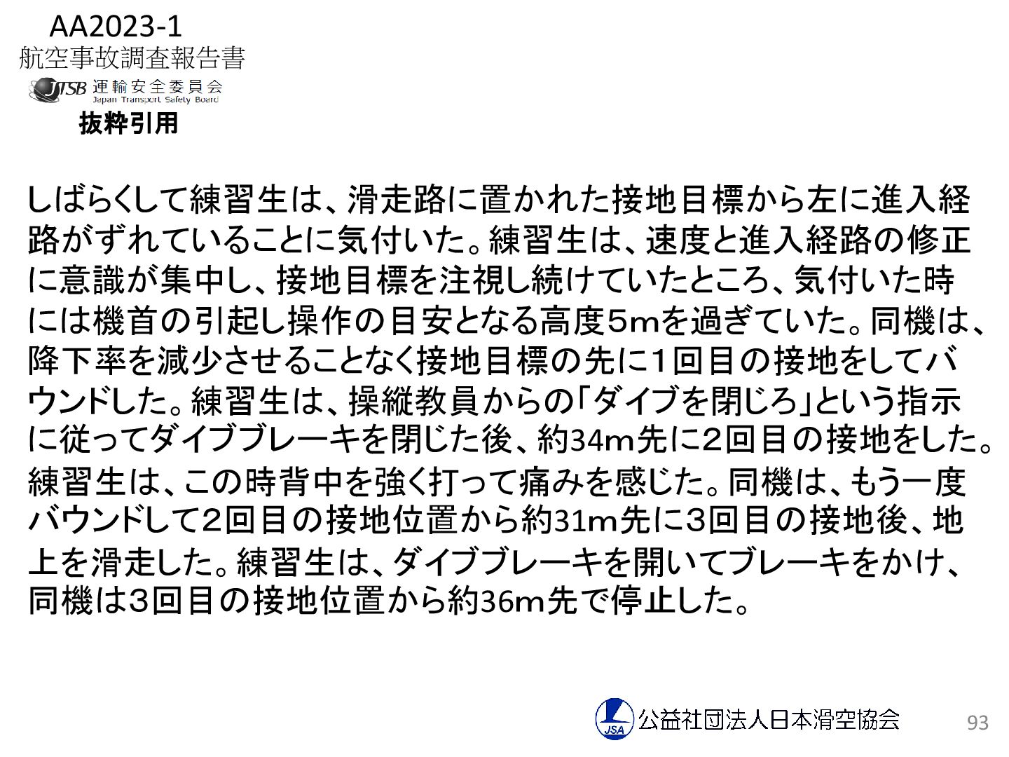 AA2023-1 航空事故調査報告書 抜粋引用 93 しばらくして練習生は、滑走路に置かれた接地目標から左に進入経 路がずれていることに気付いた。練習生は、速度と進入経路の修正 に意識が集中し、接地目標を注視し続けていたところ、気付いた時 には機首の引起し操作の目安となる高度5mを過ぎていた。同機は、 降下率を減少させることなく接地目標の先に1回目の接地をしてバ ウンドした。練習生は、操縦教員からの「ダイブを閉じろ」という指示