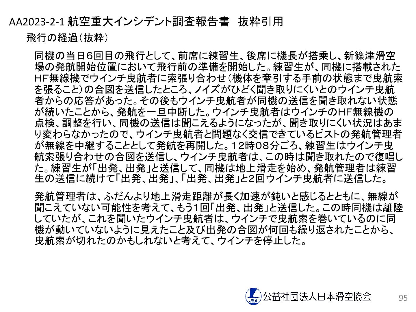 航索張り合わせの合図を送信し、ウインチ曳航者は、この時は聞き取れたので復唱し た。練習生が「出発、出発」と送信して、同機は地上滑走を始め、発航管理者は練習 生の送信に続けて「出発、出発」、「出発、出発」と2回ウインチ曳航者に送信した。 発航管理者は、ふだんより地上滑走距離が長く加速が鈍いと感じるとともに、無線が 聞こえていない可能性を考えて、もう1回「出発、出発」と送信した。この時同機は離陸 していたが、これを聞いたウインチ曳航者は、ウインチで曳航索を巻いているのに同 機が動いていないように見えたこと及び出発の合図が何回も繰り返されたことから、 曳航索が切れたのかもしれないと考えて、ウインチを停止した。 95 AA2023-2-1 航空重大インシデント調査報告書 抜粋引用