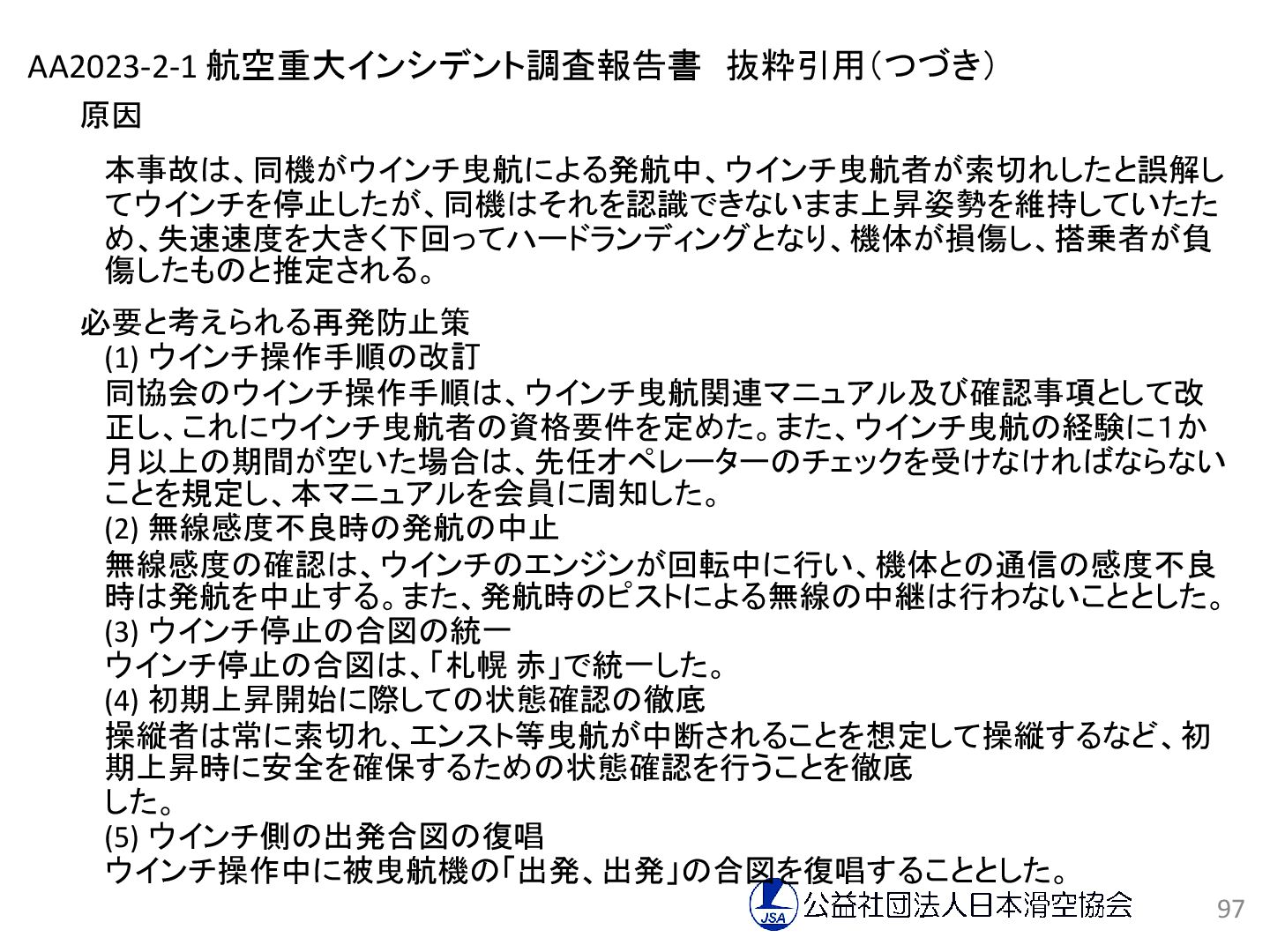 月以上の期間が空いた場合は、先任オペレーターのチェックを受けなければならない ことを規定し、本マニュアルを会員に周知した。 (2) 無線感度不良時の発航の中止 無線感度の確認は、ウインチのエンジンが回転中に行い、機体との通信の感度不良 時は発航を中止する。また、発航時のピストによる無線の中継は行わないこととした。 (3) ウインチ停止の合図の統一 ウインチ停止の合図は、「札幌 赤」で統一した。 (4) 初期上昇開始に際しての状態確認の徹底 操縦者は常に索切れ、エンスト等曳航が中断されることを想定して操縦するなど、初 期上昇時に安全を確保するための状態確認を行うことを徹底 した。 (5) ウインチ側の出発合図の復唱 ウインチ操作中に被曳航機の「出発、出発」の合図を復唱することとした。 97 AA2023-2-1 航空重大インシデント調査報告書 抜粋引用(つづき)