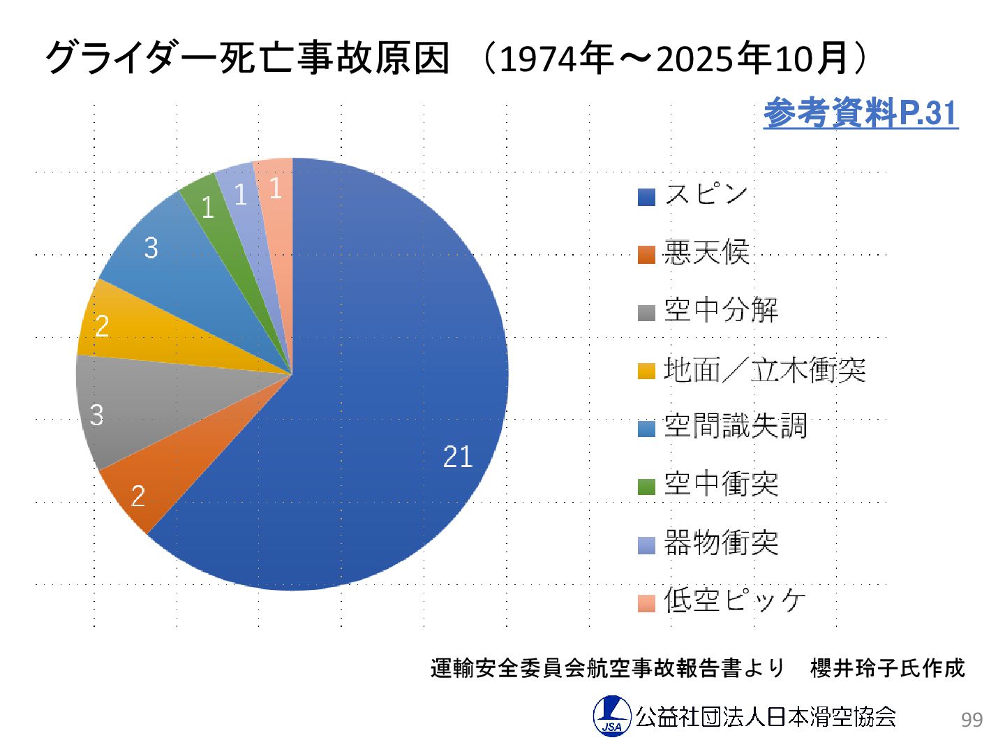 99 グライダー死亡事故原因 (1974年~2025年10月) 運輸安全委員会航空事故報告書より 櫻井玲子氏作成 参考資料P.31