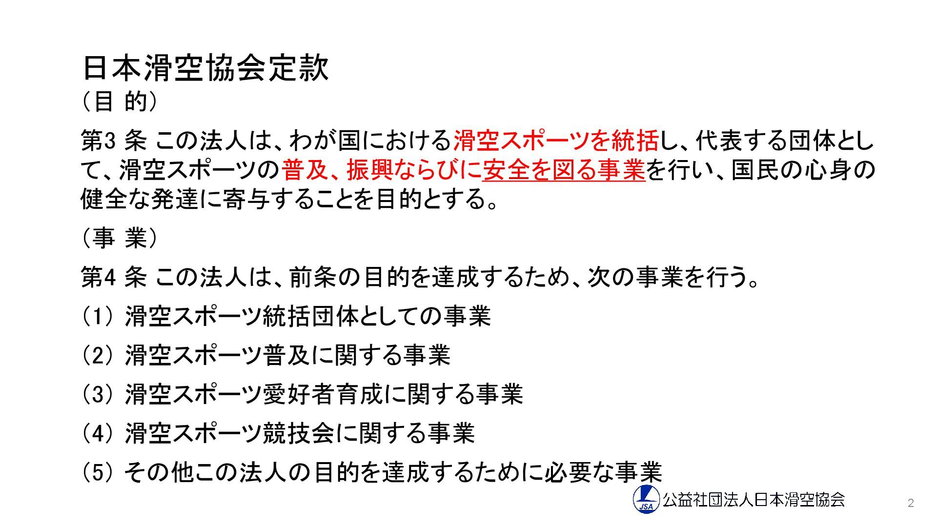 日本滑空協会定款 (目 的) 第3 条 この法人は、わが国における滑空スポーツを統括し、代表する団体とし て、滑空スポーツの普及、振興ならびに安全を図る事業を行い、国民の心身の 健全な発達に寄与することを目的とする。 (事 業)