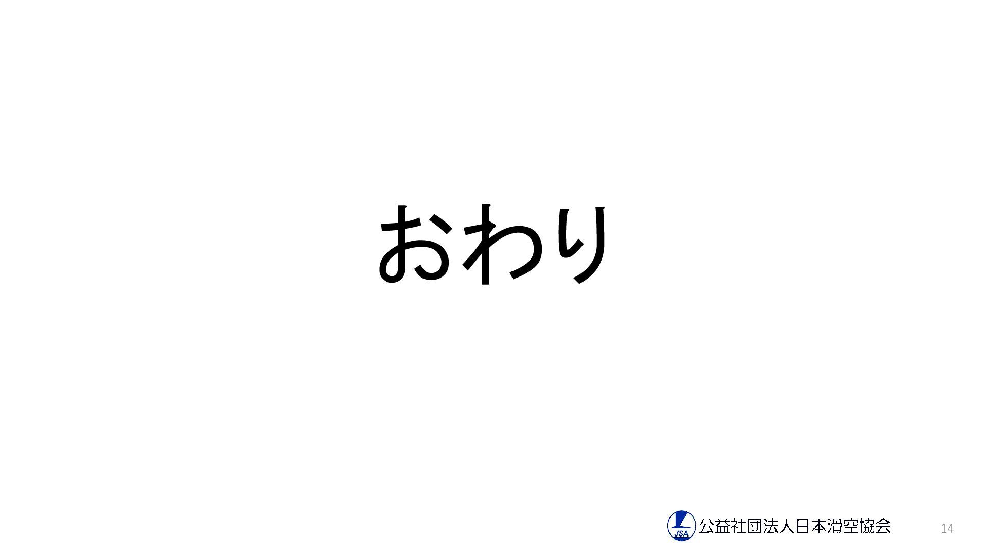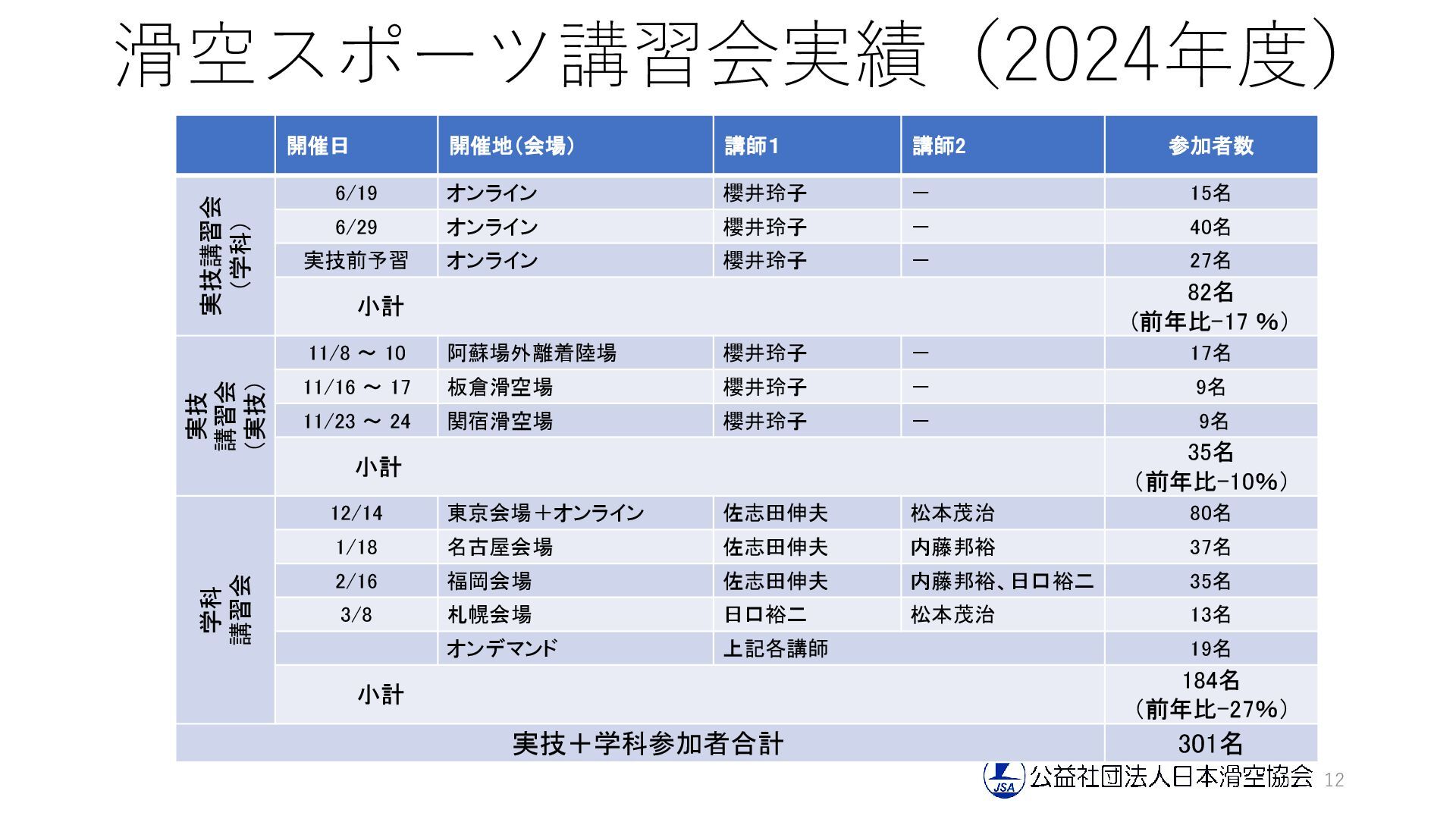 オンライン 櫻井玲子 - 15名 6/29 オンライン 櫻井玲子 - 40名 実技前予習 オンライン 櫻井玲子 - 27名 小計 82名 (前年比-17 %) 実技 講習会 (実技) 11/8 ~ 10 阿蘇場外離着陸場 櫻井玲子 - 17名 11/16 ~ 17 板倉滑空場 櫻井玲子 - 9名 11/23 ~ 24 関宿滑空場 櫻井玲子 - 9名 小計 35名 (前年比-10%) 学科 講習会 12/14 東京会場+オンライン 佐志田伸夫 松本茂治 80名 1/18 名古屋会場 佐志田伸夫 内藤邦裕 37名 2/16 福岡会場 佐志田伸夫 内藤邦裕、日口裕二 35名 3/8 札幌会場 日口裕二 松本茂治 13名 オンデマンド 上記各講師 19名 小計 184名 (前年比-27%) 実技+学科参加者合計 301名