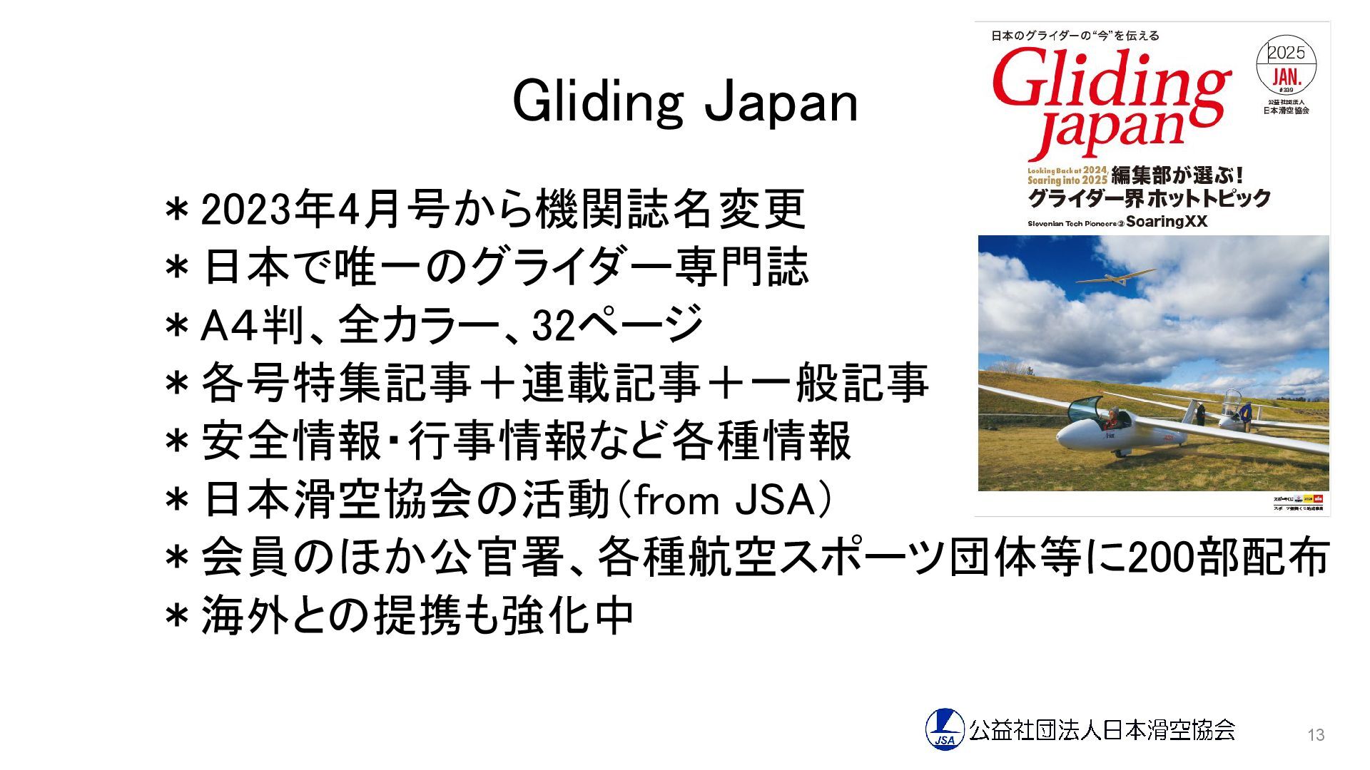 Gliding Japan *2023年4月号から機関誌名変更 *日本で唯一のグライダー専門誌 *A4判、全カラー、32ページ *各号特集記事+連載記事+一般記事 *安全情報・行事情報など各種情報 *日本滑空協会の活動(from JSA) *会員のほか公官署、各種航空スポーツ団体等に200部配布