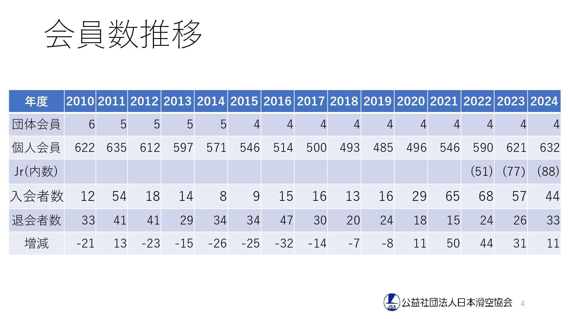 2017 2018 2019 2020 2021 2022 2023 2024 団体会員 6 5 5 5 5 4 4 4 4 4 4 4 4 4 4 個人会員 622 635 612 597 571 546 514 500 493 485 496 546 590 621 632 Jr(内数) (51) (77) (88) 入会者数 12 54 18 14 8 9 15 16 13 16 29 65 68 57 44 退会者数 33 41 41 29 34 34 47 30 20 24 18 15 24 26 33 増減 -21 13 -23 -15 -26 -25 -32 -14 -7 -8 11 50 44 31 11