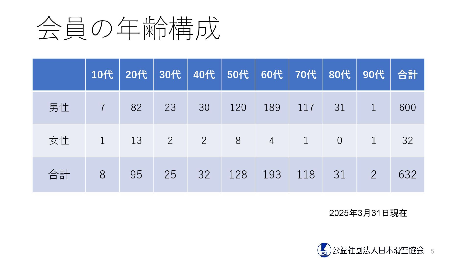 90代 合計 男性 7 82 23 30 120 189 117 31 1 600 女性 1 13 2 2 8 4 1 0 1 32 合計 8 95 25 32 128 193 118 31 2 632 2025年3月31日現在