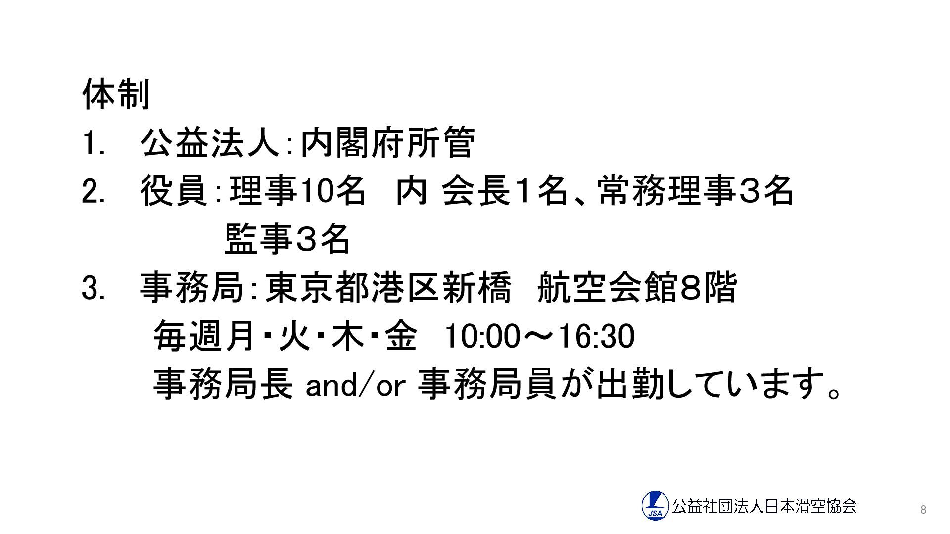 体制 1. 公益法人:内閣府所管 2. 役員:理事10名 内 会長1名、常務理事3名 監事3名 3. 事務局:東京都港区新橋
