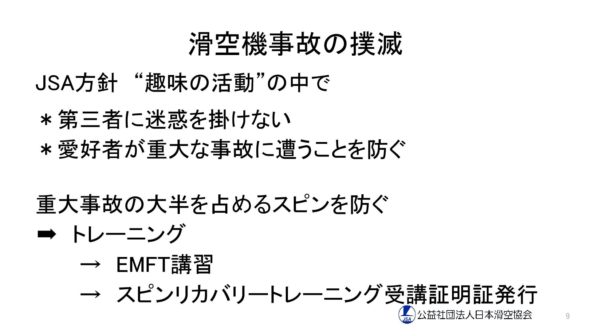 滑空機事故の撲滅 JSA方針 “趣味の活動”の中で *第三者に迷惑を掛けない *愛好者が重大な事故に遭うことを防ぐ 重大事故の大半を占めるスピンを防ぐ ➡ トレーニング → EMFT講習