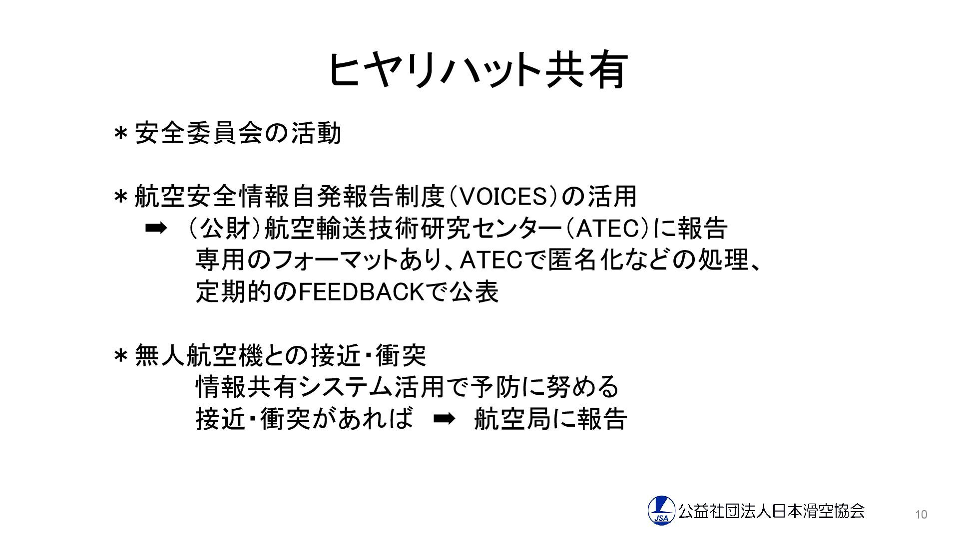ヒヤリハット共有 *安全委員会の活動 *航空安全情報自発報告制度(VOICES)の活用 ➡ (公財)航空輸送技術研究センター(ATEC)に報告 専用のフォーマットあり、ATECで匿名化などの処理、 定期的のFEEDBACKで公表 *無人航空機との接近・衝突 情報共有システム活用で予防に努める 接近・衝突があれば