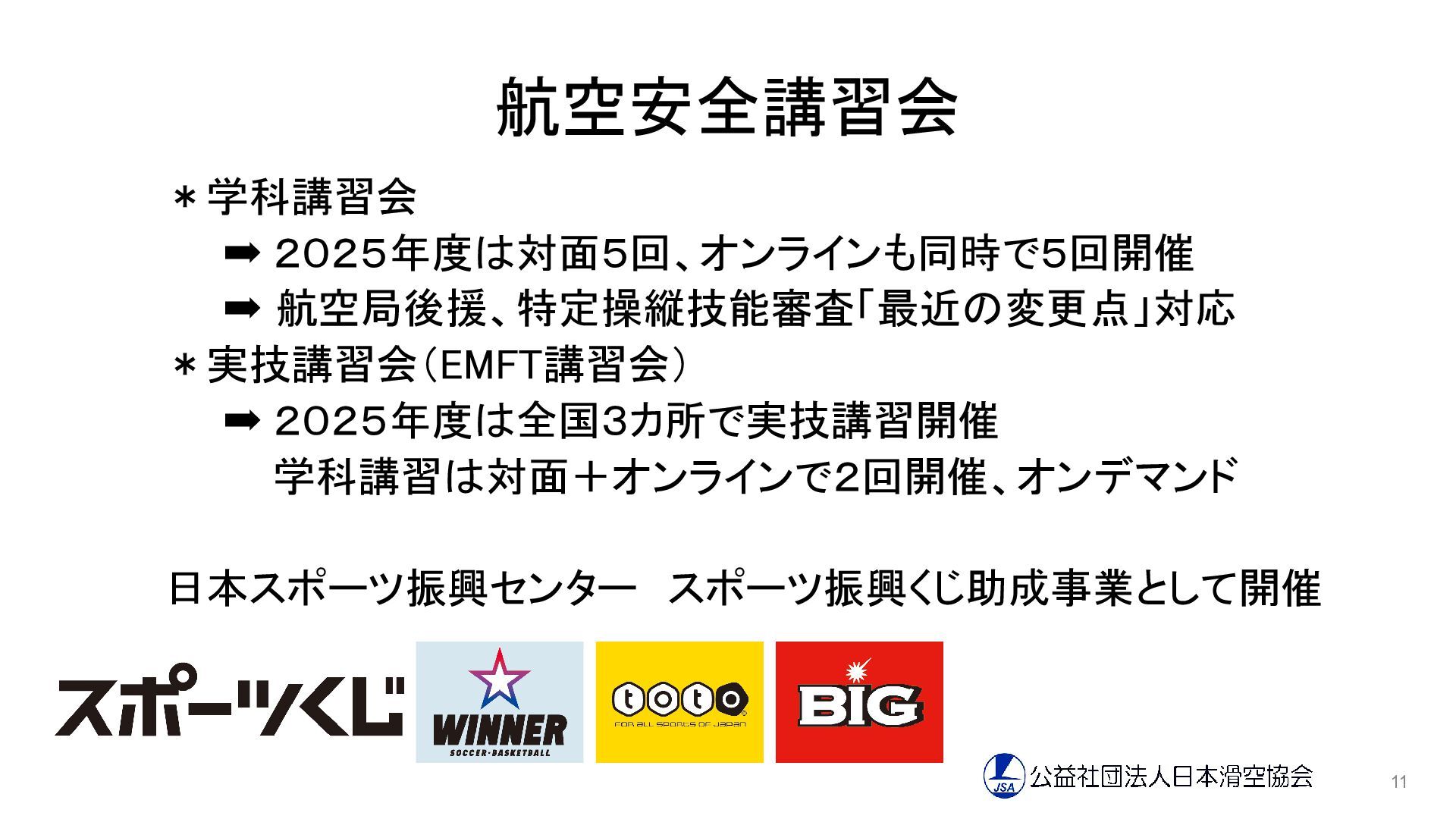 航空安全講習会 *学科講習会 ➡ 2025年度は対面5回、オンラインも同時で5回開催 ➡ 航空局後援、特定操縦技能審査「最近の変更点」対応 *実技講習会(EMFT講習会) ➡ 2025年度は全国3カ所で実技講習開催 学科講習は対面+オンラインで2回開催、オンデマンド