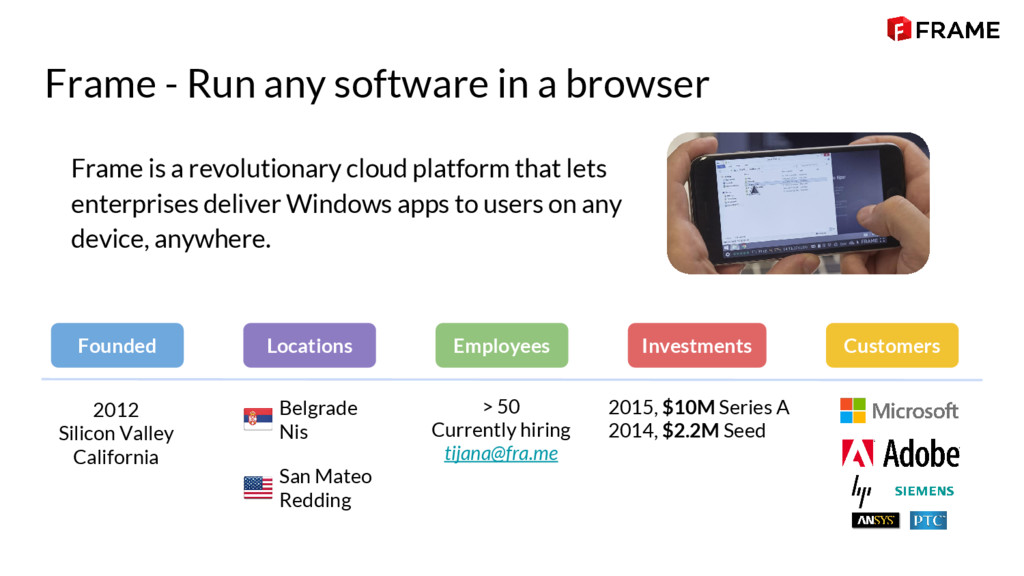 Some of the biggest industries in the field—such as Adobe, Hewlett-Packard, and Siemens – are our customers. We have also secured more than 12 million dollars in investments and are growing at an amazing rate. To date, Frame has about 50 employees, with that number being projected to double by the end of 2017.