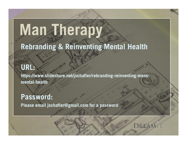 email [email protected] for a password Rebranding & Reinventing Mental Health URL: https://www.slideshare.net/jschafler/rebranding-reinventing-mens- mental-health Password: Please email [email protected] for a password Man Therapy Man Therapy