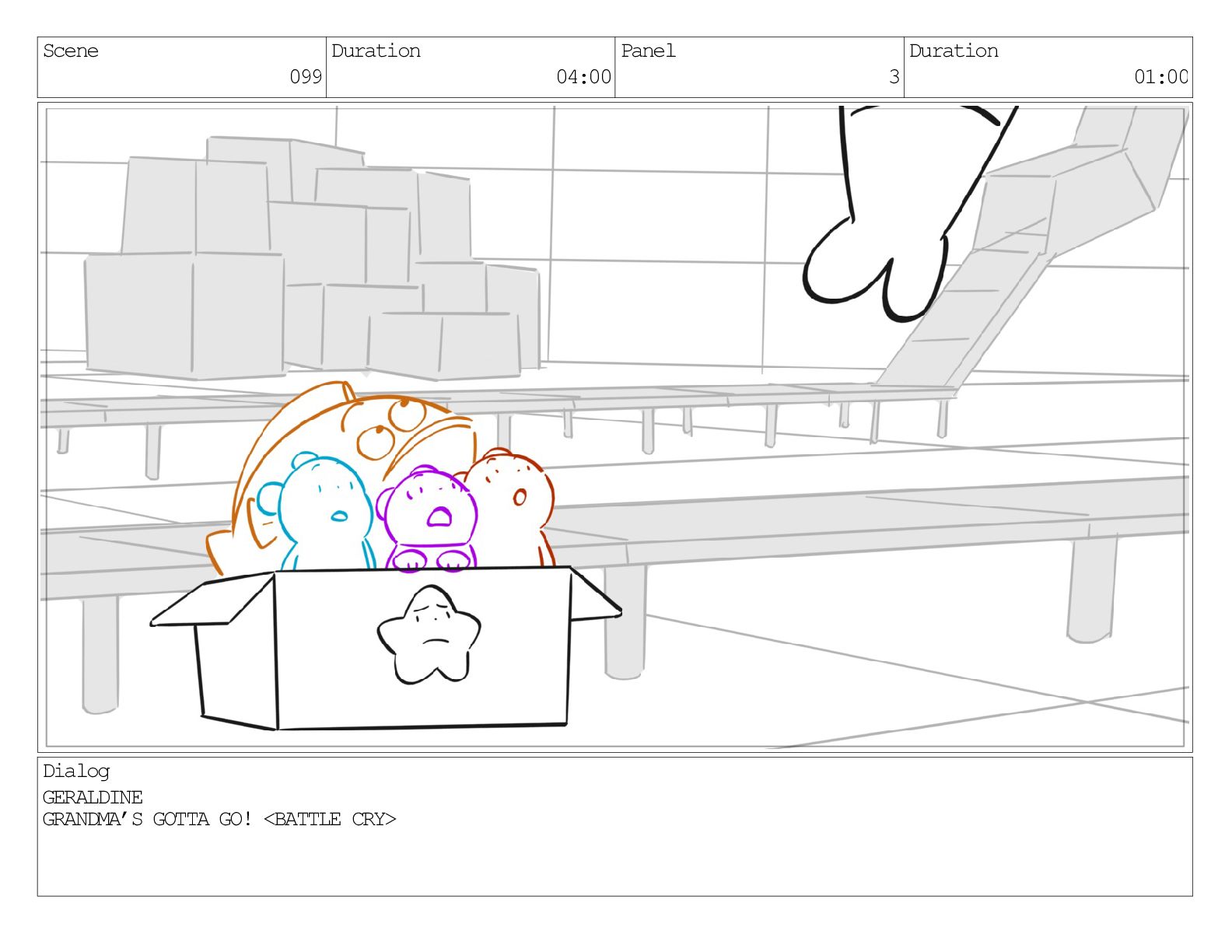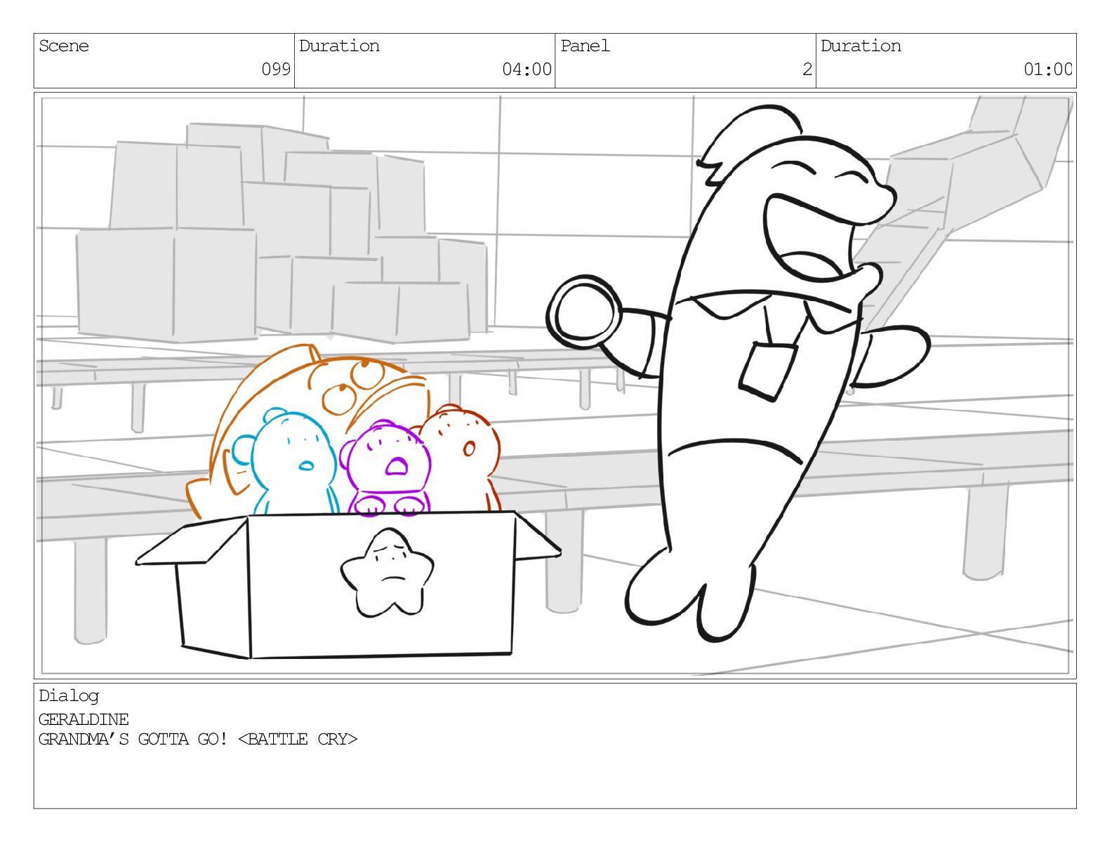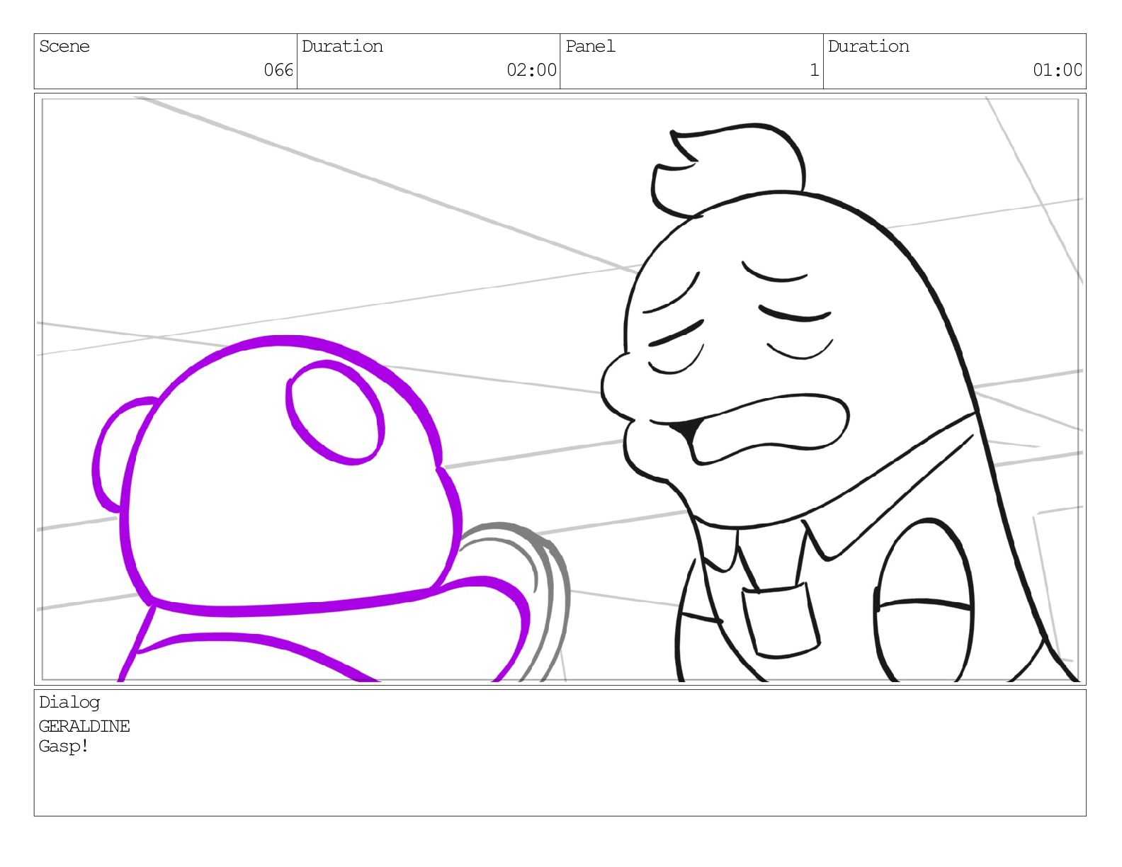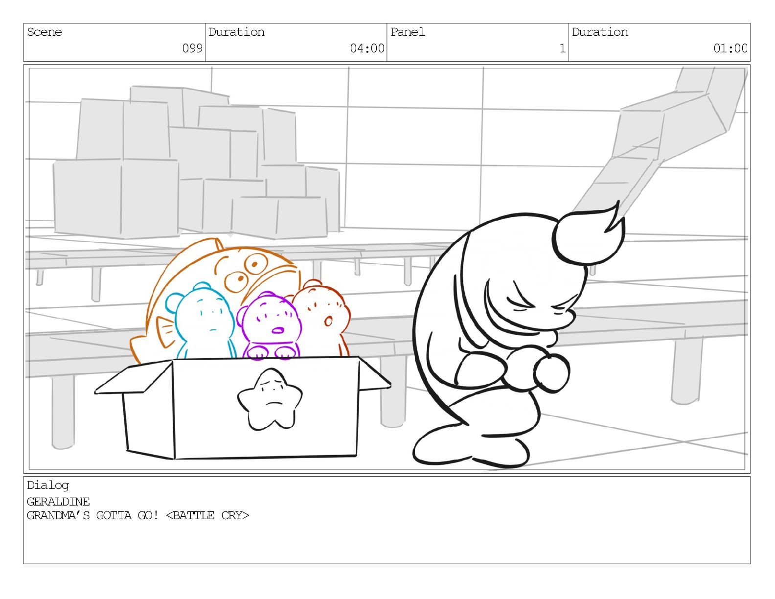 Scene 099 Duration 04:00 Panel 1 Duration 01:00 Dialog GERALDINE