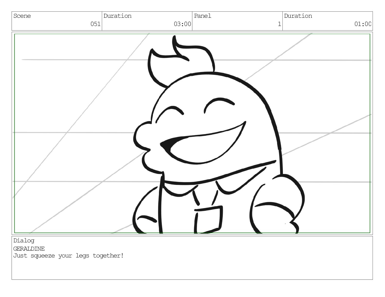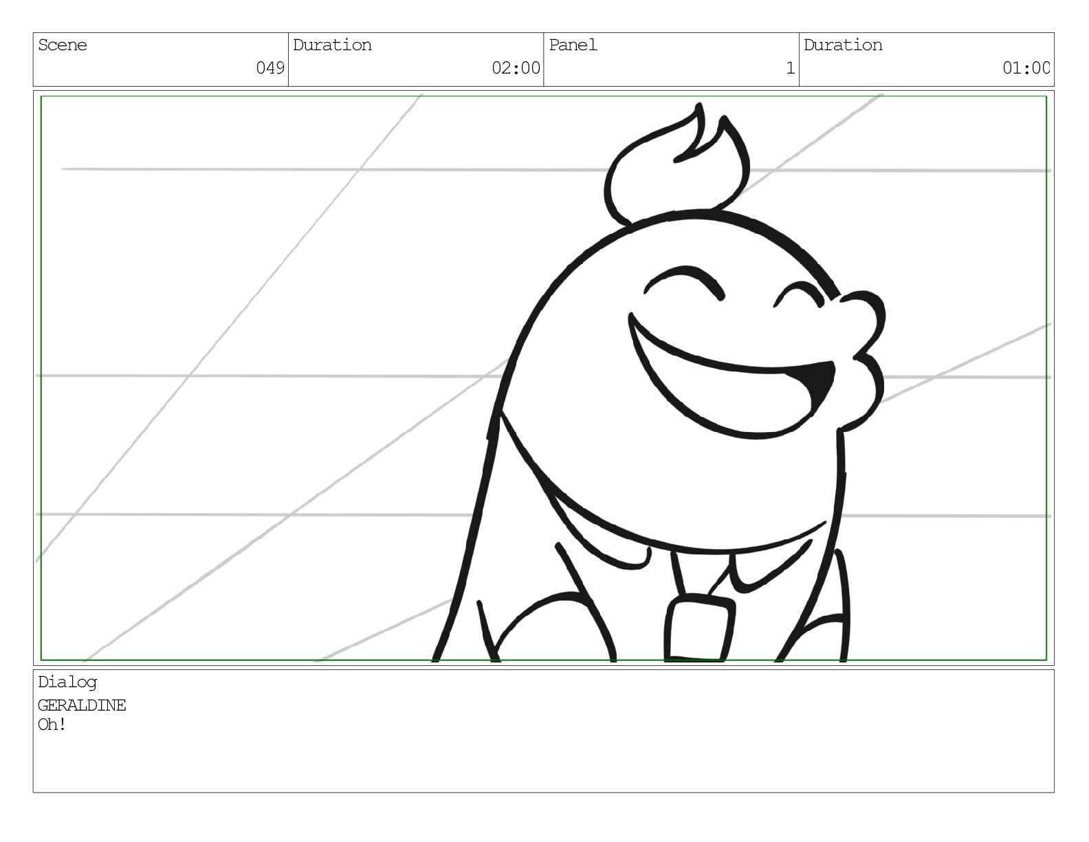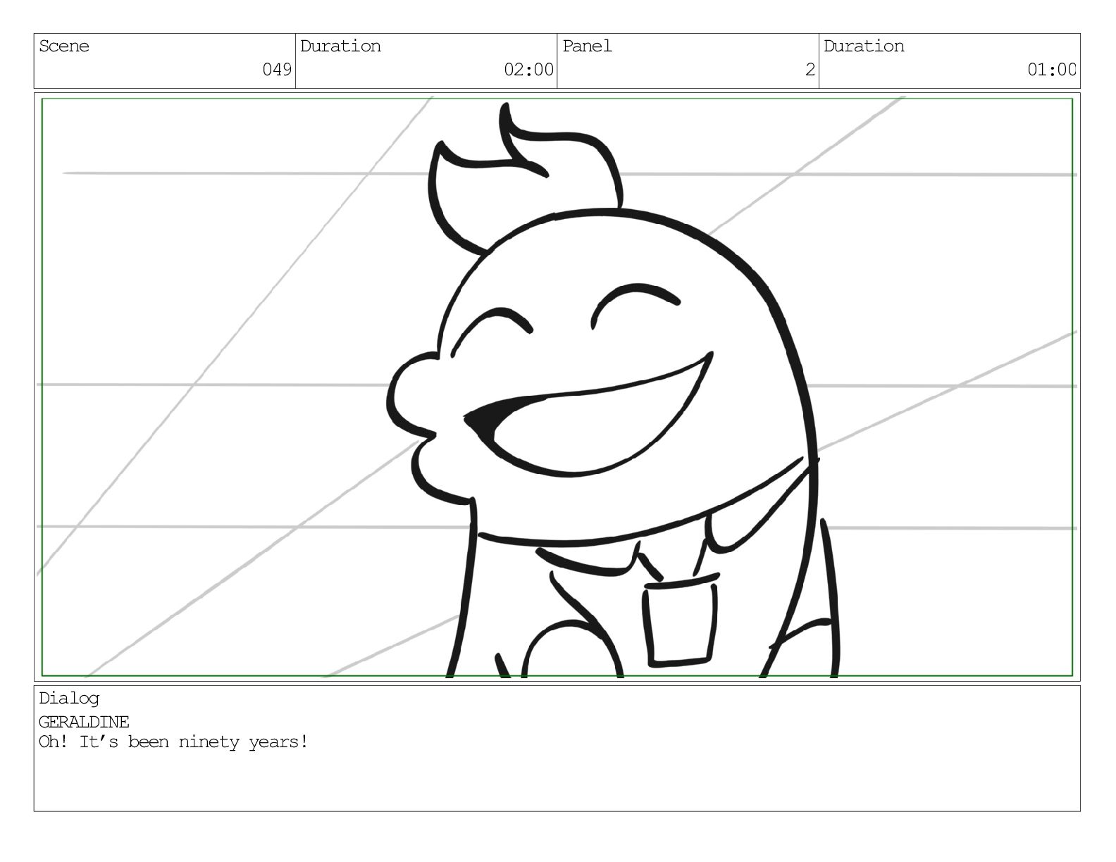 Scene 099 Duration 04:00 Panel 1 Duration 01:00 Dialog GERALDINE