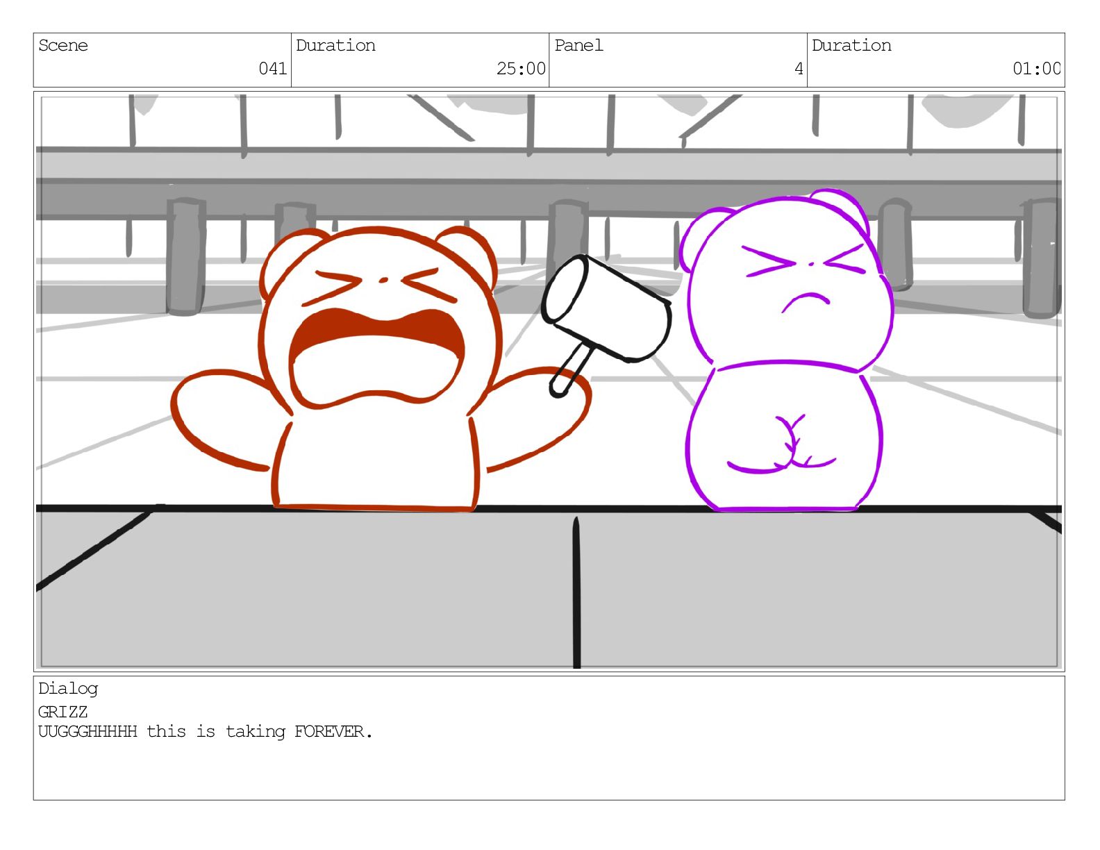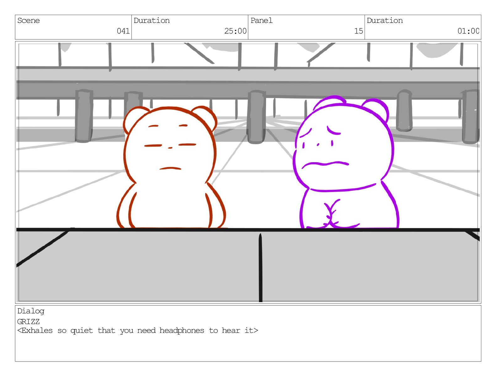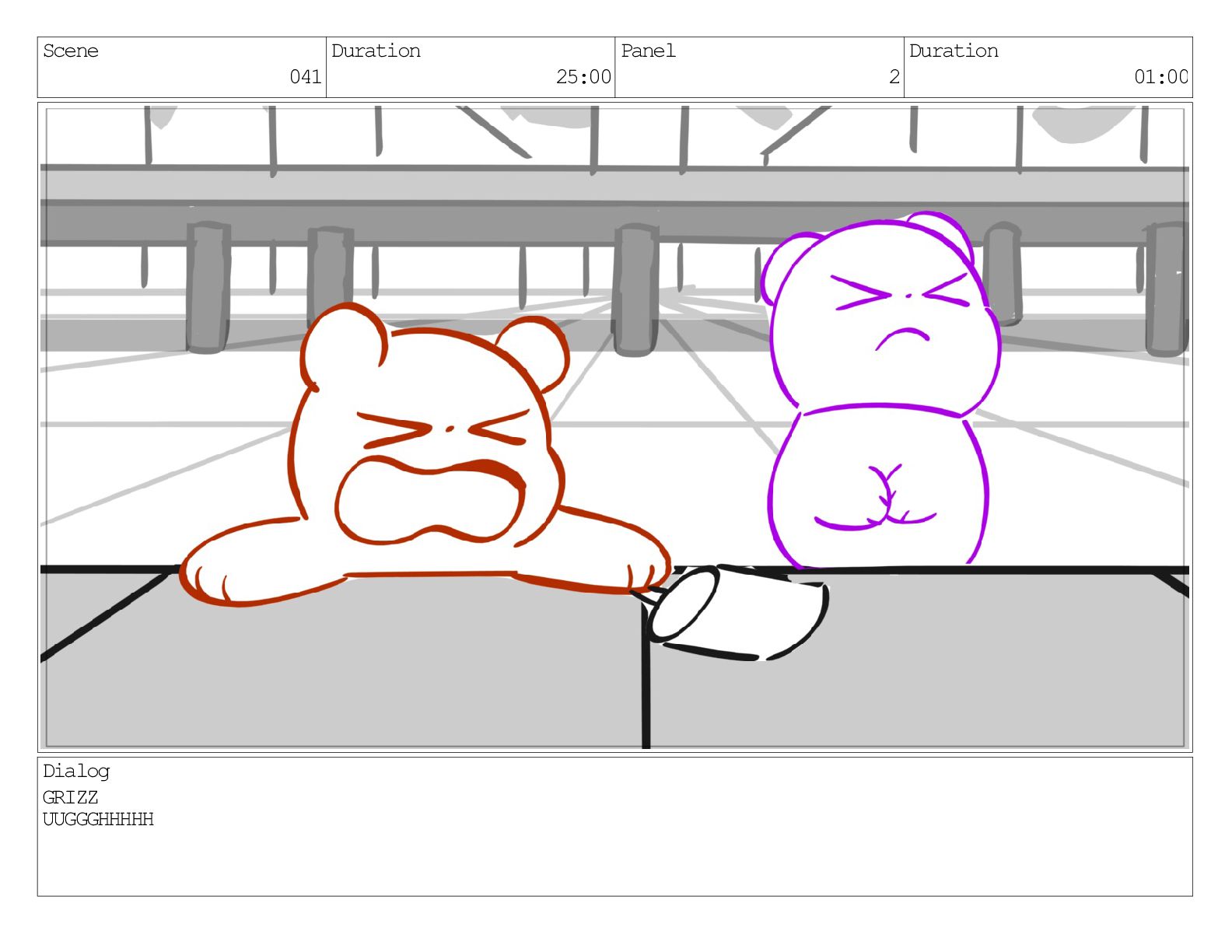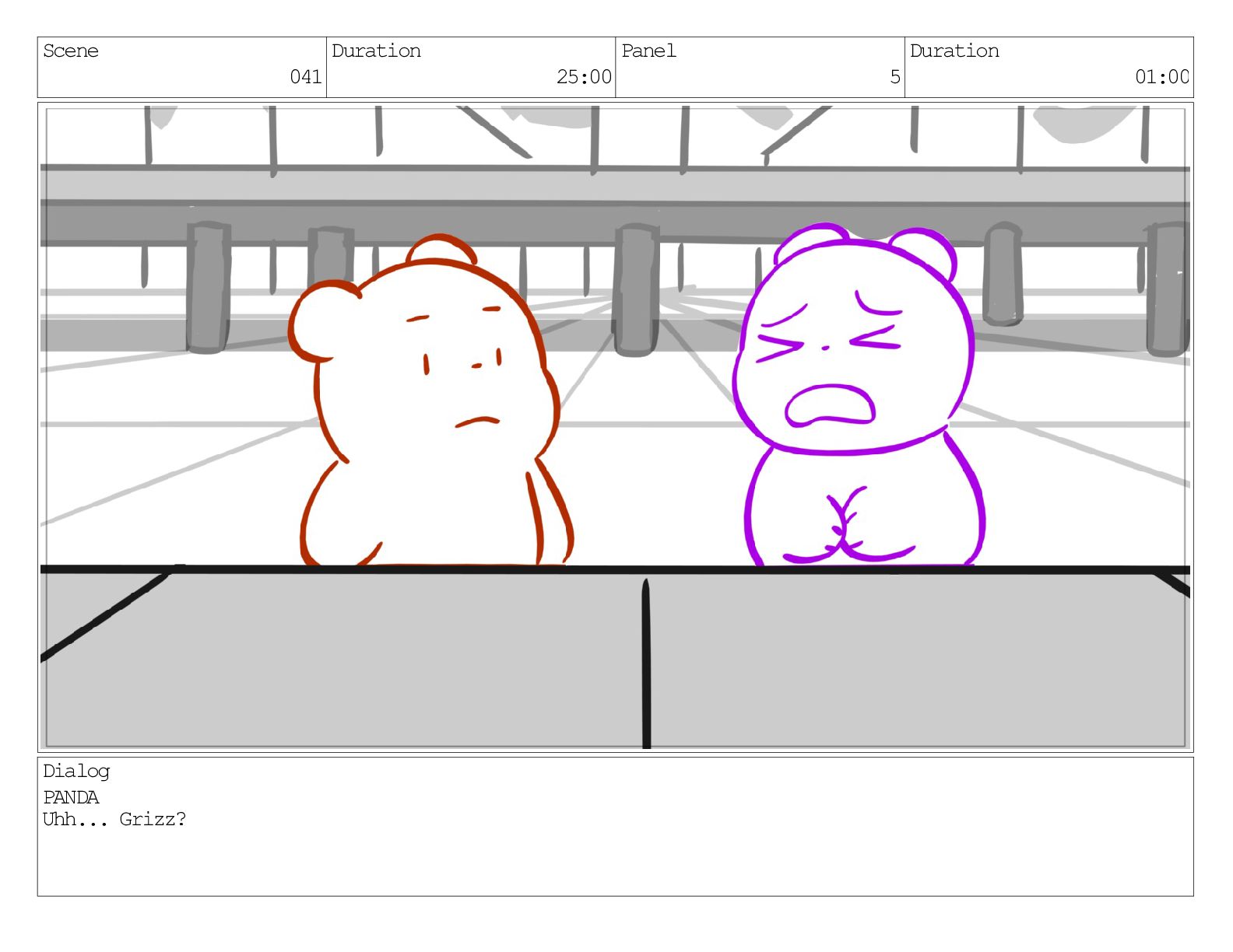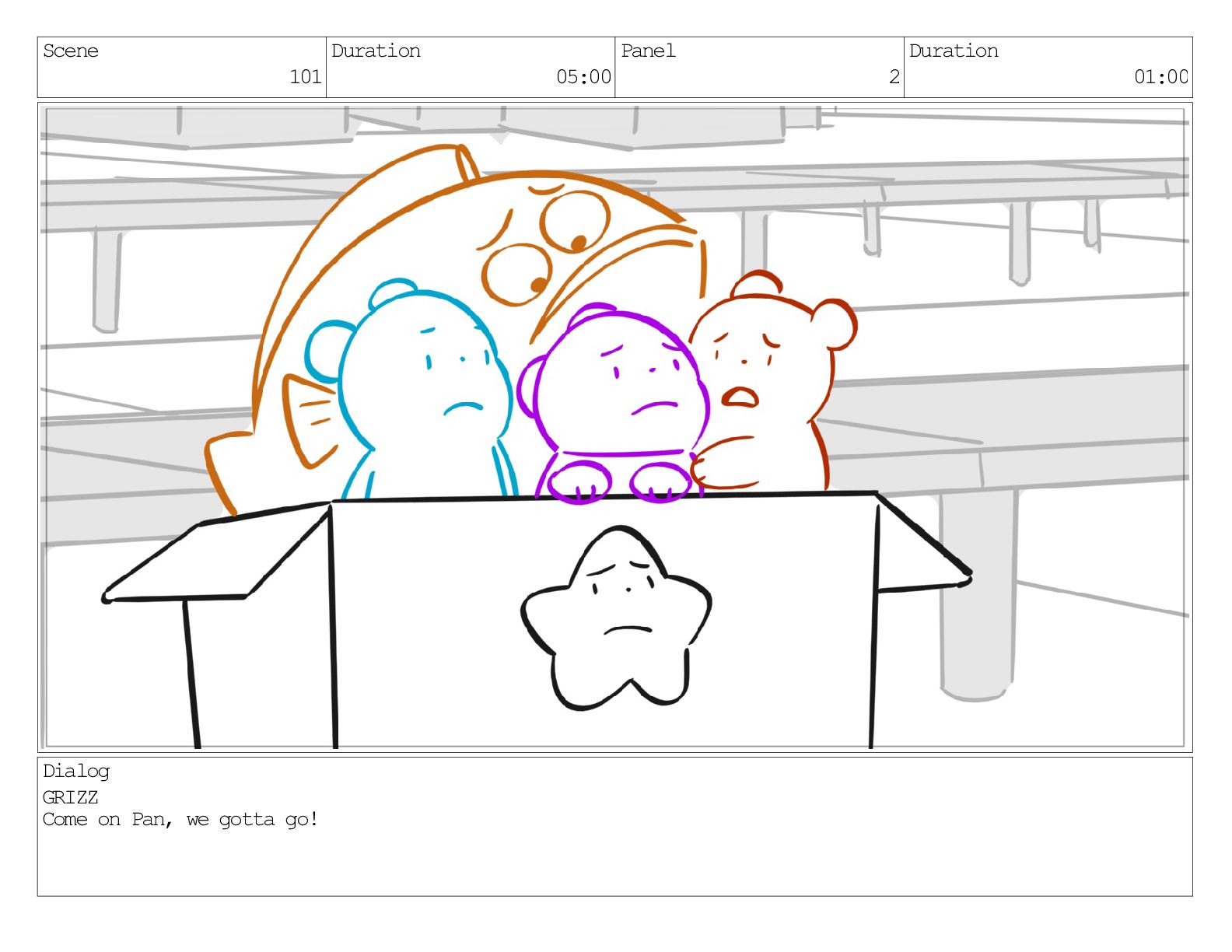 Scene 101 Duration 05:00 Panel 2 Duration 01:00 Dialog GRIZZ