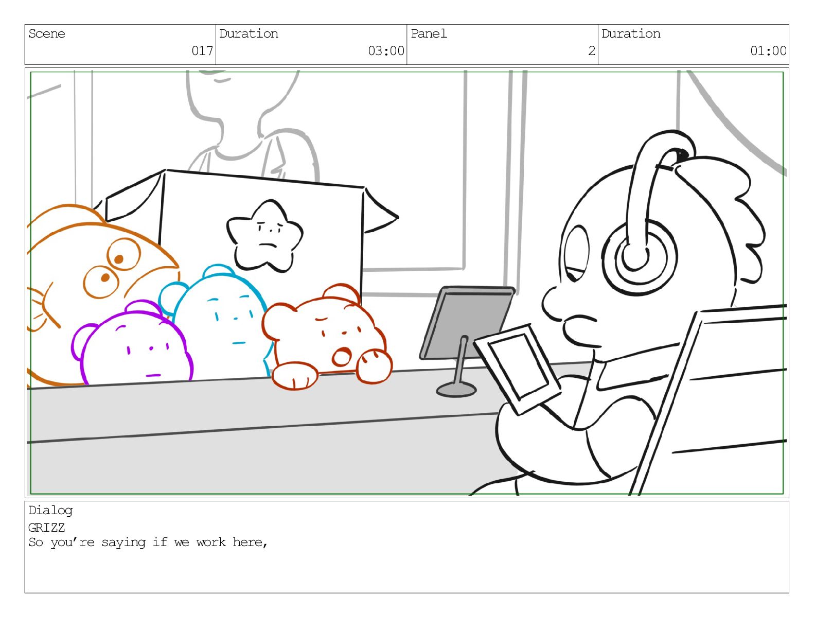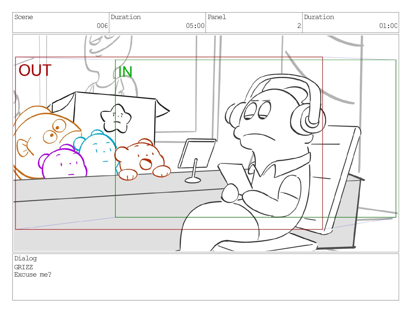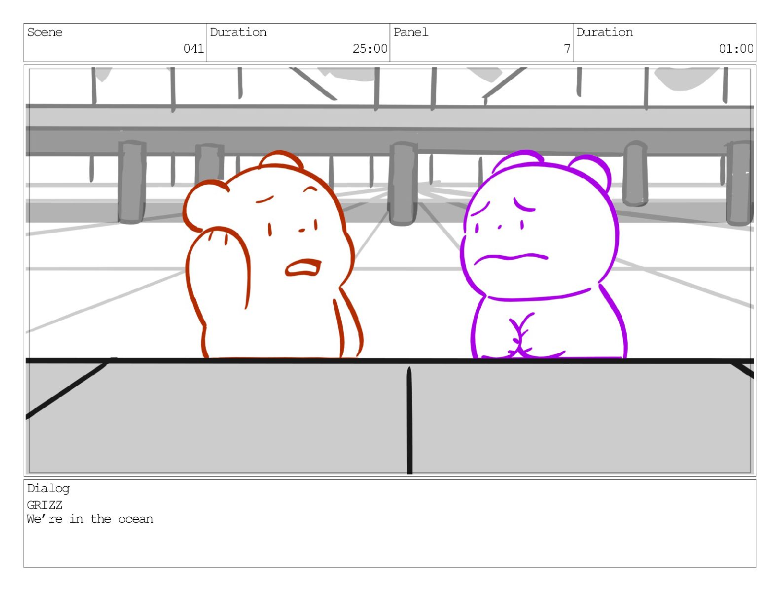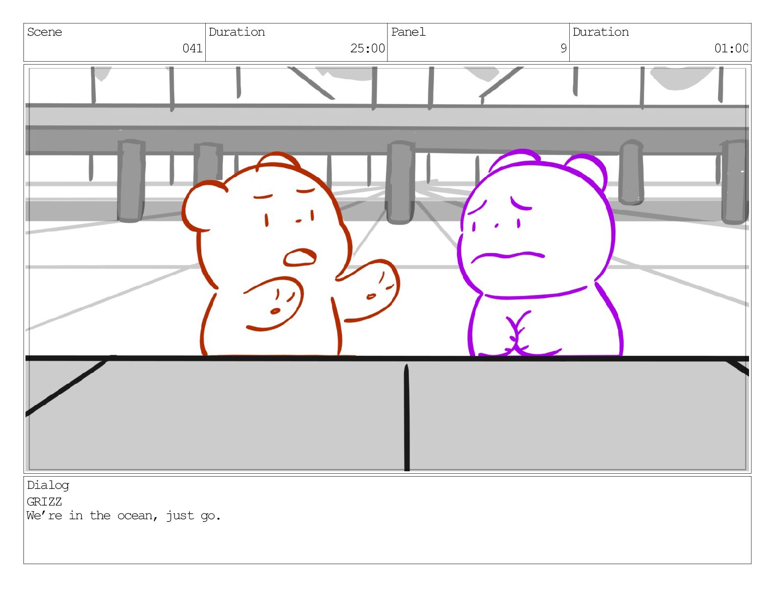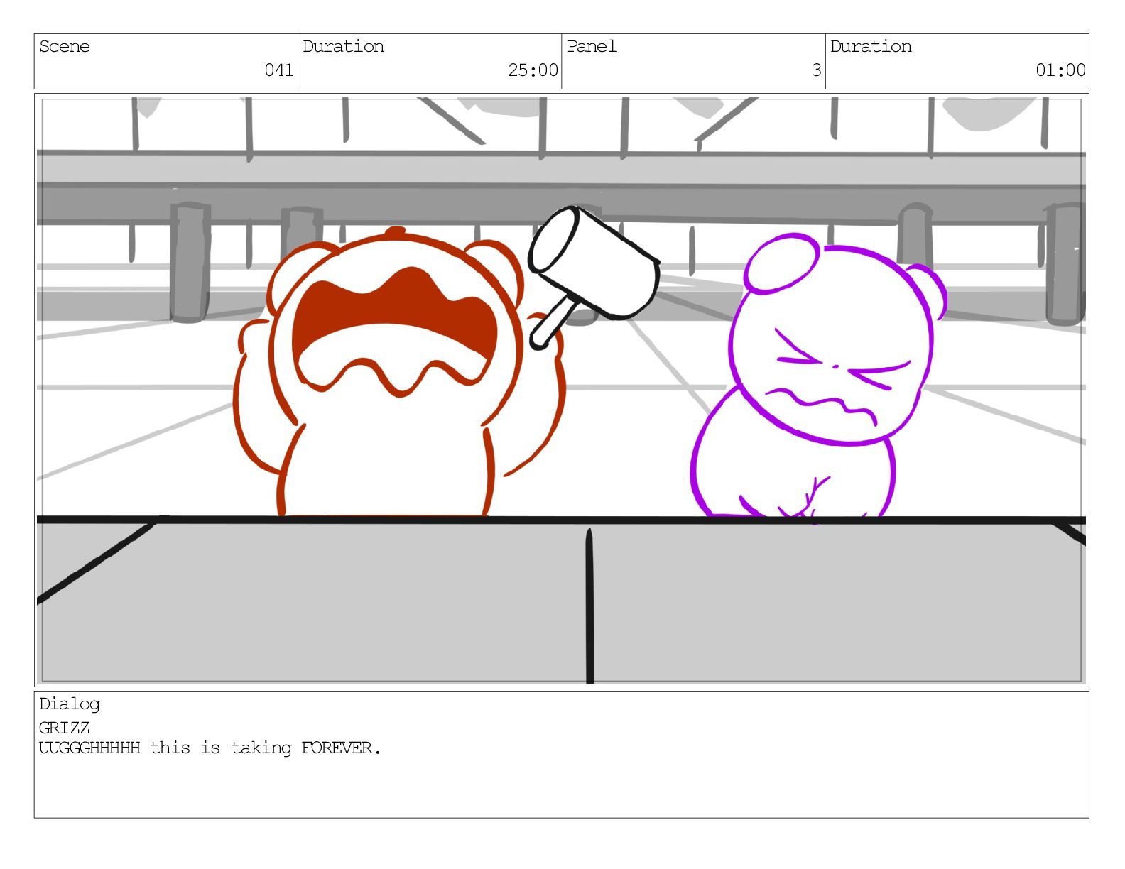 Scene 101 Duration 05:00 Panel 2 Duration 01:00 Dialog GRIZZ