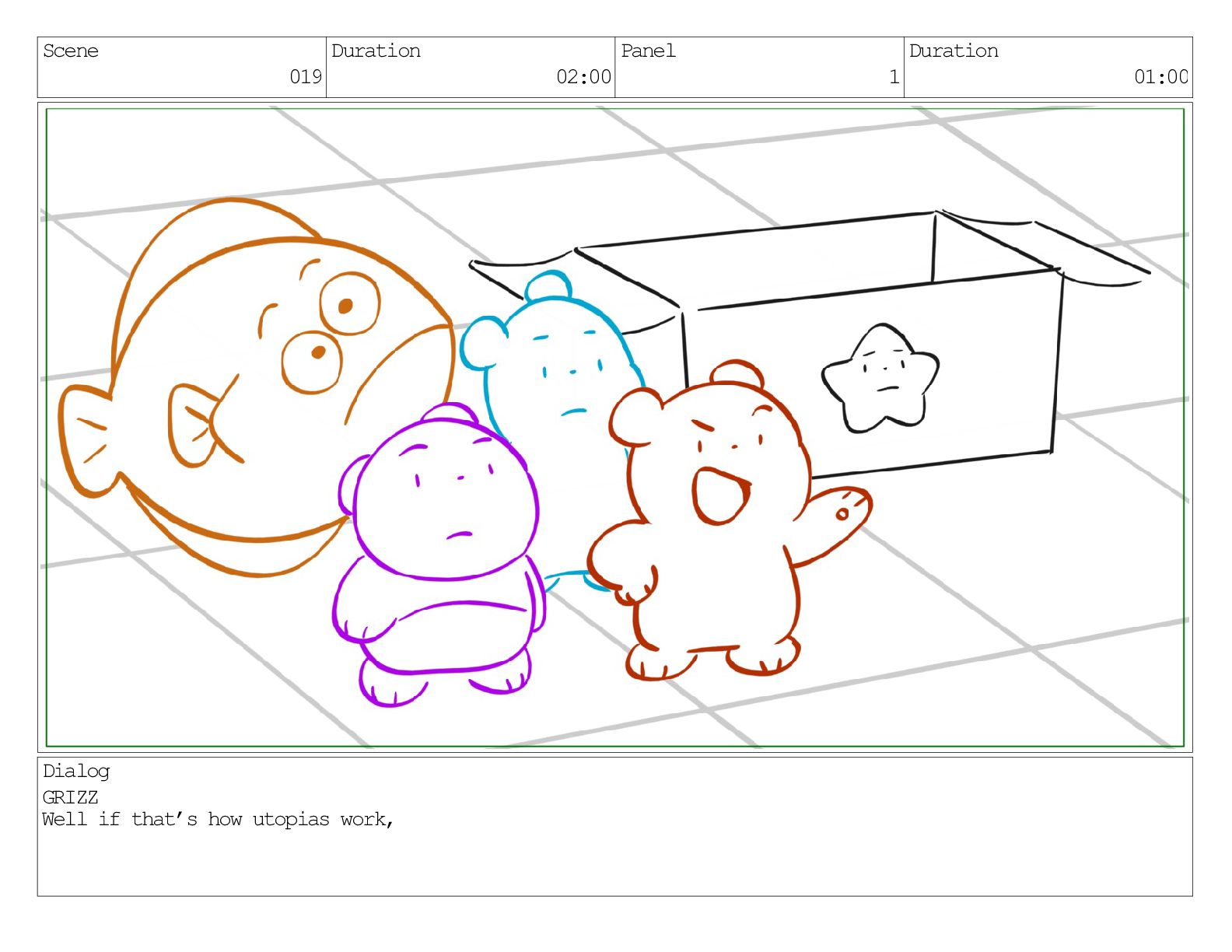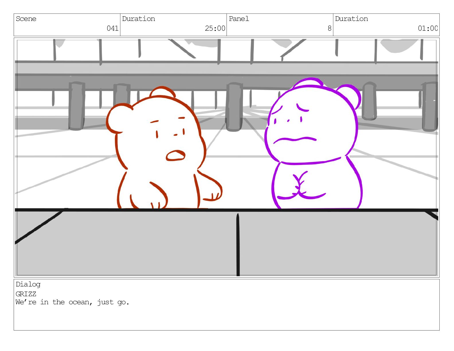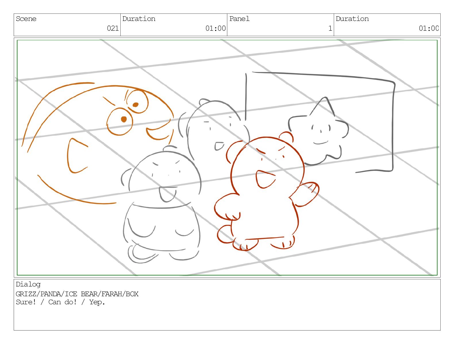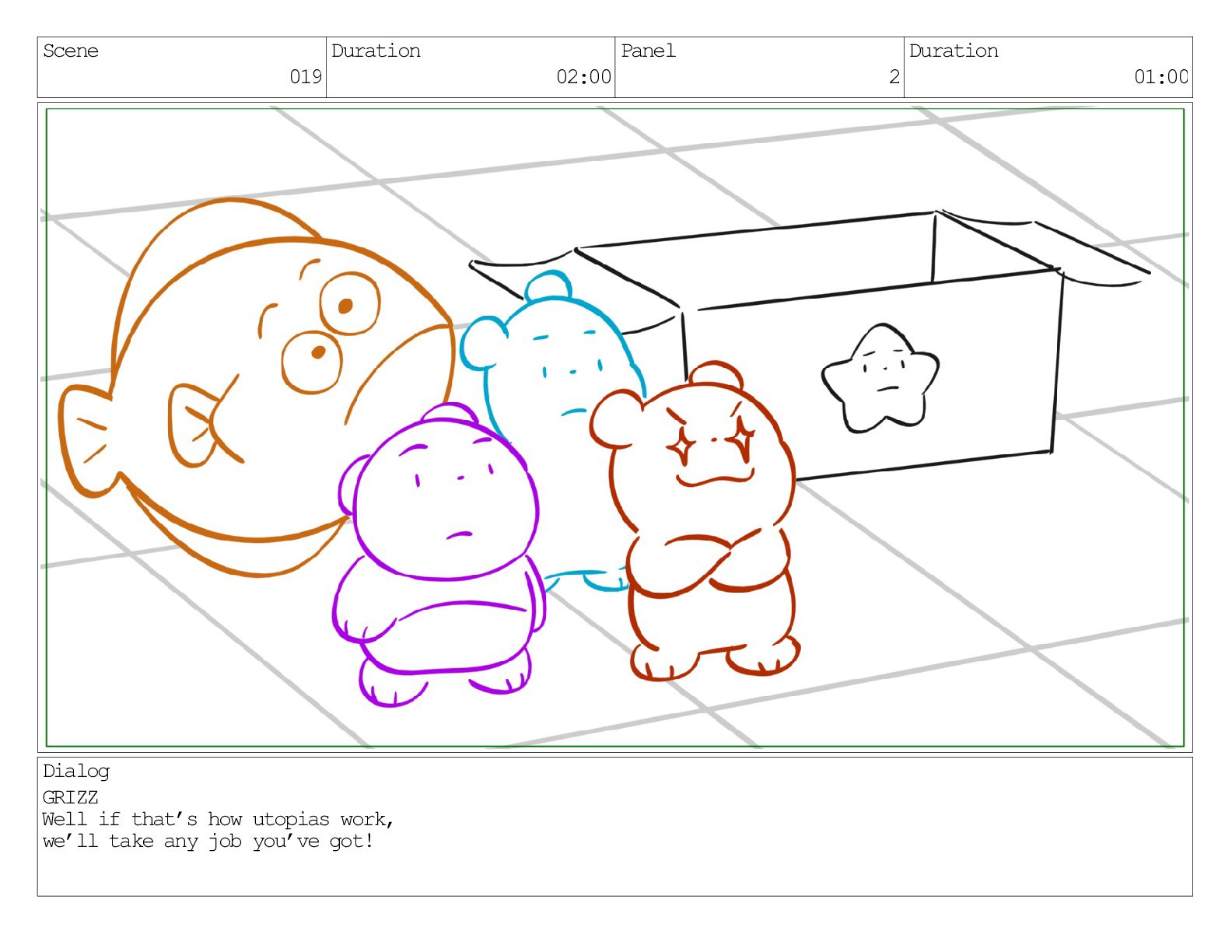 Scene 101 Duration 05:00 Panel 2 Duration 01:00 Dialog GRIZZ
