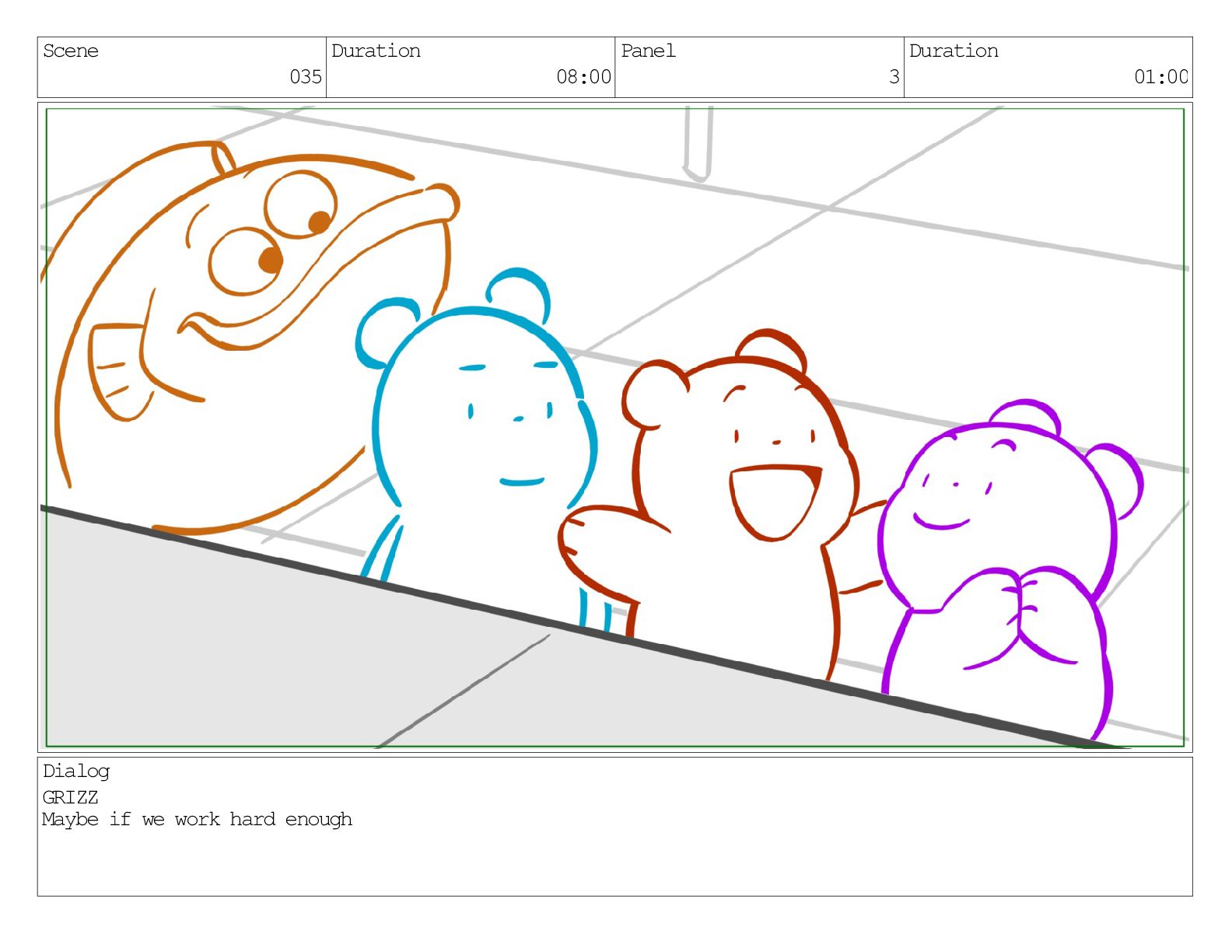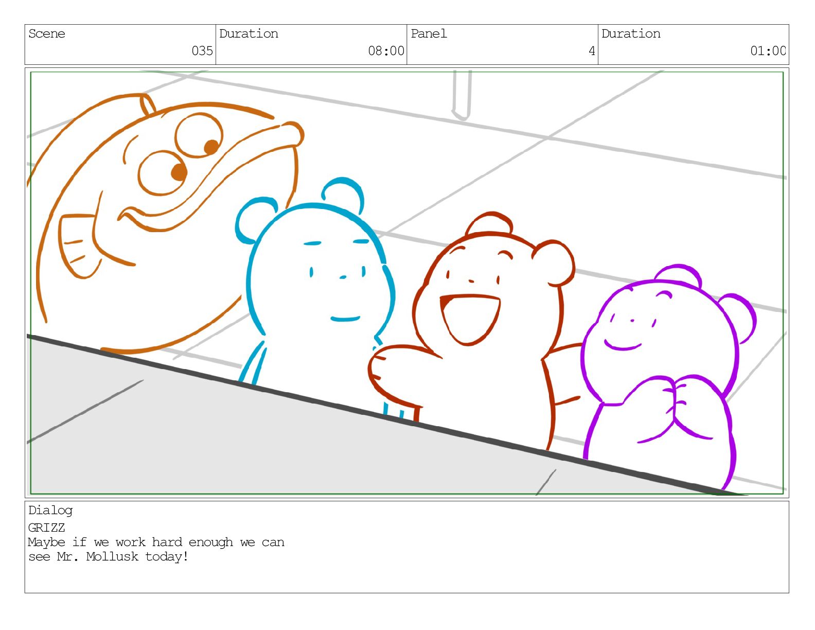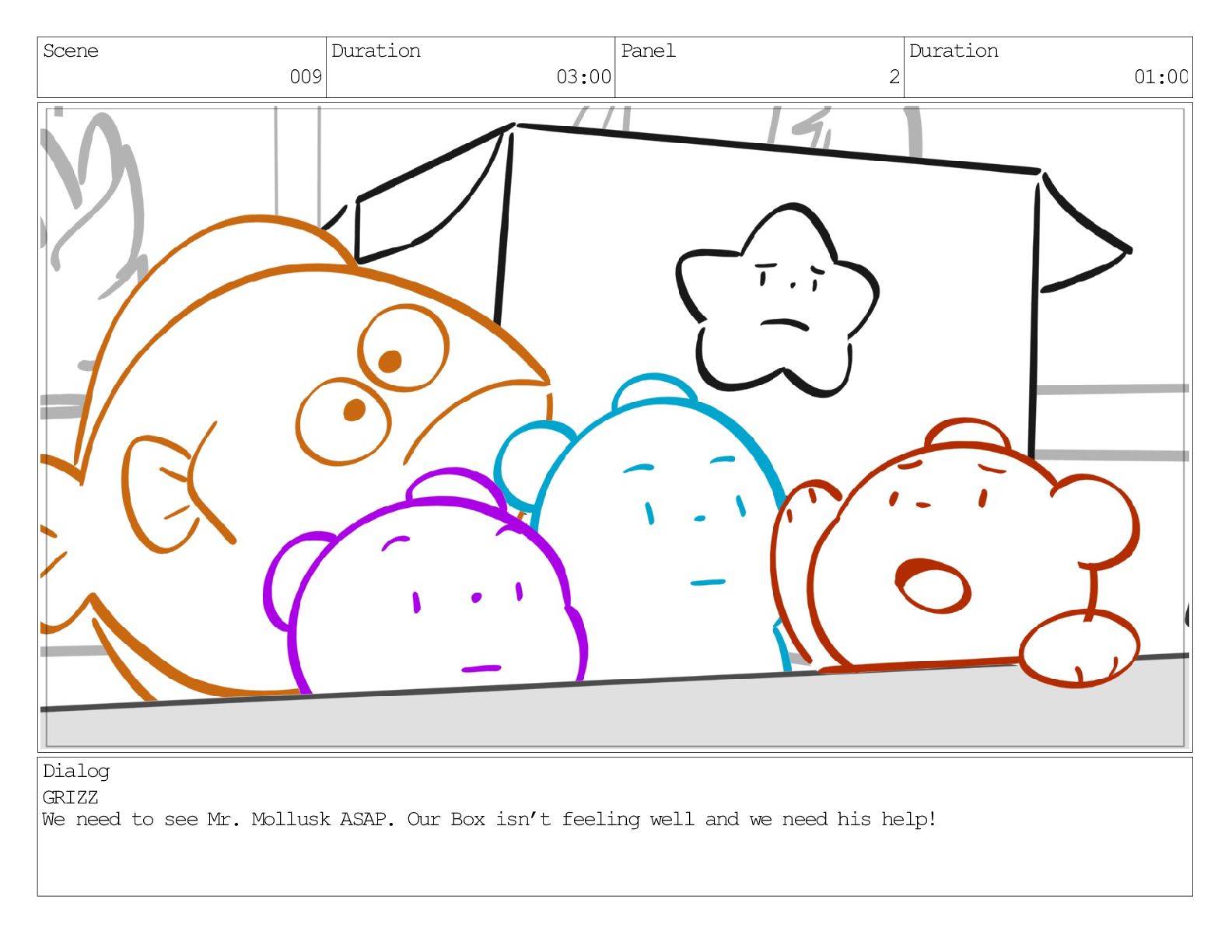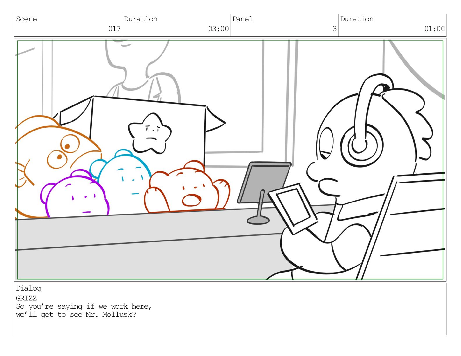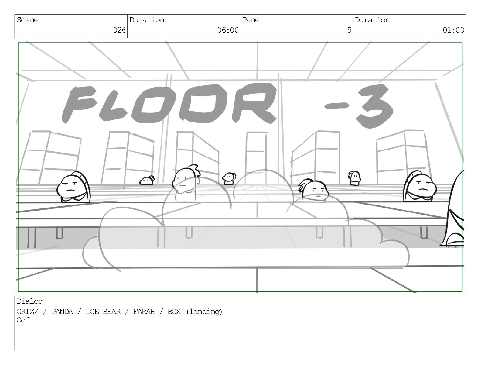 Scene 101 Duration 05:00 Panel 2 Duration 01:00 Dialog GRIZZ