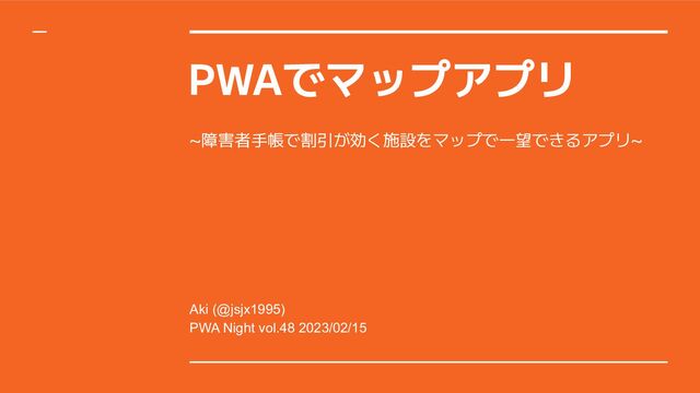 PWAでマップアプリ Aki (@jsjx1995) PWA Night vol.48 2023/02/15 ~障害者手帳で割引が効く施設をマップで一望できるアプリ~