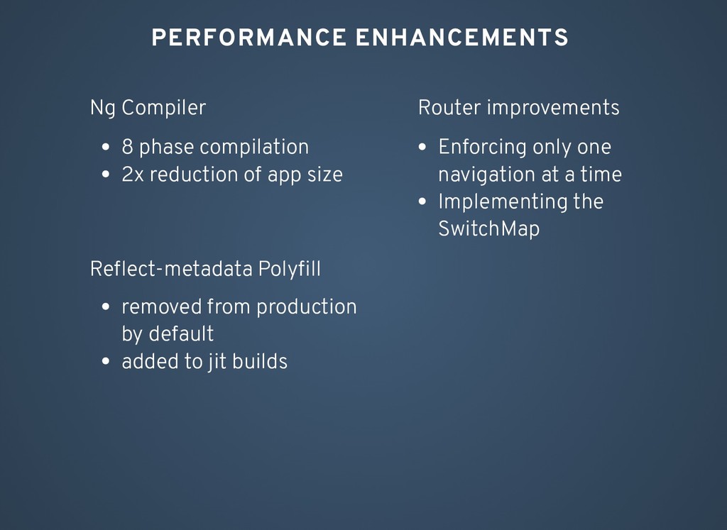 PERFORMANCE ENHANCEMENTS PERFORMANCE ENHANCEMENTS Reflect-metadata Polyfill removed from production by default added to jit builds Router improvements Enforcing only one navigation at a time Implementing the SwitchMap