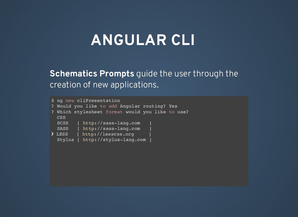 applications. ANGULAR CLI ANGULAR CLI $ ng new cliPresentation ? Would you like to add Angular routing? Yes ? Which stylesheet format would you like to use? CSS SCSS [ http://sass-lang.com ] SASS [ http://sass-lang.com ] ❯ LESS [ http://lesscss.org ] Stylus [ http://stylus-lang.com ]