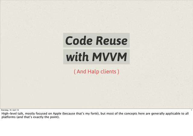 automation required ✓ View models can do model-like things (e.g., serialization) 9 Dienstag, 16. April 13 Traditionally, view controllers rarely get unit tested in Cocoa, simply because it’s such a pain to write a controller that doesn’t depend on having a view (or, alternatively, to set up a valid view in unit tests). Since the VM doesn’t even know about view objects, they can be tested without a GUI at all! Serialization: for example, to save and restore the state of your UI, you can just save and restore your VM hierarchy. Doing this in MVC would require a separate set of “view state” objects – which are basically view models anyways!