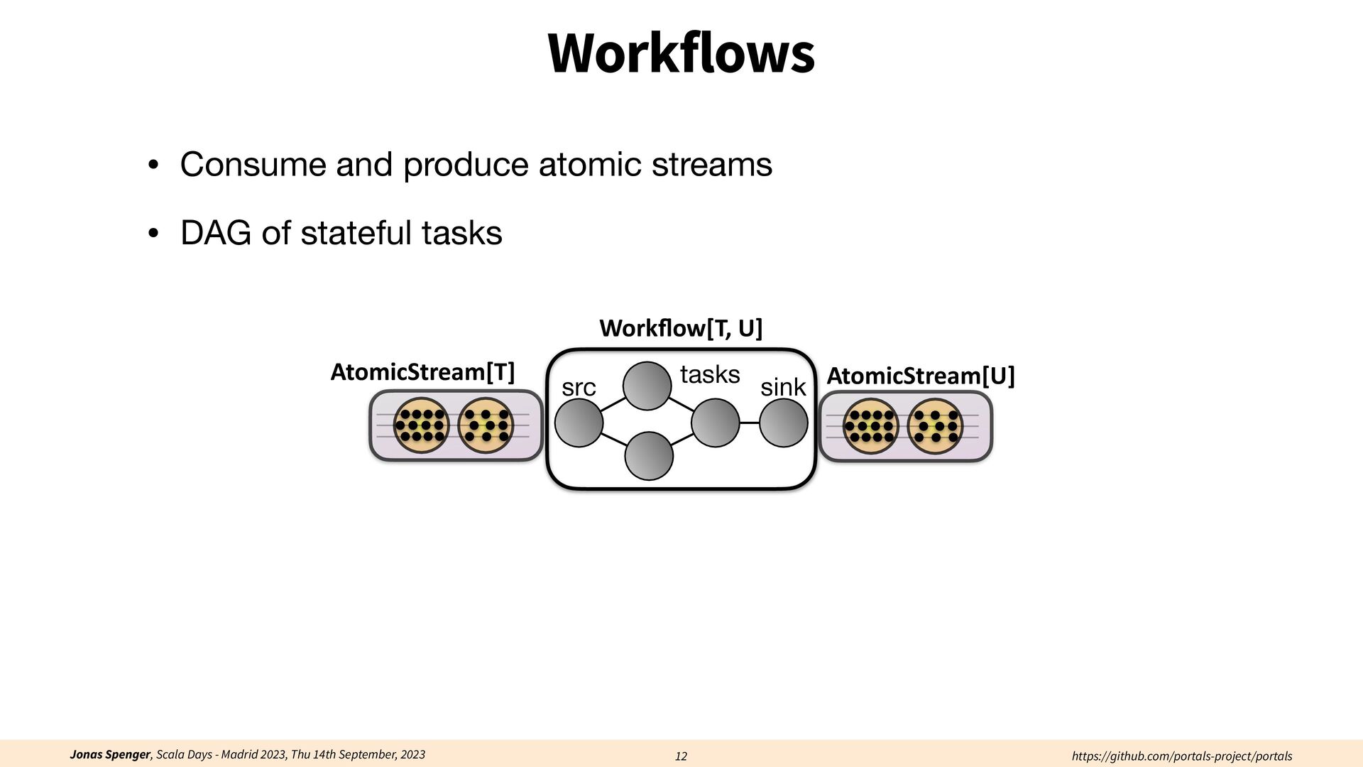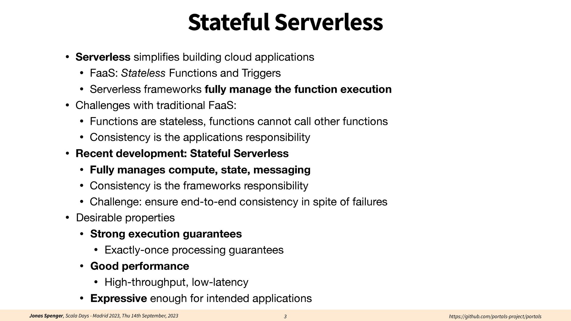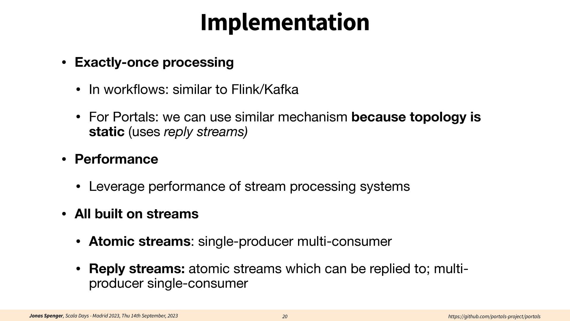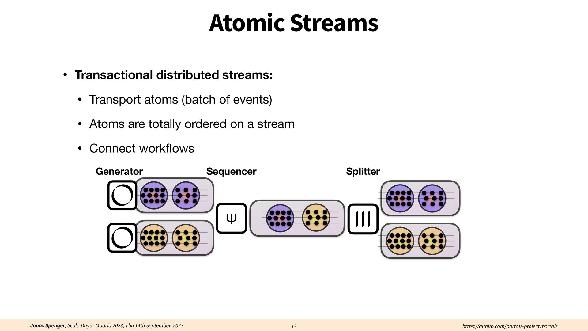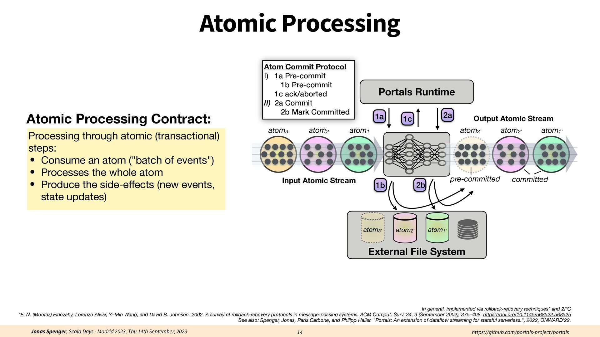 See also: Spenger, Jonas, Paris Carbone, and Philipp Haller. "Portals: An extension of data fl ow streaming for stateful serverless.", 2022, ONWARD'22. Processing through atomic (transactional) steps: • Consume an atom ("batch of events") • Processes the whole atom • Produce the side-e ff ects (new events, state updates) Atomic Processing Contract: