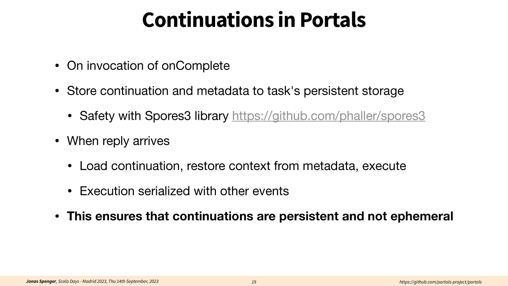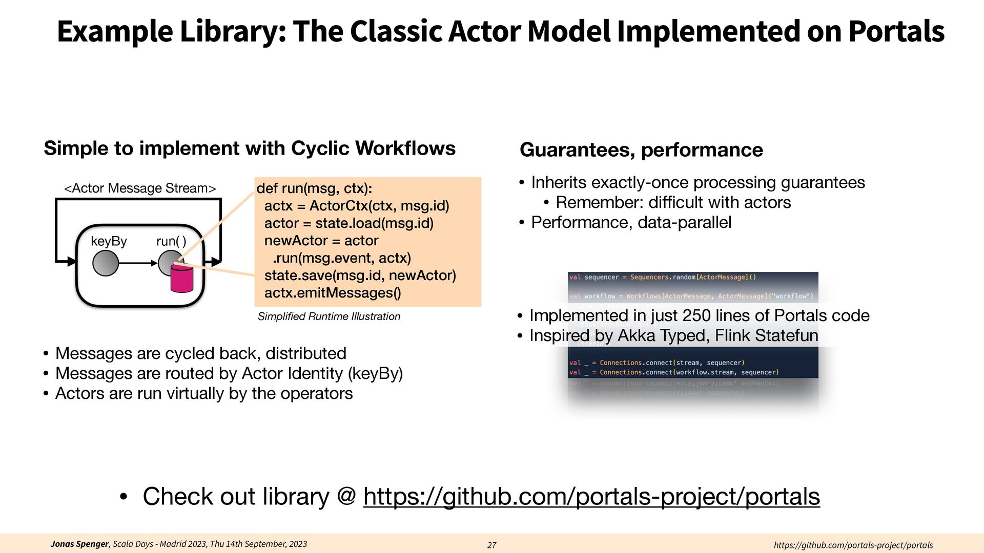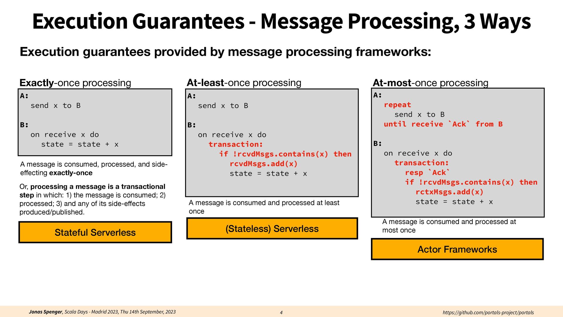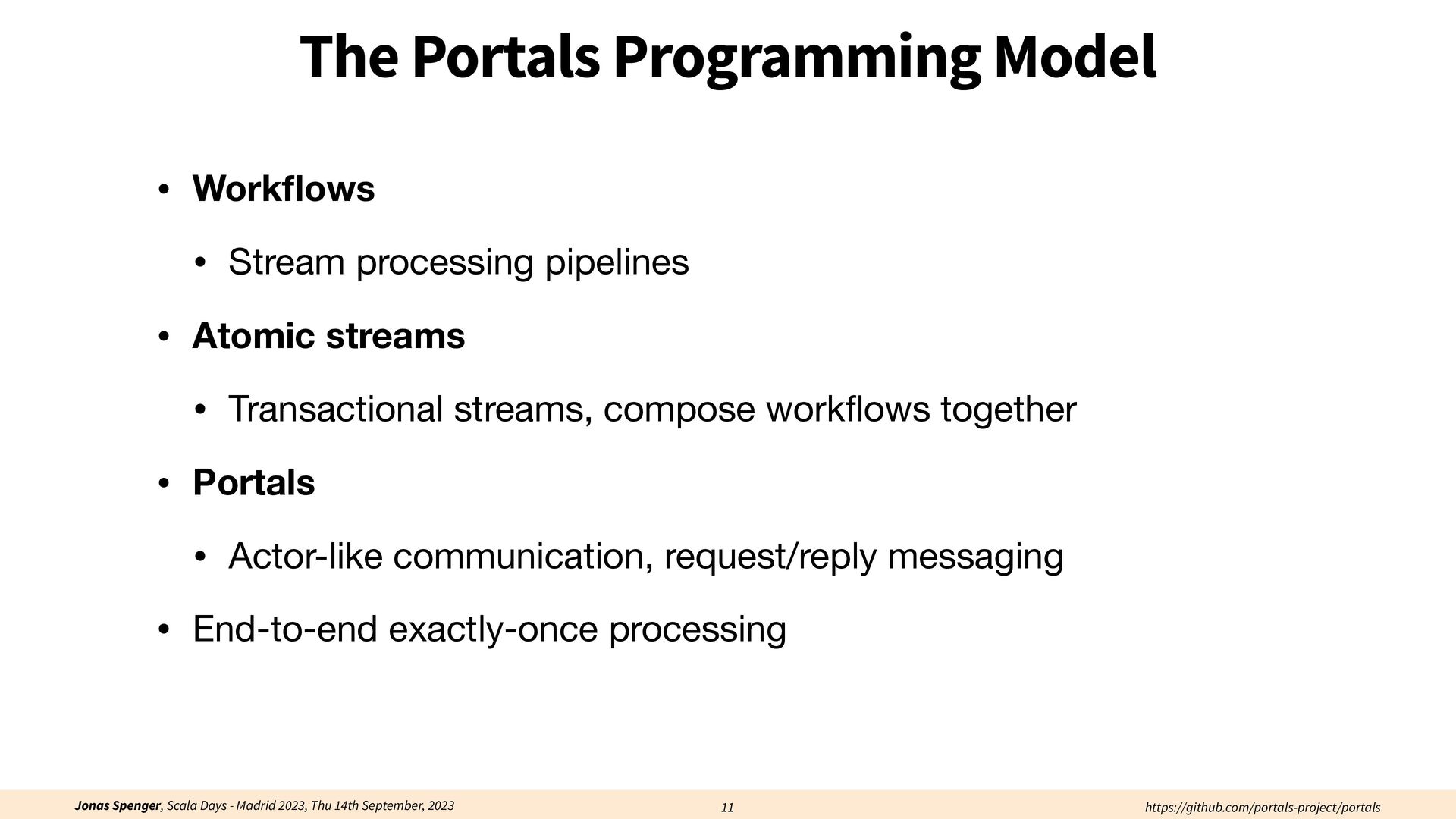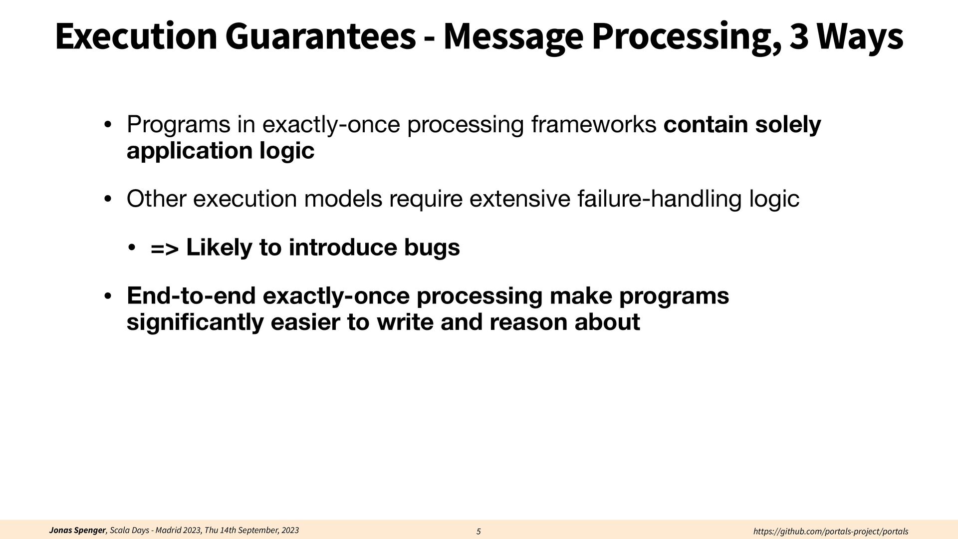 See also: Spenger, Jonas, Paris Carbone, and Philipp Haller. "Portals: An extension of data fl ow streaming for stateful serverless.", 2022, ONWARD'22. Processing through atomic (transactional) steps: • Consume an atom ("batch of events") • Processes the whole atom • Produce the side-e ff ects (new events, state updates) Atomic Processing Contract: