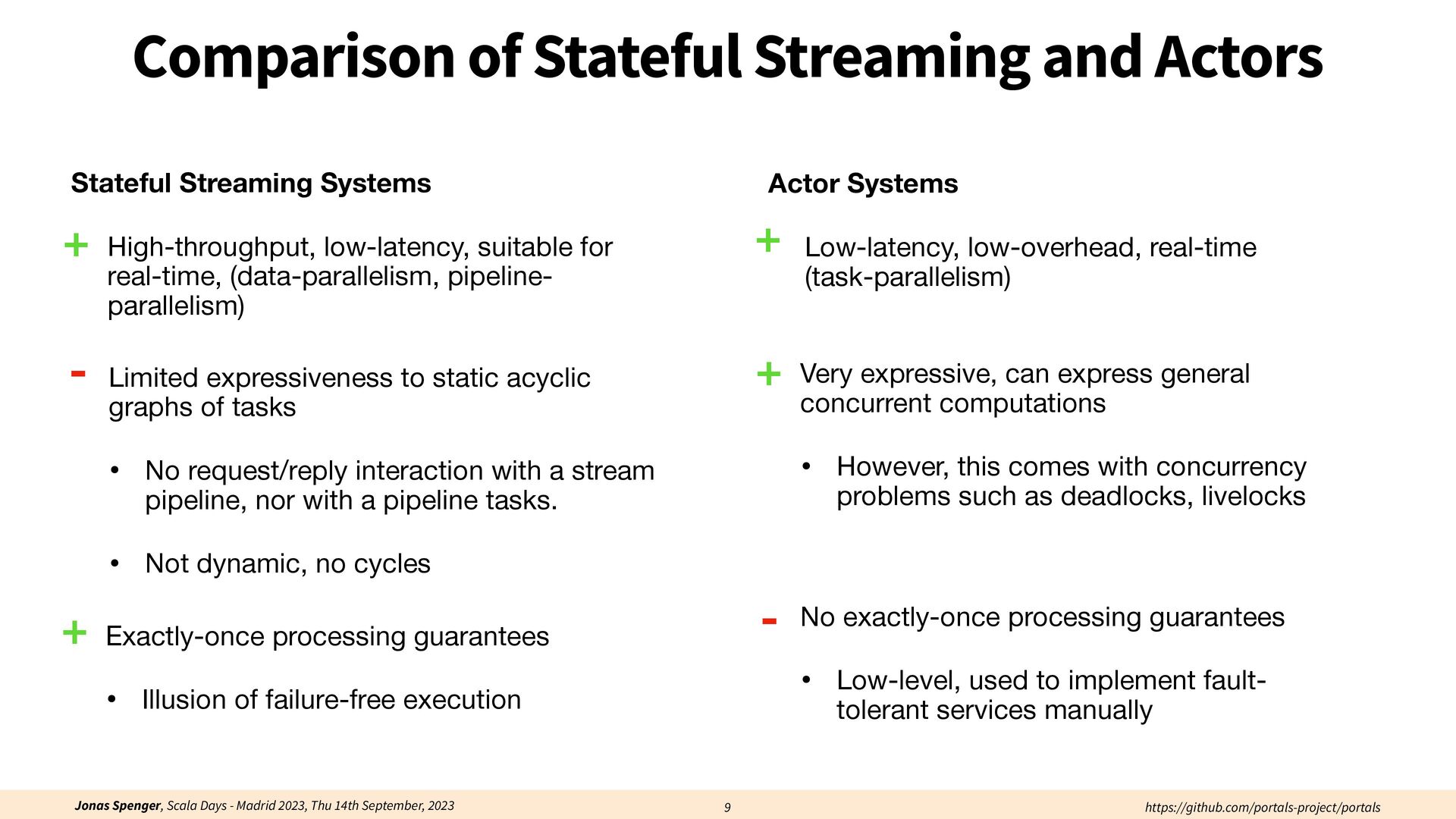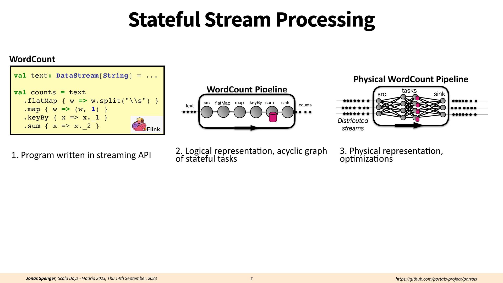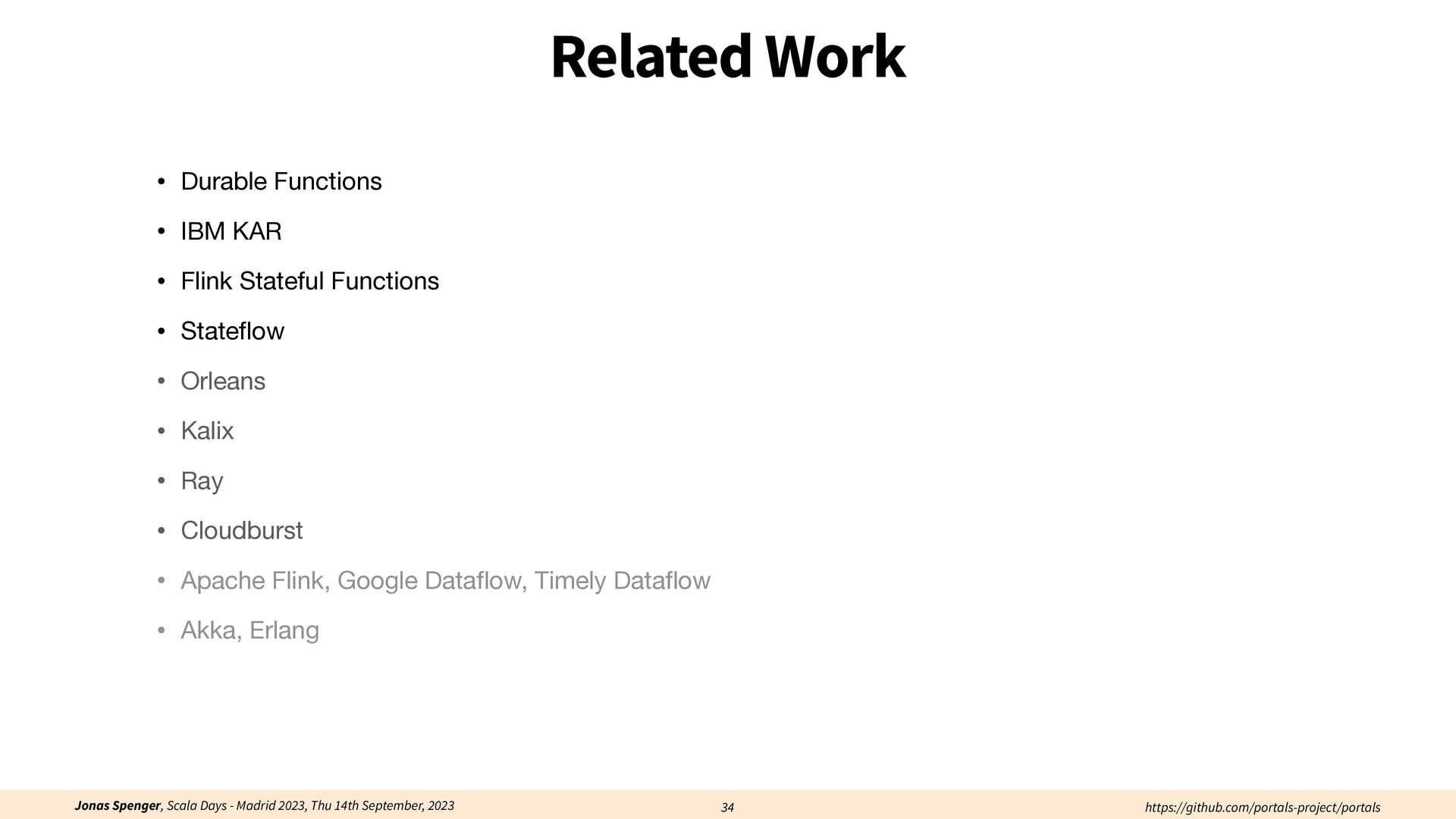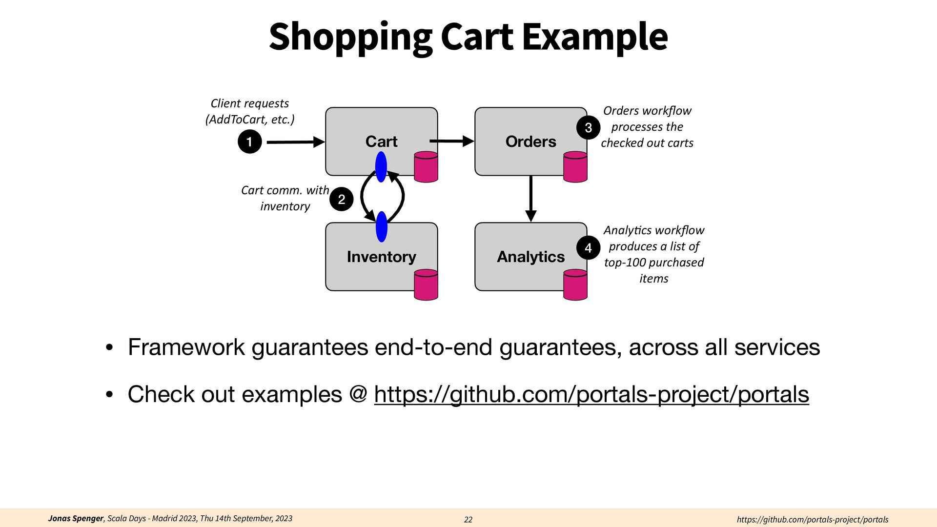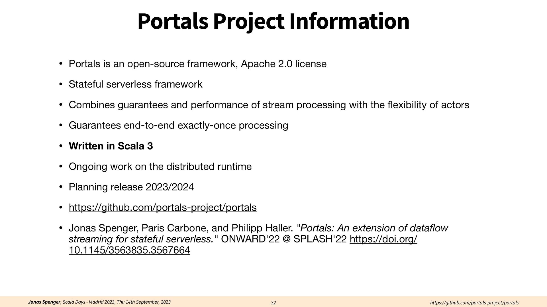 See also: Spenger, Jonas, Paris Carbone, and Philipp Haller. "Portals: An extension of data fl ow streaming for stateful serverless.", 2022, ONWARD'22. Processing through atomic (transactional) steps: • Consume an atom ("batch of events") • Processes the whole atom • Produce the side-e ff ects (new events, state updates) Atomic Processing Contract: