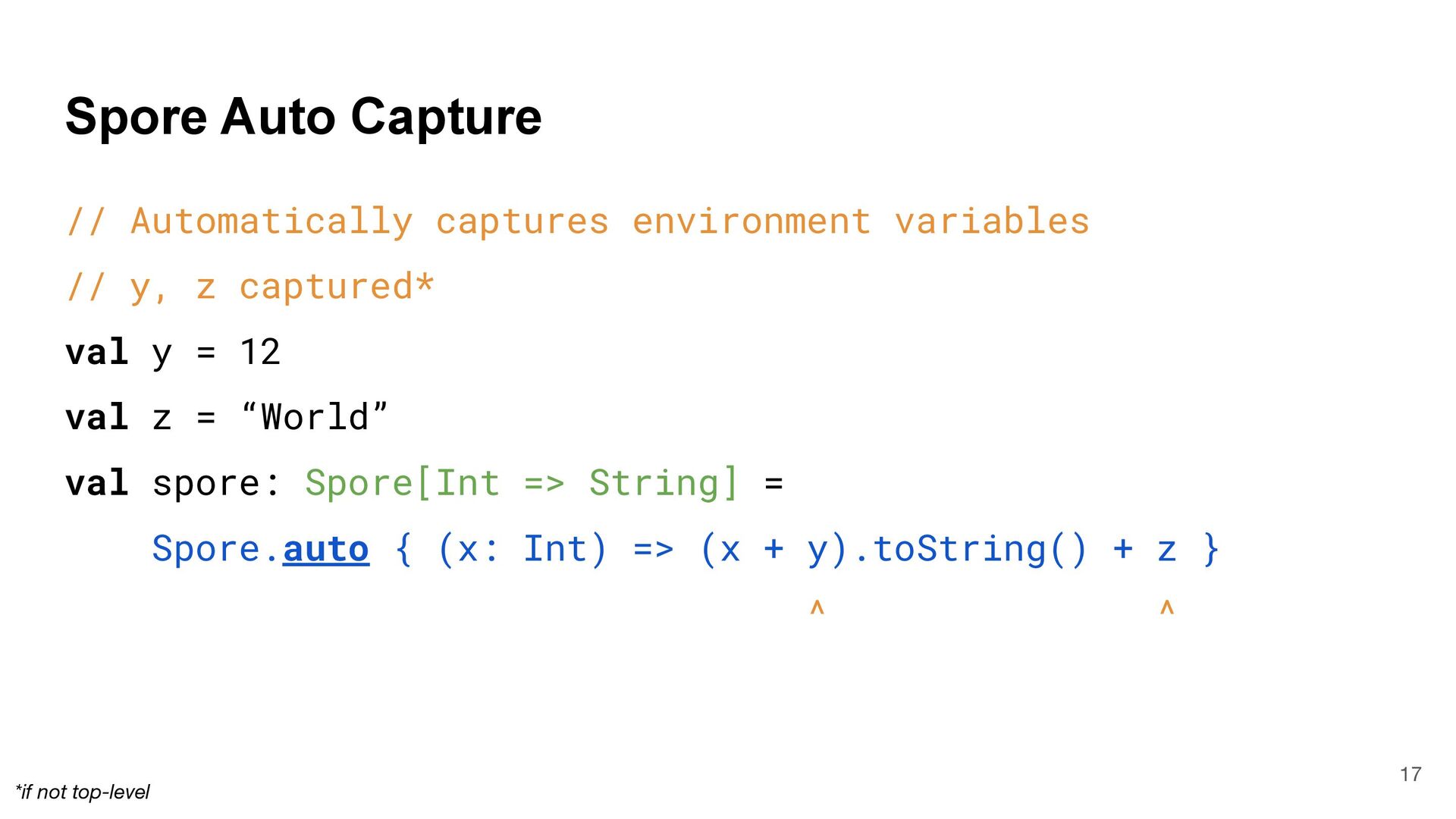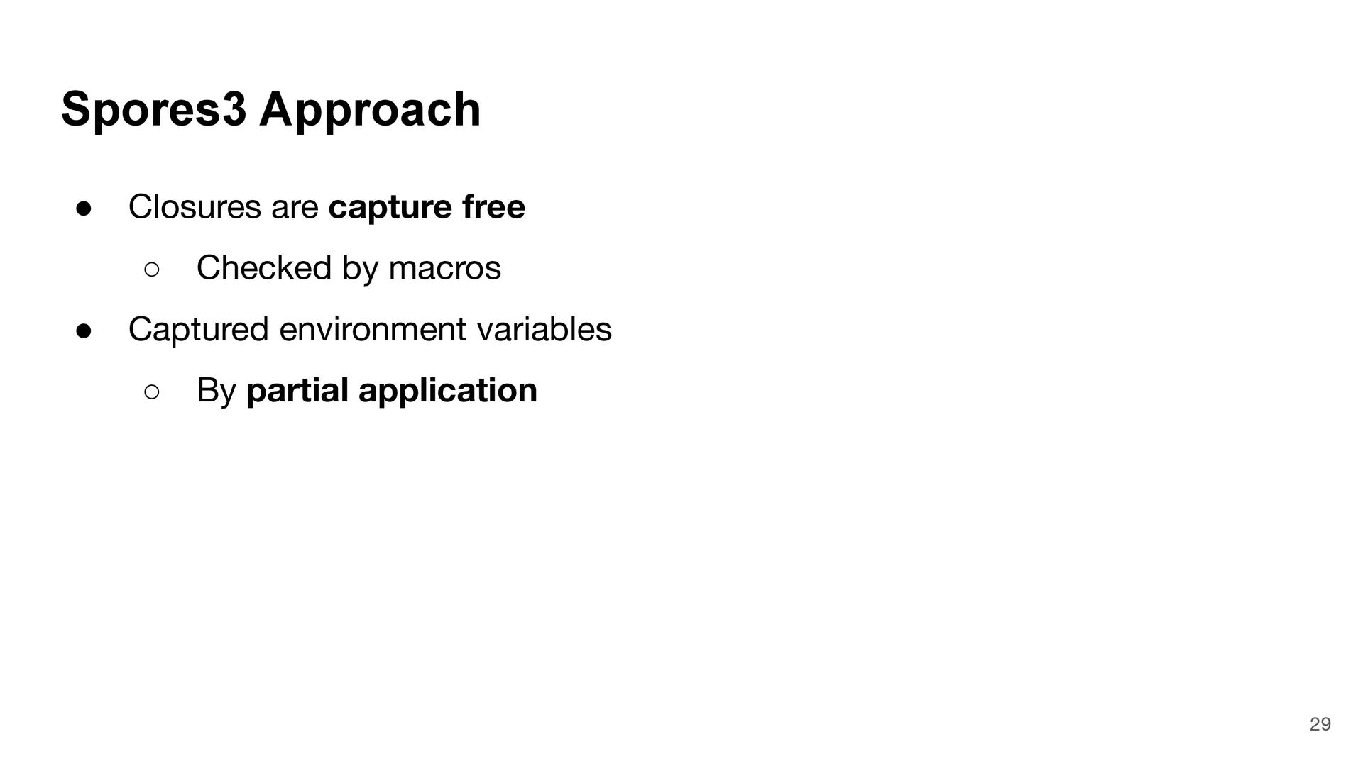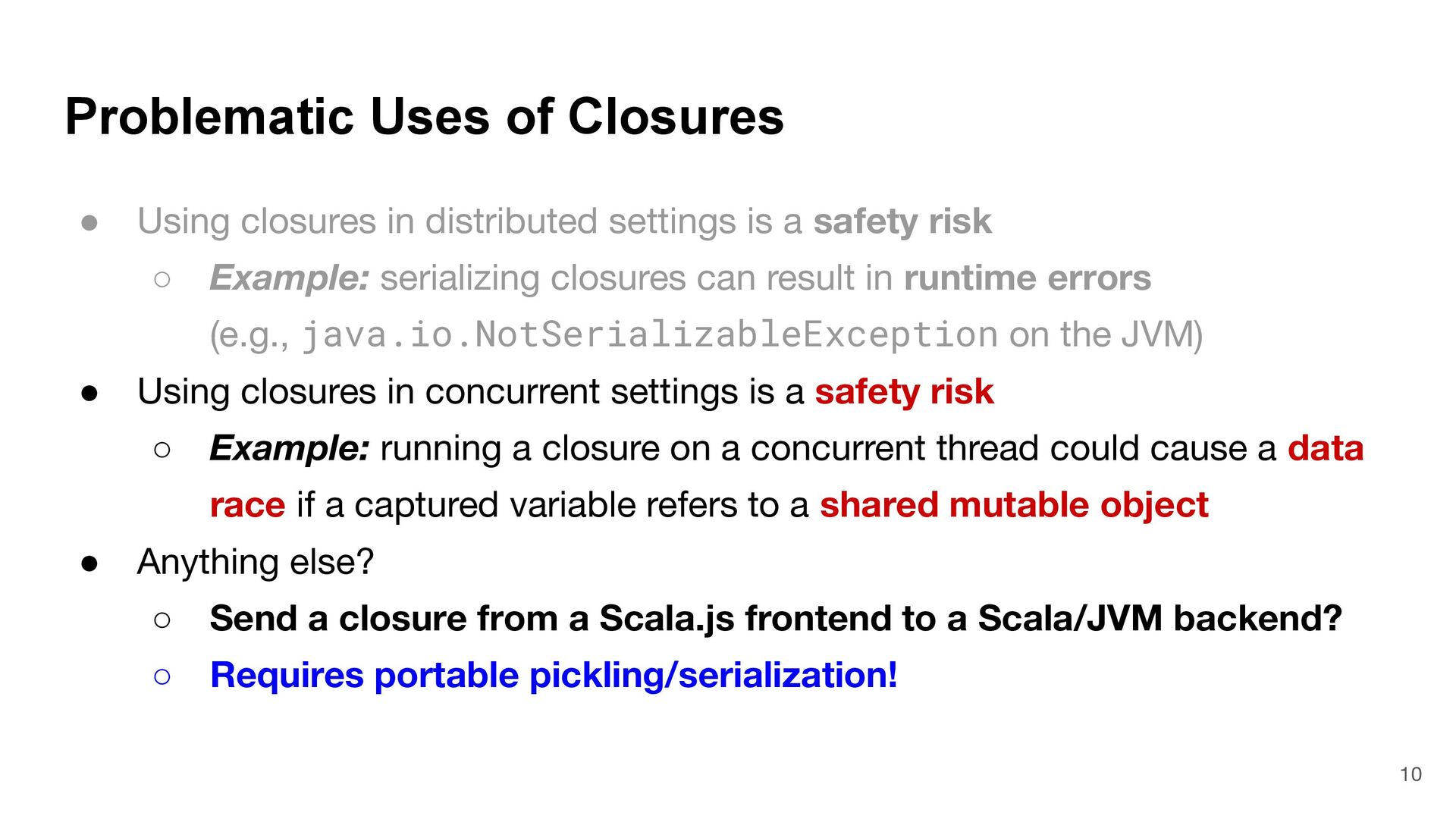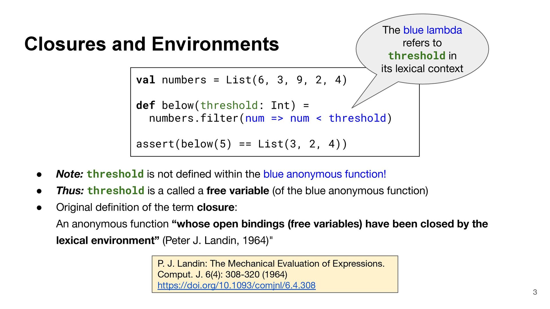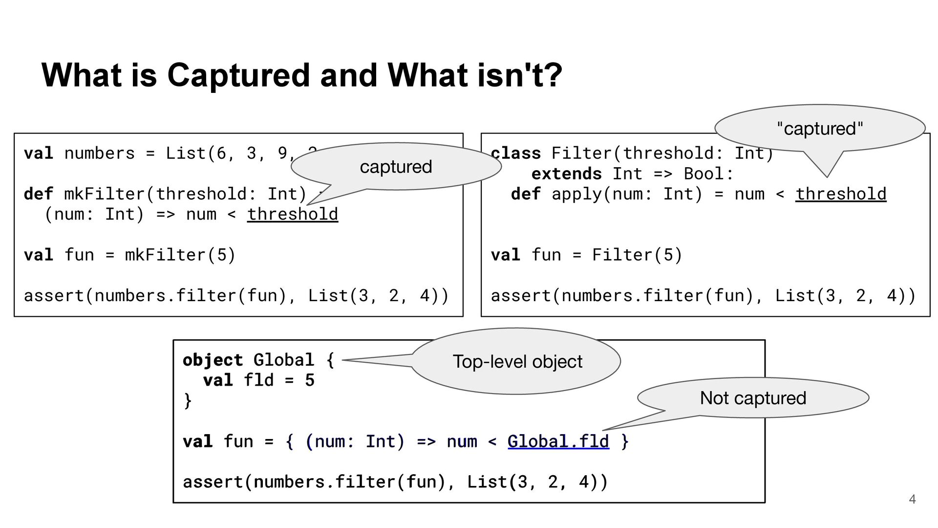 = { (num: Int) => num < Global.fld } assert(numbers.filter(fun), List(3, 2, 4)) What is Captured and What isn't? 4 object Global { val fld = 5 } val fun = { (num: Int) => num < Global.fld } assert(numbers.filter(fun), List(3, 2, 4)) val numbers = List(6, 3, 9, 2, 4) def mkFilter(threshold: Int) = (num: Int) => num < threshold val fun = mkFilter(5) assert(numbers.filter(fun), List(3, 2, 4)) class Filter(threshold: Int) extends Int => Bool: def apply(num: Int) = num < threshold val fun = Filter(5) assert(numbers.filter(fun), List(3, 2, 4)) Top-level object captured "captured" Not captured