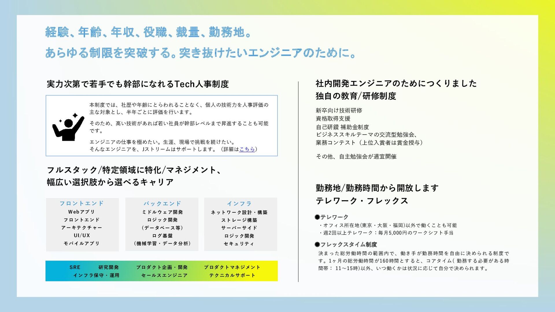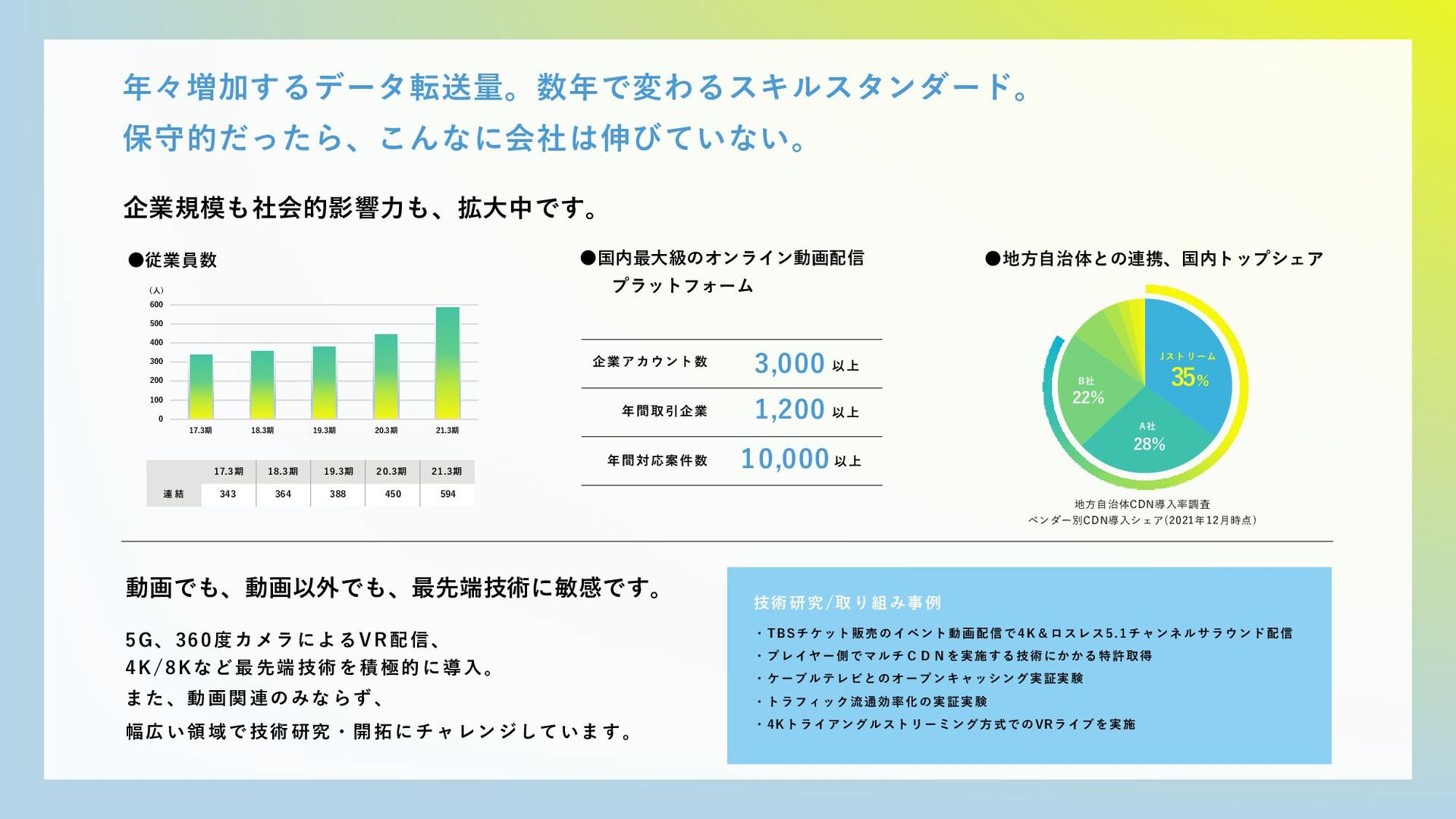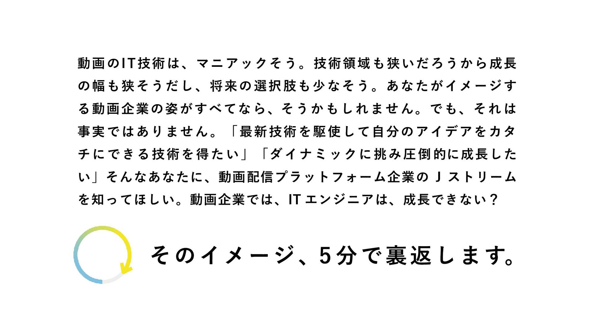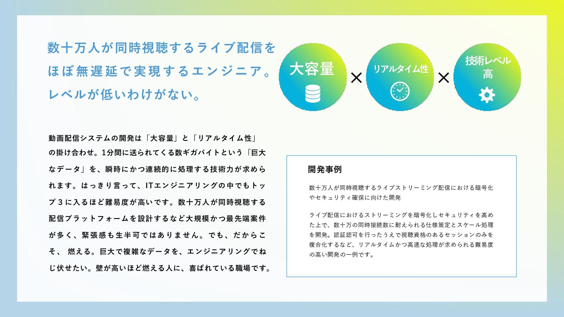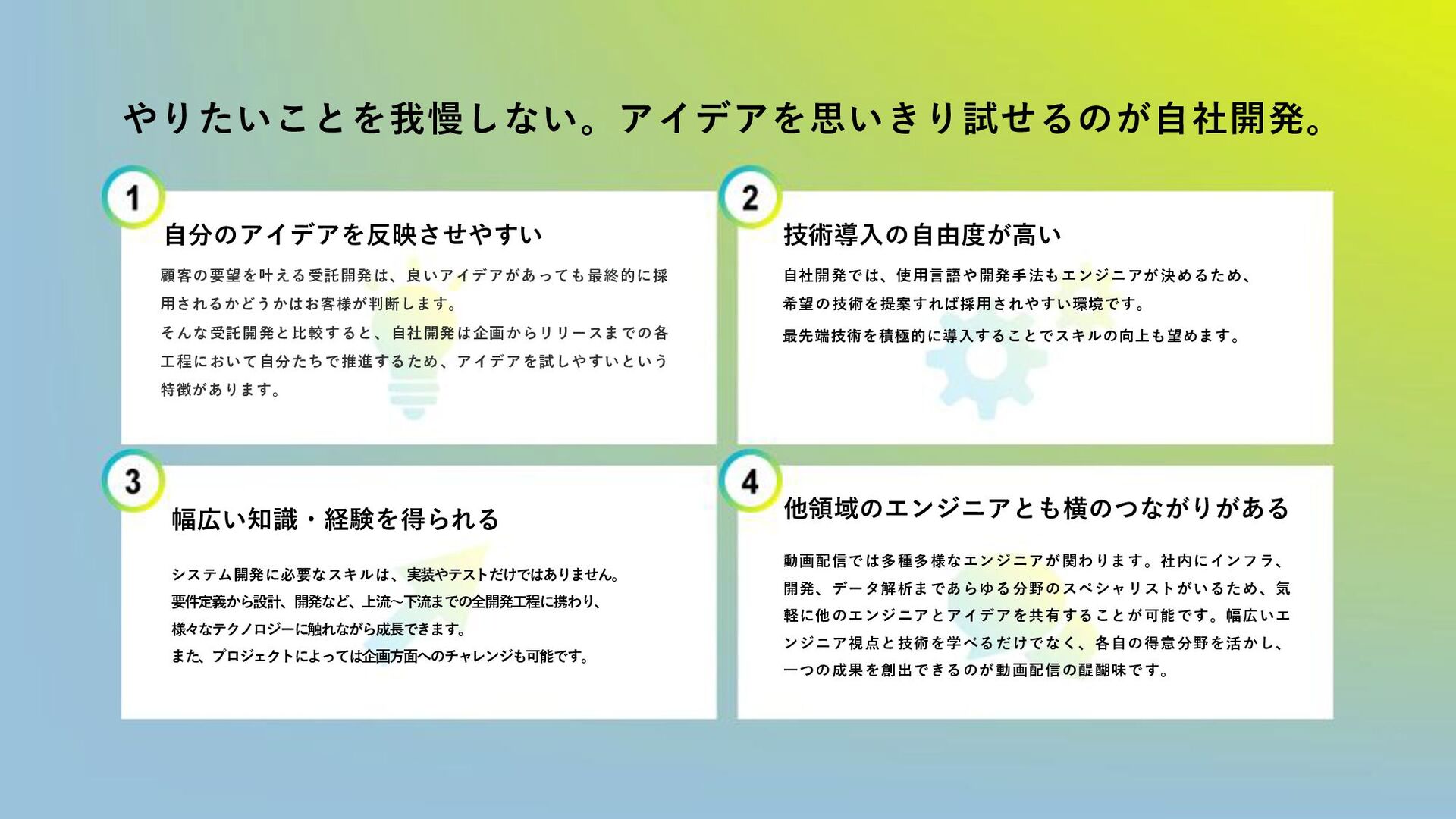 TypeScript, Python, Golang, Java FW:React, Next.js. Node.js, Laravel, Django, hls.js, dash.js ミドルウェア:Apache, Nginx, Wowza, MySQL, PostgreSQL NW環境:Linux, Windows, AWS, GCP, Kubernetes, Ansible, Hadoop 開発環境:Gitlab, Docker, Vagrant、DevOps、アジャイル開発 扱う技術の幅広さ 企画、開発、運用。全開発工程を経験できる。 参考書を読むだけでは身につかない、現場で通用する技術力を伸ばせます。 汎用性のある技術スタック 企画 立案・要件定義 開発 設計・開発・テスト・リリース 保守運用 技術例: WebやDBの開発から、HTML5やiOS/Androidのアプリケーション開発 Infrastructure as Codeをベースとしたコンテナやサーバによる分散設計 REST APIを用いたマイクロサービス、ステートレス、スケーラビリティ ネットワークやストレージ、統計や機械学習を用いた膨大なログ解析 など