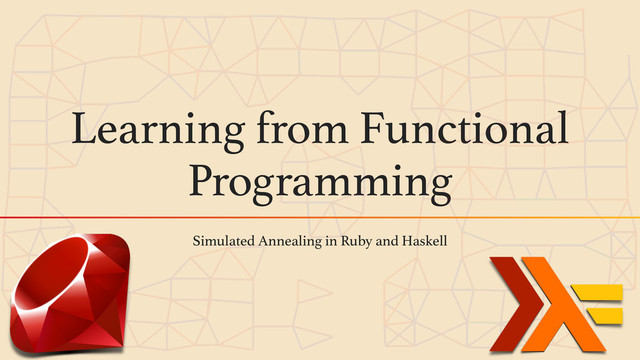 Haskell is a functional programming language that cleanly separates pure algorithms from messy real-world concerns. To learn how it ticks, I've translated an algorithm for Simulated Annealing from Haskell to Ruby. It also gave me an excuse to play with ruby-processing, a toolkit for graphics processing ;). Come learn about Functional Programming and how it can make your Ruby better!