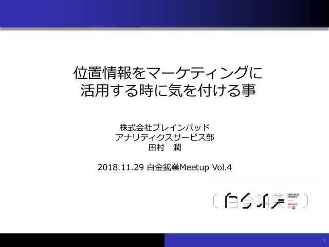 1 位置情報をマーケティングに 活用する時に気を付ける事 株式会社ブレインパッド アナリティクスサービス部 田村 潤 2018.11.29 白金鉱業Meetup Vol.4
