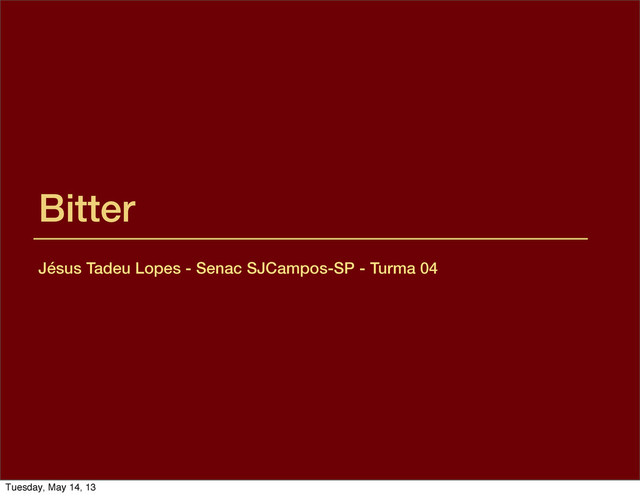 Turma 04 • Teor alcoólico • Qualidade dos ingredientes • Usam comercialmente nomes diferentes, mas são genericamente conhecidas por Bitter Tuesday, May 14, 13