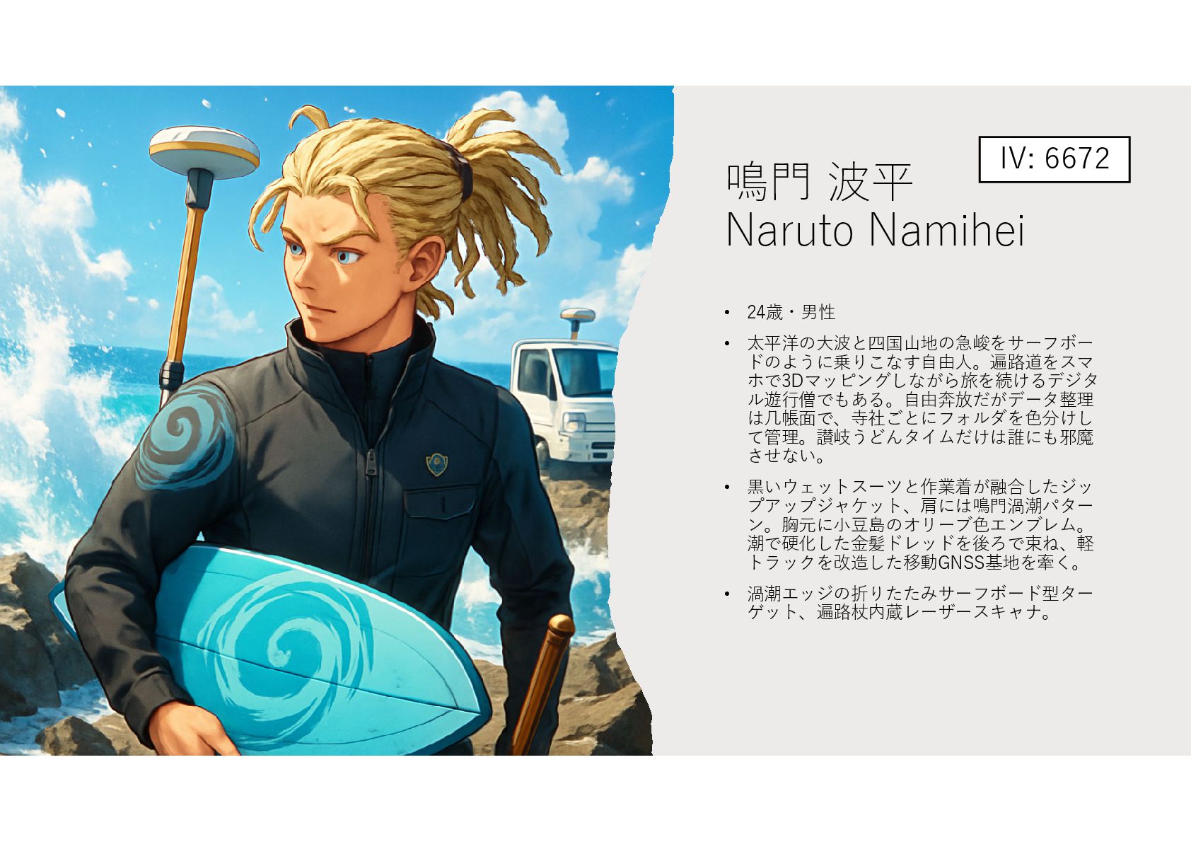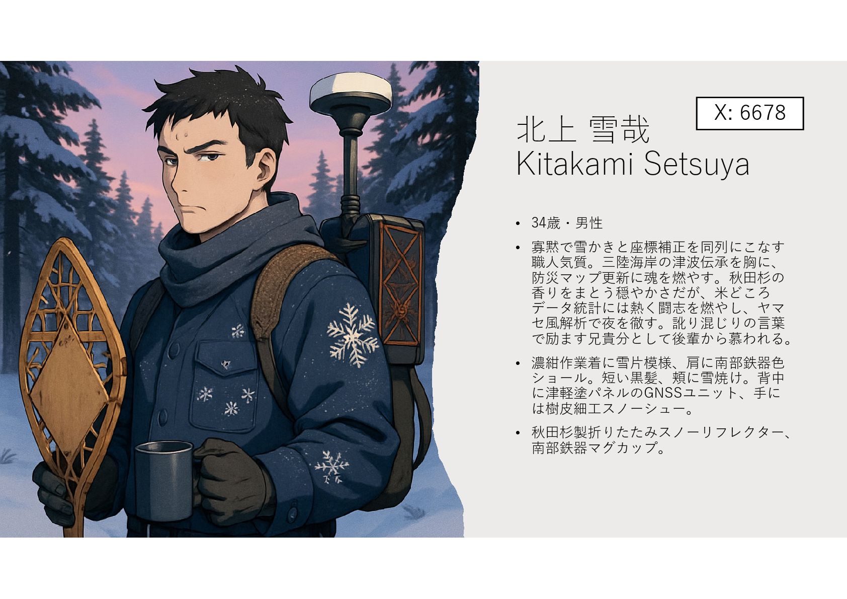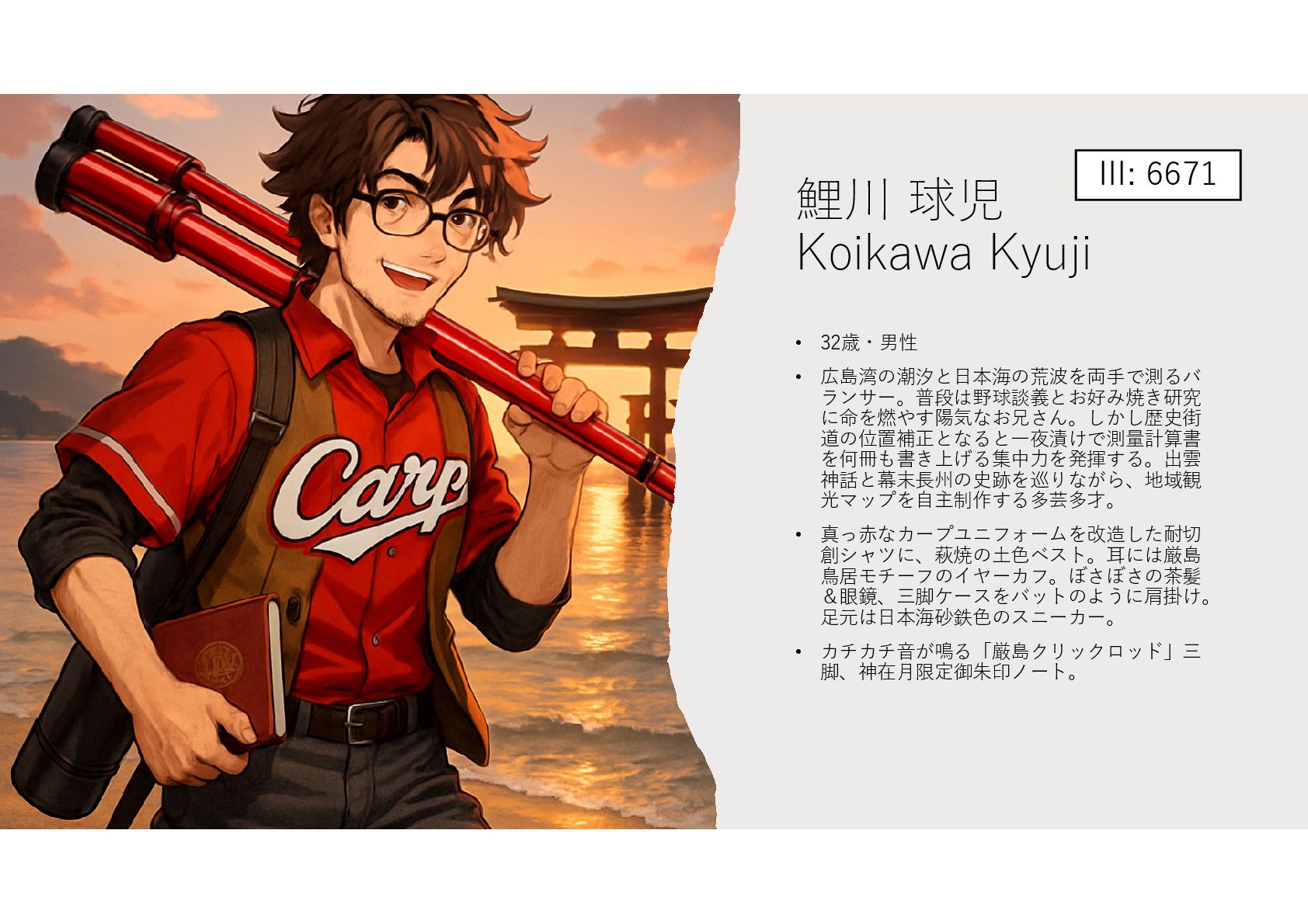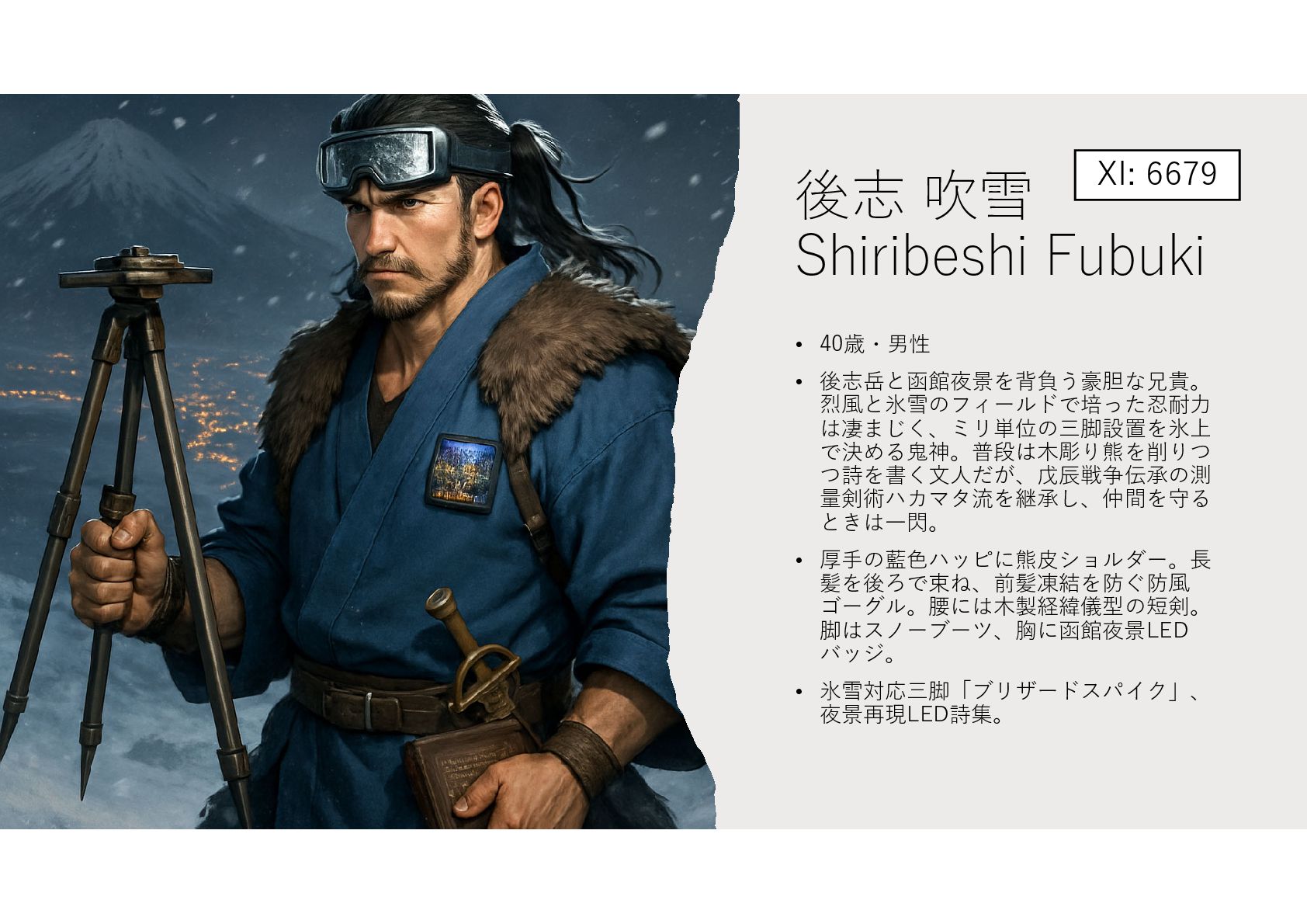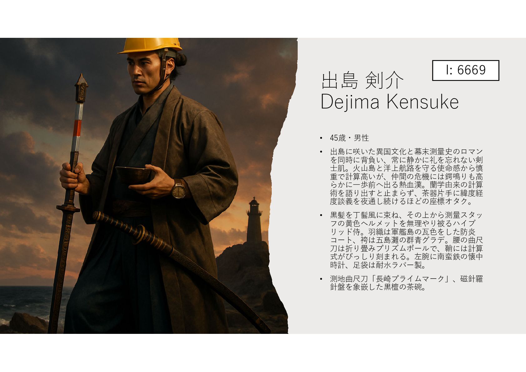 重で計算⾼いが、仲間の危機には鍔鳴りも⾼ らかに⼀歩前へ出る熱⾎漢。蘭学由来の計算 術を語り出すと⽌まらず、茶器⽚⼿に緯度経 度談義を夜通し続けるほどの座標オタク。 • ⿊髪を丁髷⾵に束ね、その上から測量スタッ フの⻩⾊ヘルメットを無理やり被るハイブ リッド侍。⽻織は軍艦島の⽡⾊をした防炎 コート、袴は五島灘の群⻘グラデ。腰の曲尺 ⼑は折り畳みプリズムポールで、鞘には計算 式がびっしり刻まれる。左腕に南蛮鉄の懐中 時計、⾜袋は耐⽔ラバー製。 • 測地曲尺⼑「⻑崎プライムマーク」、磁針羅 針盤を象嵌した⿊檀の茶碗。 I: 6669
