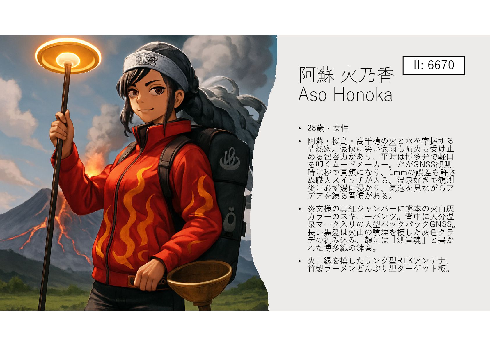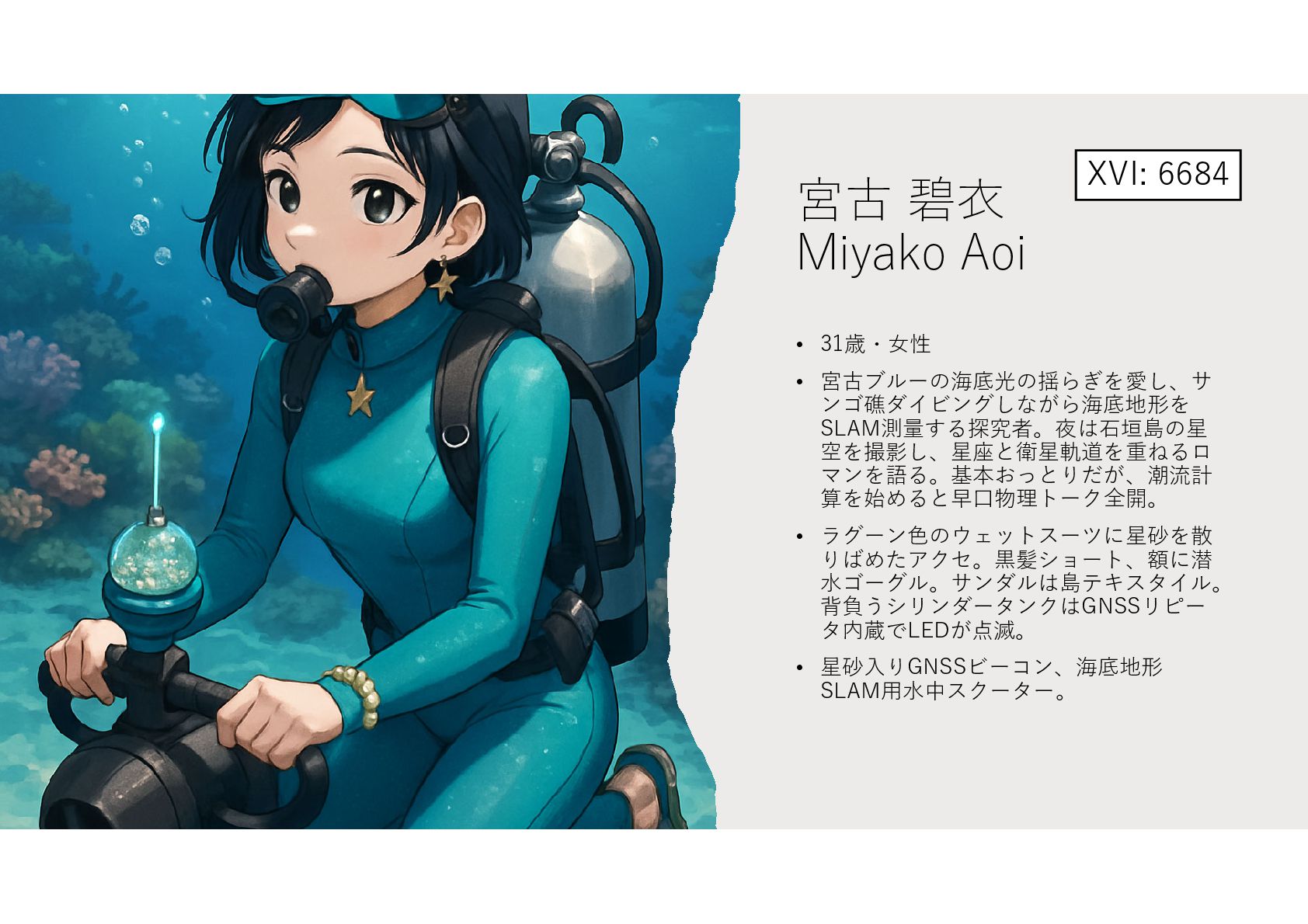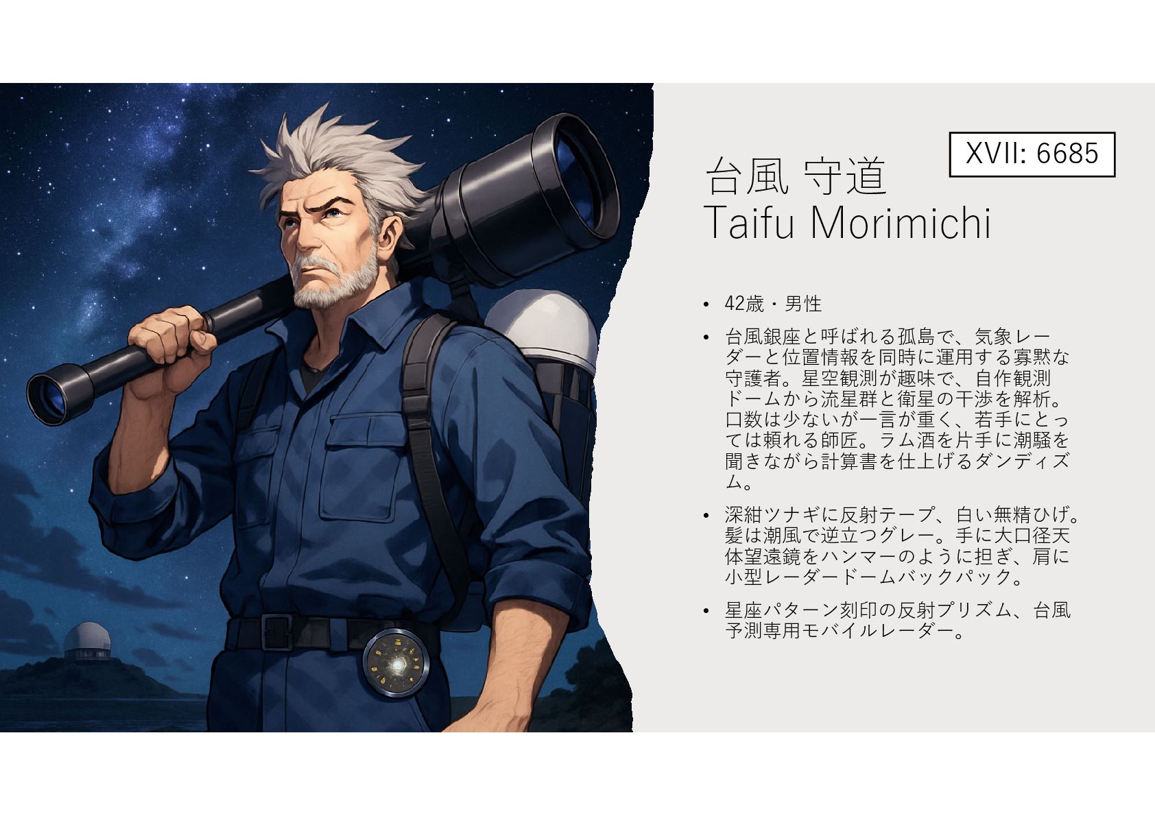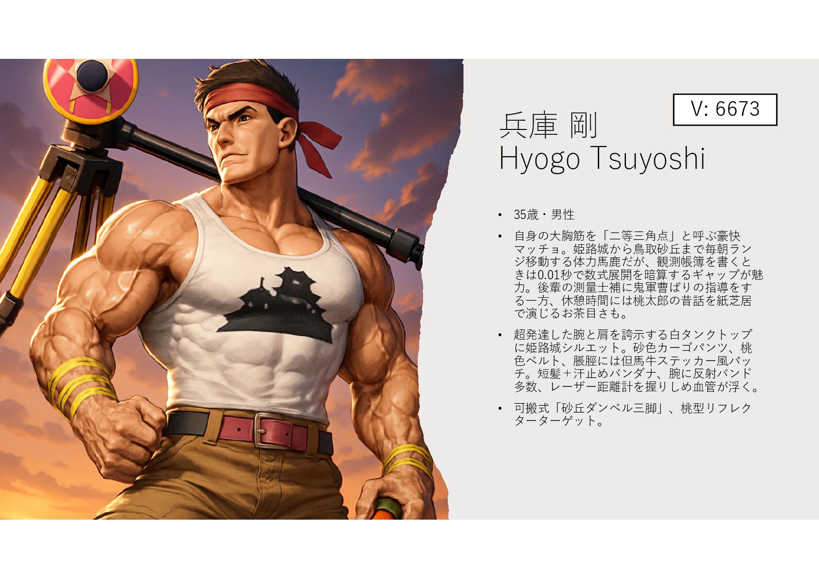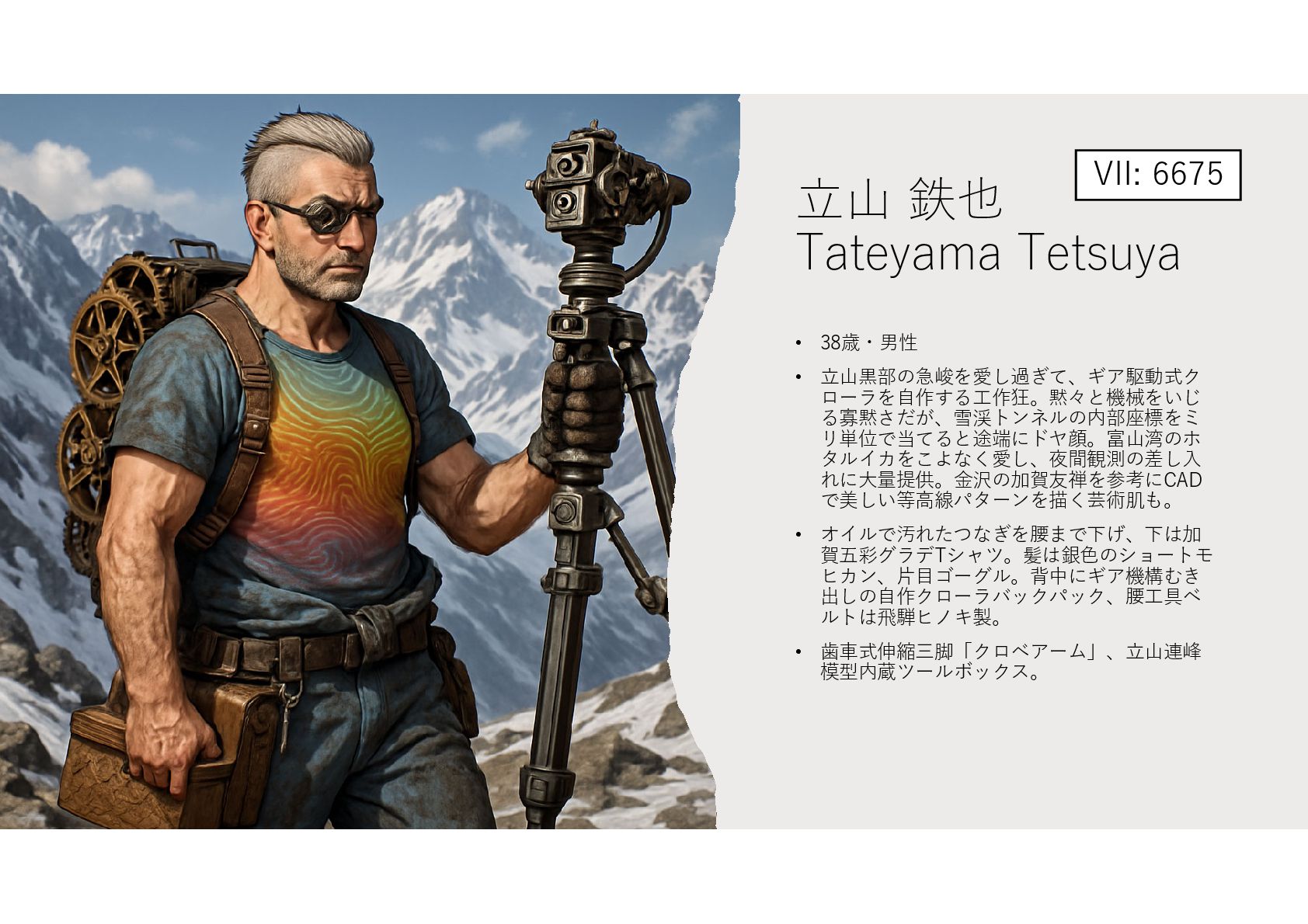 重で計算⾼いが、仲間の危機には鍔鳴りも⾼ らかに⼀歩前へ出る熱⾎漢。蘭学由来の計算 術を語り出すと⽌まらず、茶器⽚⼿に緯度経 度談義を夜通し続けるほどの座標オタク。 • ⿊髪を丁髷⾵に束ね、その上から測量スタッ フの⻩⾊ヘルメットを無理やり被るハイブ リッド侍。⽻織は軍艦島の⽡⾊をした防炎 コート、袴は五島灘の群⻘グラデ。腰の曲尺 ⼑は折り畳みプリズムポールで、鞘には計算 式がびっしり刻まれる。左腕に南蛮鉄の懐中 時計、⾜袋は耐⽔ラバー製。 • 測地曲尺⼑「⻑崎プライムマーク」、磁針羅 針盤を象嵌した⿊檀の茶碗。 I: 6669