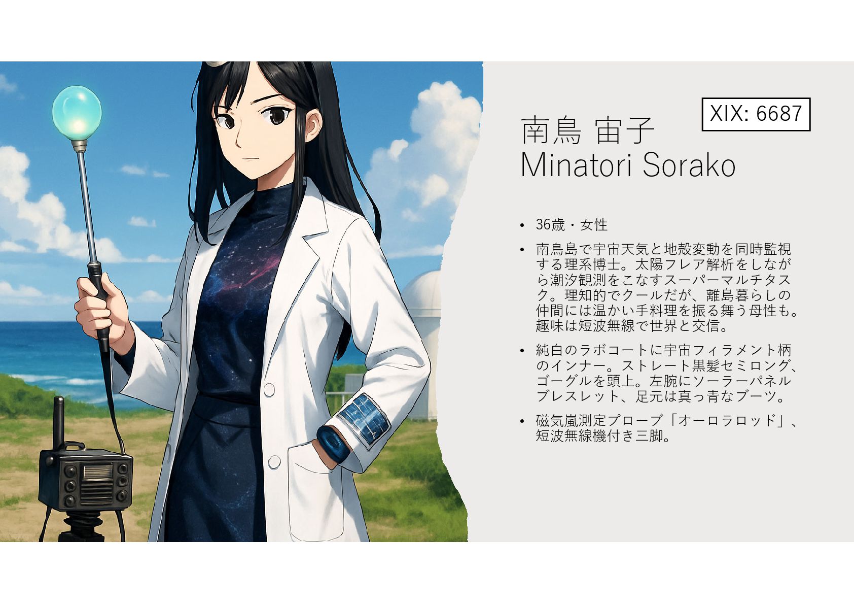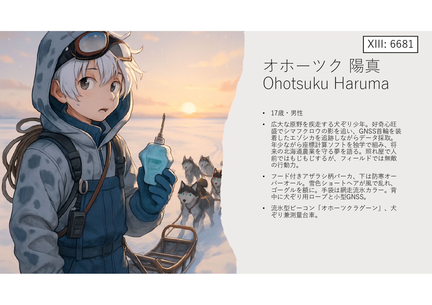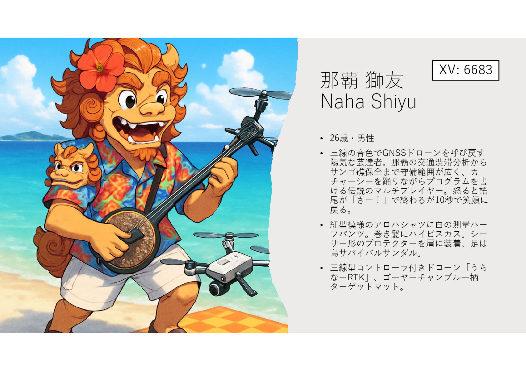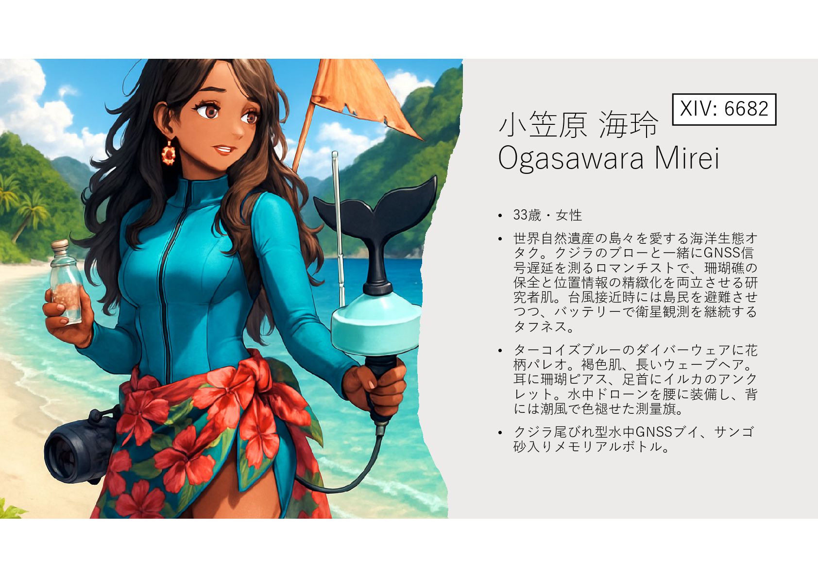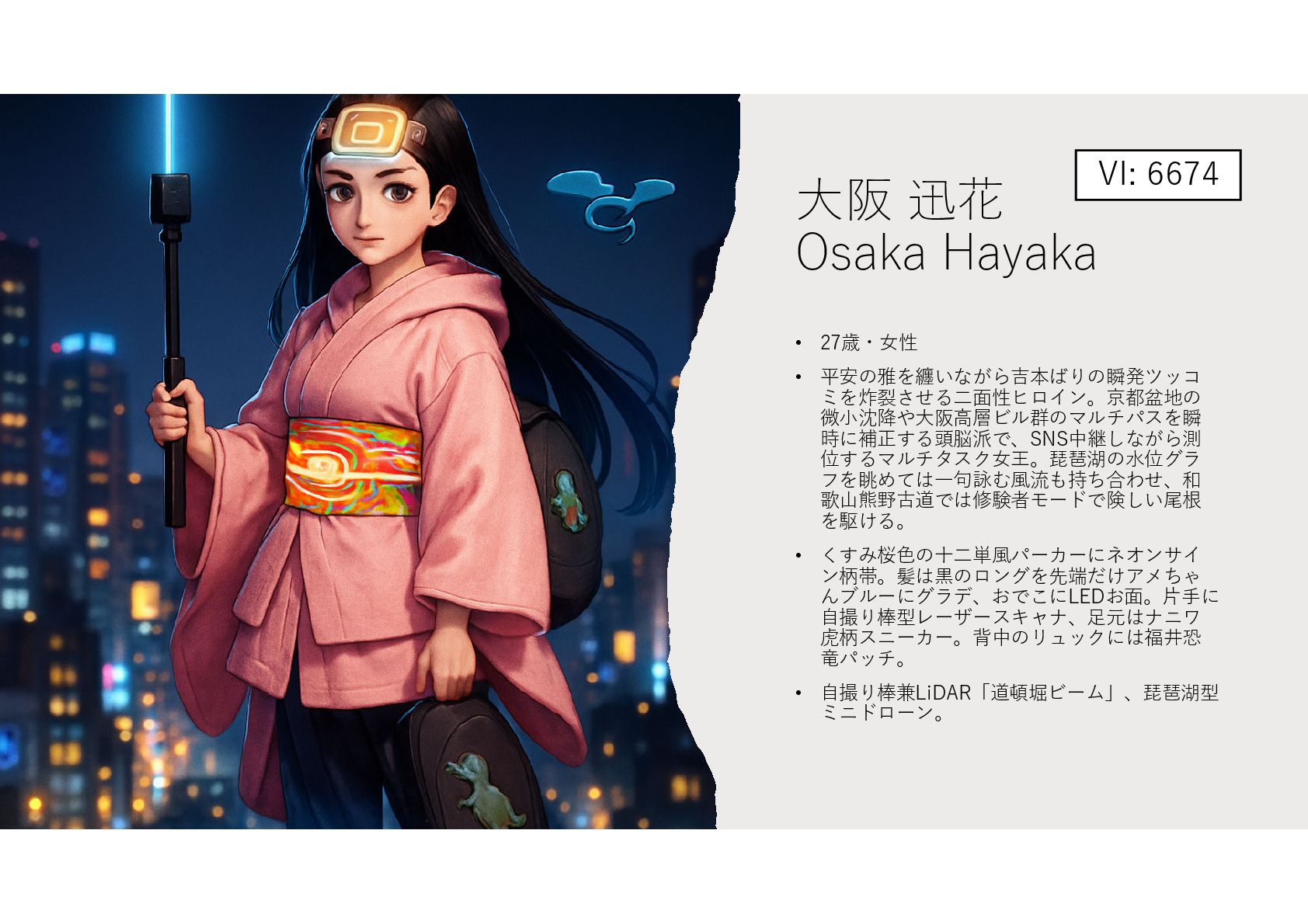 重で計算⾼いが、仲間の危機には鍔鳴りも⾼ らかに⼀歩前へ出る熱⾎漢。蘭学由来の計算 術を語り出すと⽌まらず、茶器⽚⼿に緯度経 度談義を夜通し続けるほどの座標オタク。 • ⿊髪を丁髷⾵に束ね、その上から測量スタッ フの⻩⾊ヘルメットを無理やり被るハイブ リッド侍。⽻織は軍艦島の⽡⾊をした防炎 コート、袴は五島灘の群⻘グラデ。腰の曲尺 ⼑は折り畳みプリズムポールで、鞘には計算 式がびっしり刻まれる。左腕に南蛮鉄の懐中 時計、⾜袋は耐⽔ラバー製。 • 測地曲尺⼑「⻑崎プライムマーク」、磁針羅 針盤を象嵌した⿊檀の茶碗。 I: 6669