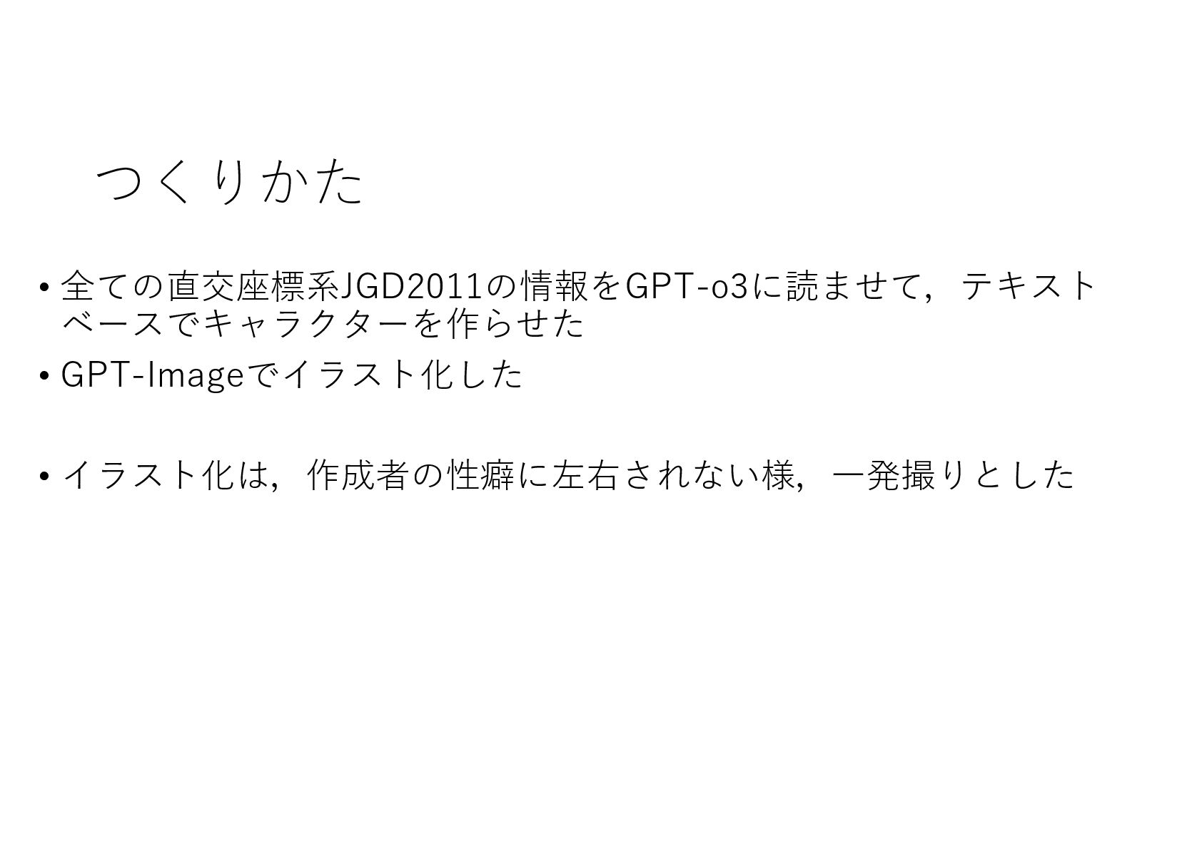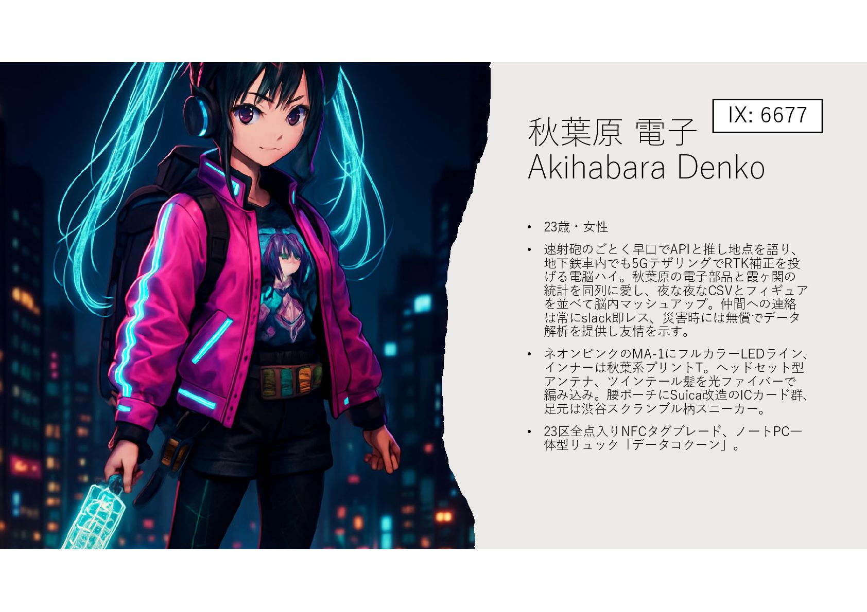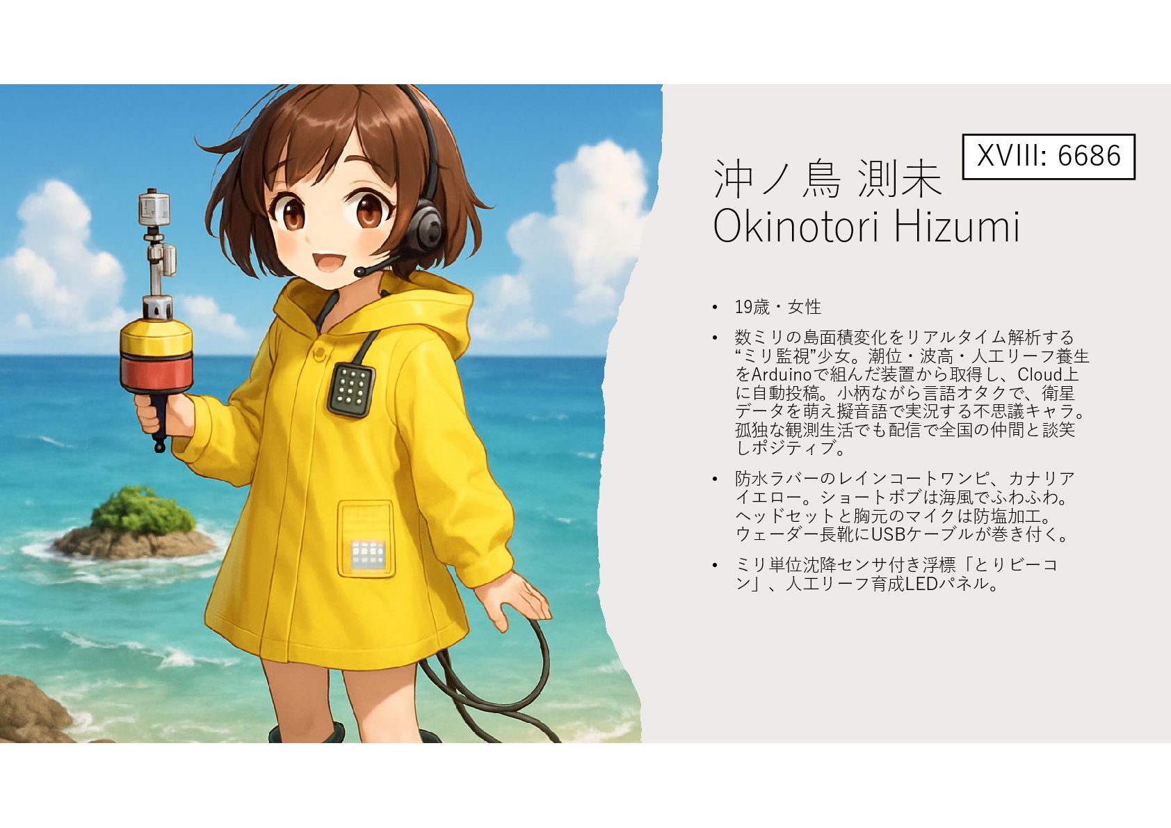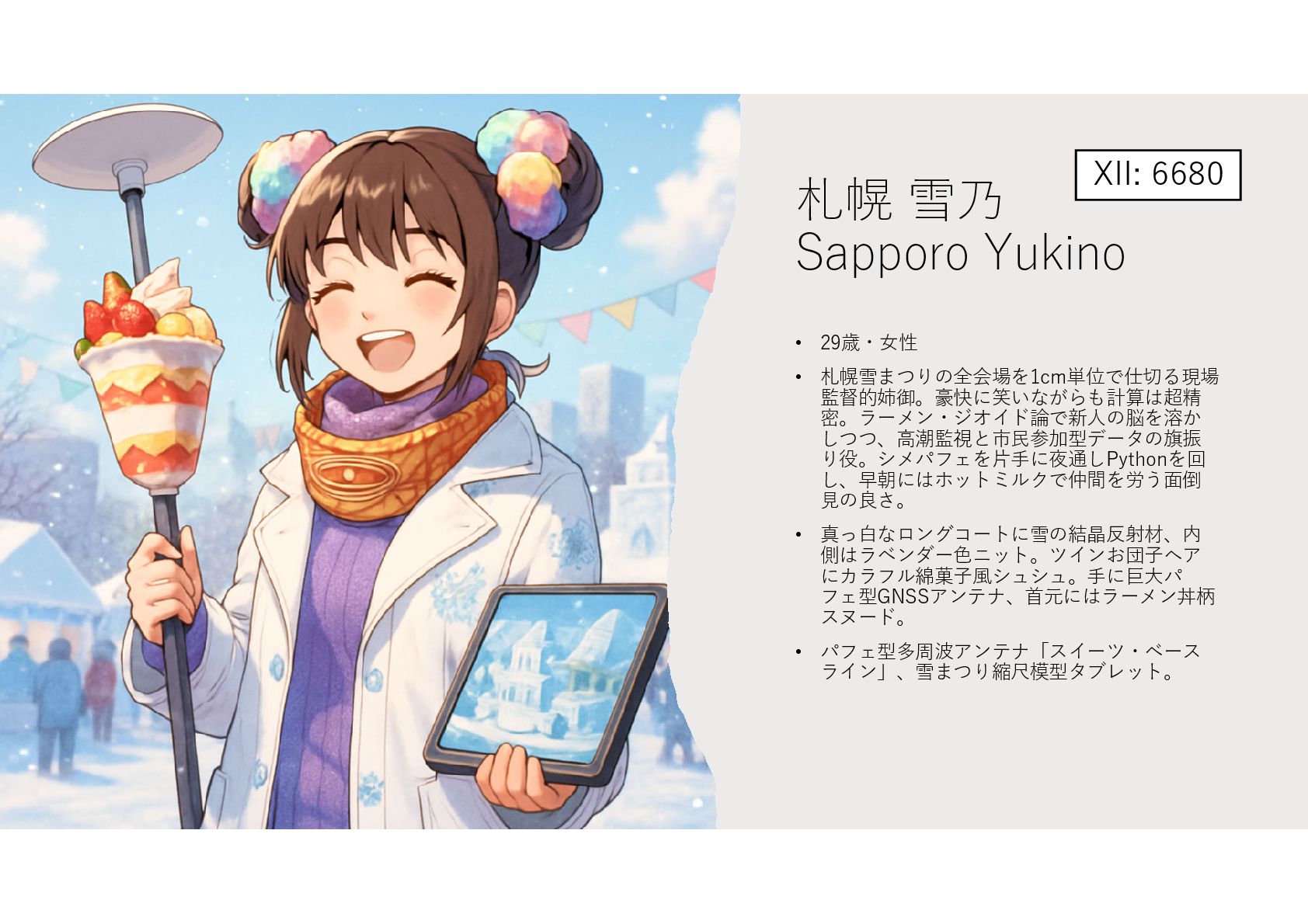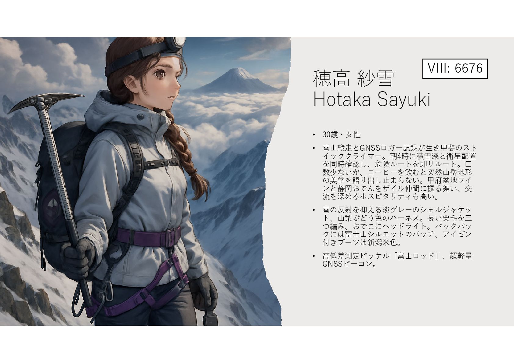 重で計算⾼いが、仲間の危機には鍔鳴りも⾼ らかに⼀歩前へ出る熱⾎漢。蘭学由来の計算 術を語り出すと⽌まらず、茶器⽚⼿に緯度経 度談義を夜通し続けるほどの座標オタク。 • ⿊髪を丁髷⾵に束ね、その上から測量スタッ フの⻩⾊ヘルメットを無理やり被るハイブ リッド侍。⽻織は軍艦島の⽡⾊をした防炎 コート、袴は五島灘の群⻘グラデ。腰の曲尺 ⼑は折り畳みプリズムポールで、鞘には計算 式がびっしり刻まれる。左腕に南蛮鉄の懐中 時計、⾜袋は耐⽔ラバー製。 • 測地曲尺⼑「⻑崎プライムマーク」、磁針羅 針盤を象嵌した⿊檀の茶碗。 I: 6669