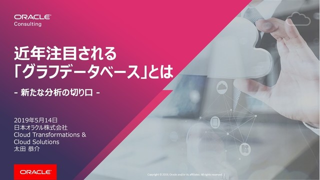 | 6 Graph DBMSには年々⼈気が集まってきている ”Gartner Identifies Top 10 Data and Analytics Technology Trends for 2019” http://db-engines.com/en/ranking_categories “Graph analytics is a set of analytic techniques that allows for the exploration of relationships between entities of interest such as organizations, people and transactions. The application of graph processing and graph DBMSs will grow at 100 percent annually through 2022 to continuously accelerate data preparation and enable more complex and adaptive data science. Graph data stores can efficiently model, explore and query data with complex interrelationships across data silos, but the need for specialized skills has limited their adoption to date, according to Gartner. Graph analytics will grow in the next few years due to the need to ask complex questions across complex data, which is not always practical or even possible at scale using SQL queries.“ GartnerPressRelease, Feb 18、2019 Trend No.5: Graph https://www.gartner.com/en/newsroom/press-releases/2019-02-18-gartner-identifies-top-10- data-and-analytics-technolo