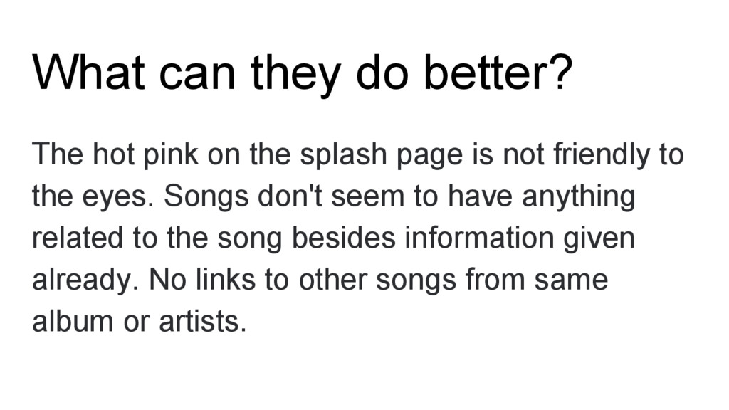 splash page is not friendly to the eyes. Songs don't seem to have anything related to the song besides information given already. No links to other songs from same album or artists.
