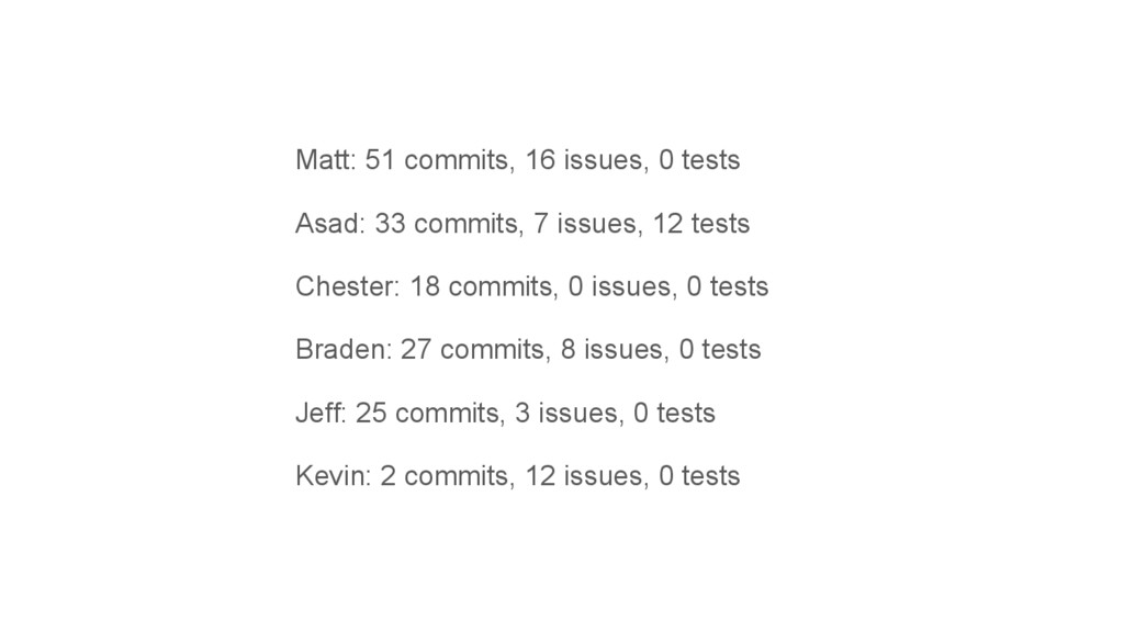 7 issues, 12 tests Chester: 18 commits, 0 issues, 0 tests Braden: 27 commits, 8 issues, 0 tests Jeff: 25 commits, 3 issues, 0 tests Kevin: 2 commits, 12 issues, 0 tests