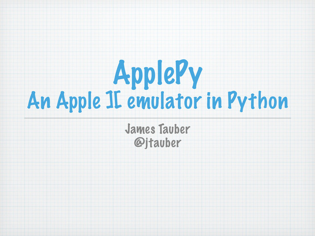 ApplePy is an Apple ][ emulator written in Python. It combines emulation of the 6502 microprocessor with emulation of the keyboard, display (including graphics mode), speaker, cassette and disk drive. This talk will provide a background to Apple ][ internals then dive into the Python code and the challenges of emulating hardware.