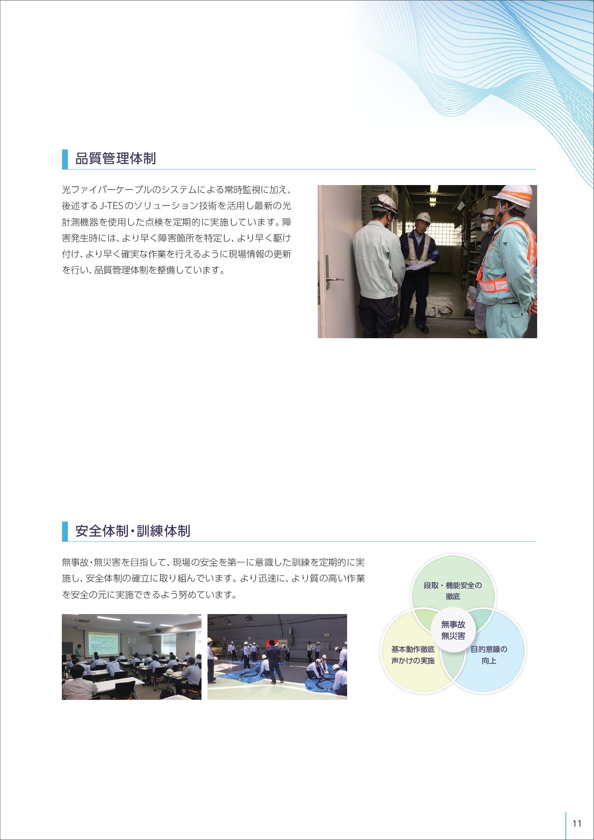 品質管理体制を整備しています。 安全体制・訓練体制 無事故 ・ 無災害を目指して、 現場の安全を第一に意識した訓練を定期的に実 施し、 安全体制の確立に取り組んでいます。 より迅速に、 より質の高い作業 を安全の元に実施できるよう努めています。 ஈऔɾػೳ҆શͷ పఈ جຊಈ࡞పఈ ੠͔͚ͷ࣮ࢪ ແࣄނ ແࡂ֐ ໨తҙࣝͷ ޲্ 11