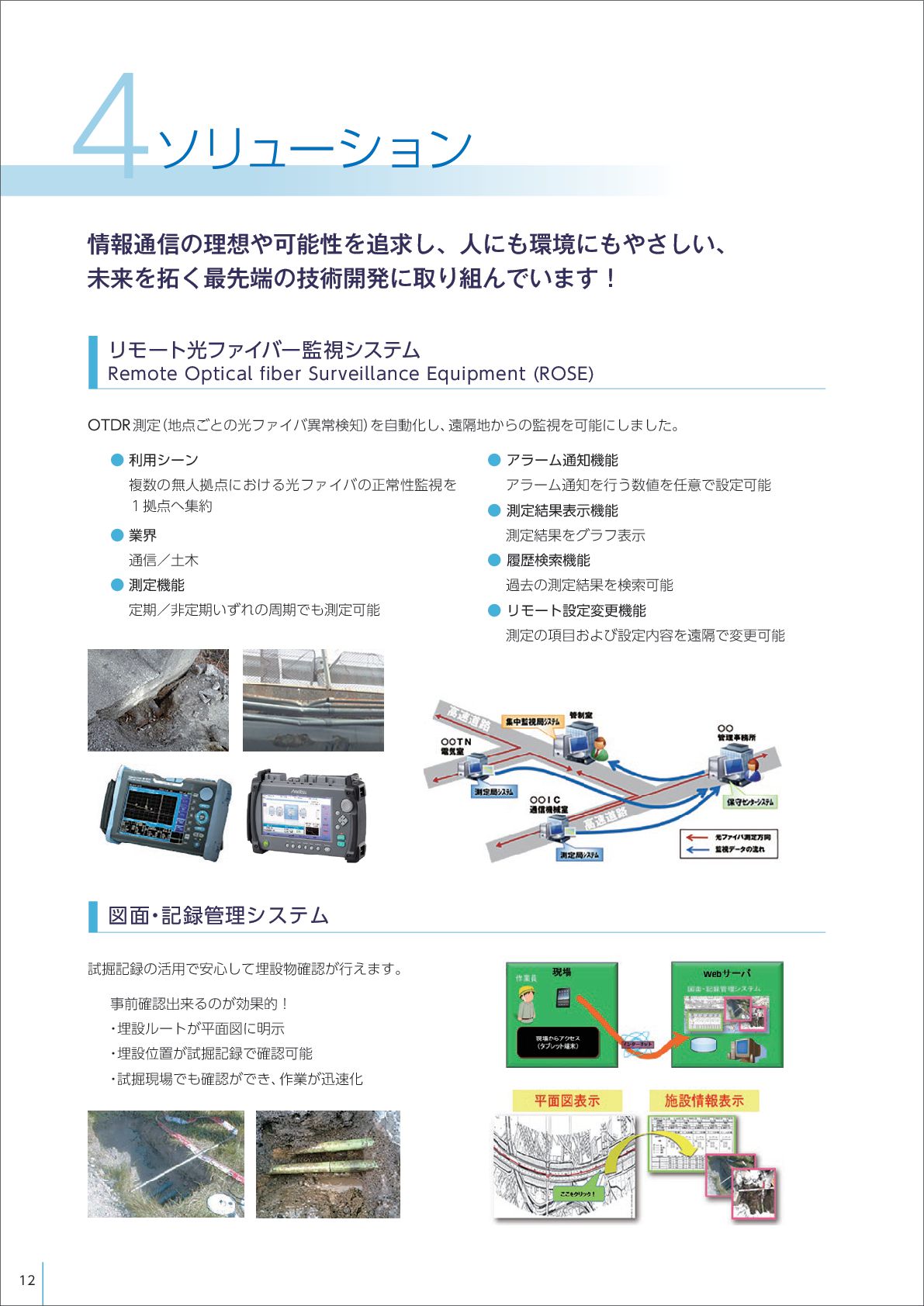 を自動化し、 遠隔地からの監視を可能にしました。 試掘記録の活用で安心して埋設物確認が行えます。 事前確認出来るのが効果的! ・ 埋設ルートが平面図に明示 ・ 埋設位置が試掘記録で確認可能 ・ 試掘現場でも確認ができ、 作業が迅速化 情報通信の理想や可能性を追求し、人にも環境にもやさしい、 未来を拓く最先端の技術開発に取り組んでいます! ソリューション 4 • 利用シーン    複数の無人拠点における光ファイバの正常性監視を 1拠点へ集約 • 業界    通信/土木 • 測定機能    定期/非定期いずれの周期でも測定可能 • アラーム通知機能    アラーム通知を行う数値を任意で設定可能 • 測定結果表示機能    測定結果をグラフ表示 • 履歴検索機能    過去の測定結果を検索可能 • リモート設定変更機能    測定の項目および設定内容を遠隔で変更可能 12