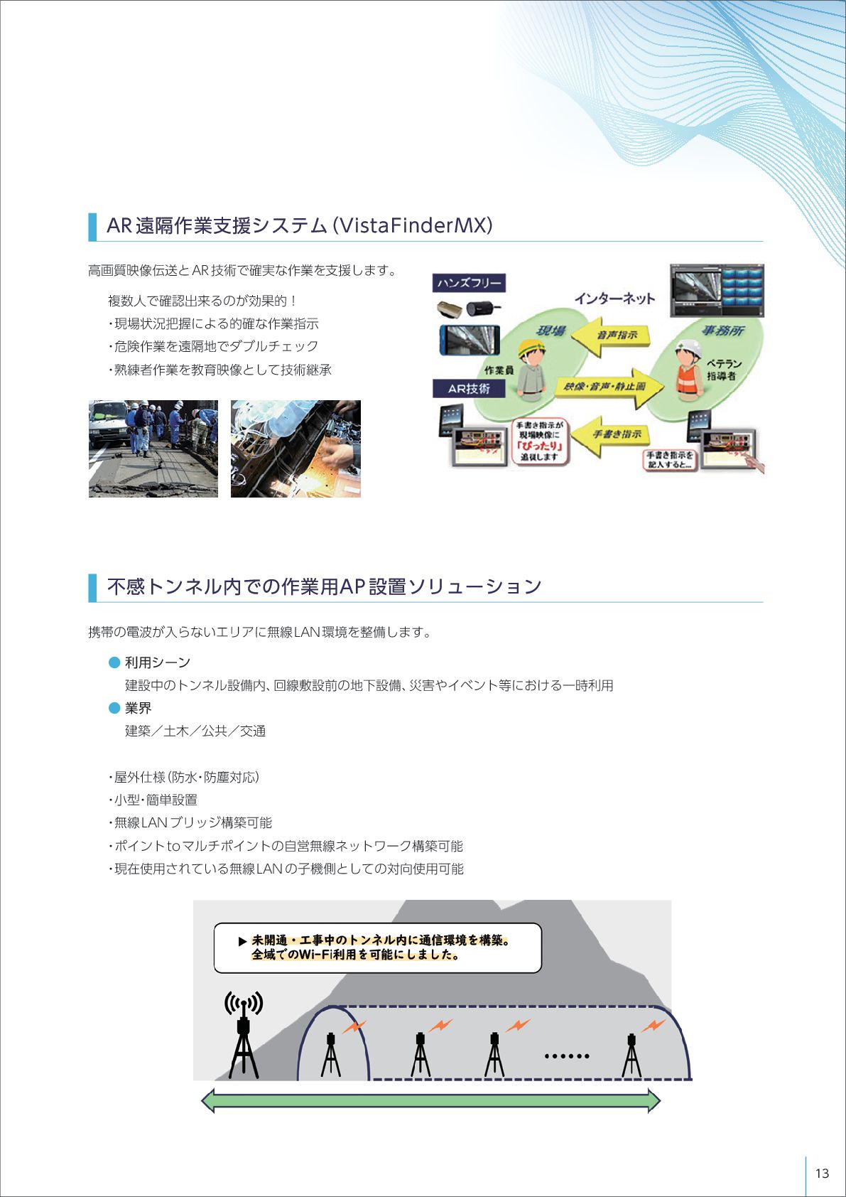12. AR 遠隔作業支援システム (VistaFinderMX) 不感トンネル内での作業用AP 設置ソリューション 高画質映像伝送とAR技術で確実な作業を支援します。 複数人で確認出来るのが効果的! ・ 現場状況把握による的確な作業指示 ・