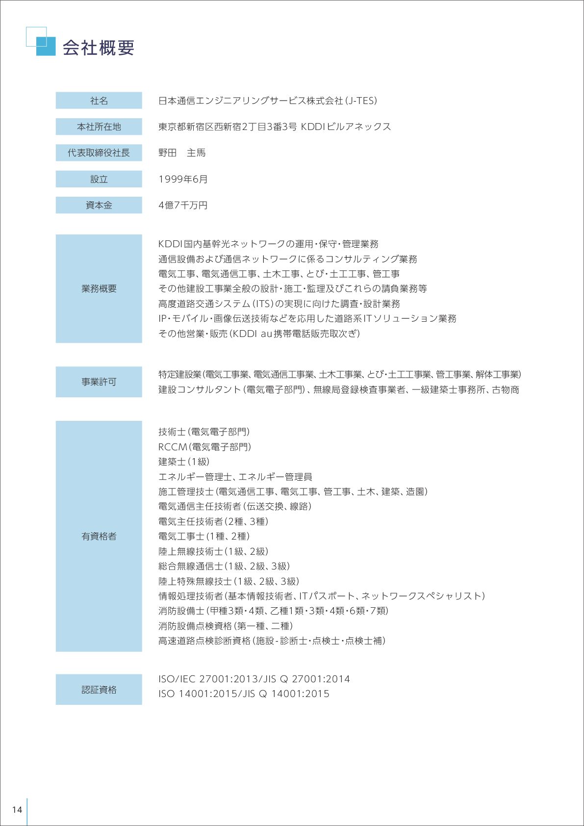13. 会社概要 日本通信エンジニアリングサービス株式会社 (J-TES) 東京都新宿区西新宿2丁目3番3号 KDDI ビルアネックス 野田 主馬 1999年6月 4億7千万円 特定建設業