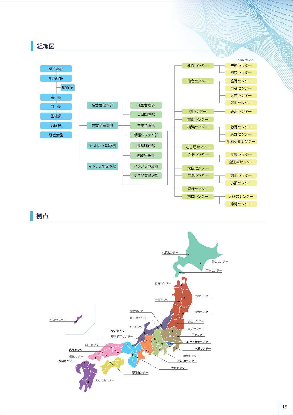 14. 組織図 拠点 ଳ޿ηϯλʔ വؗηϯλʔ ੝Ԭηϯλʔ ܊ࢁηϯλʔ ઋ୆ηϯλʔ ࣛপηϯλʔ ੩Ԭηϯλʔ ͑ͼͷηϯλʔ