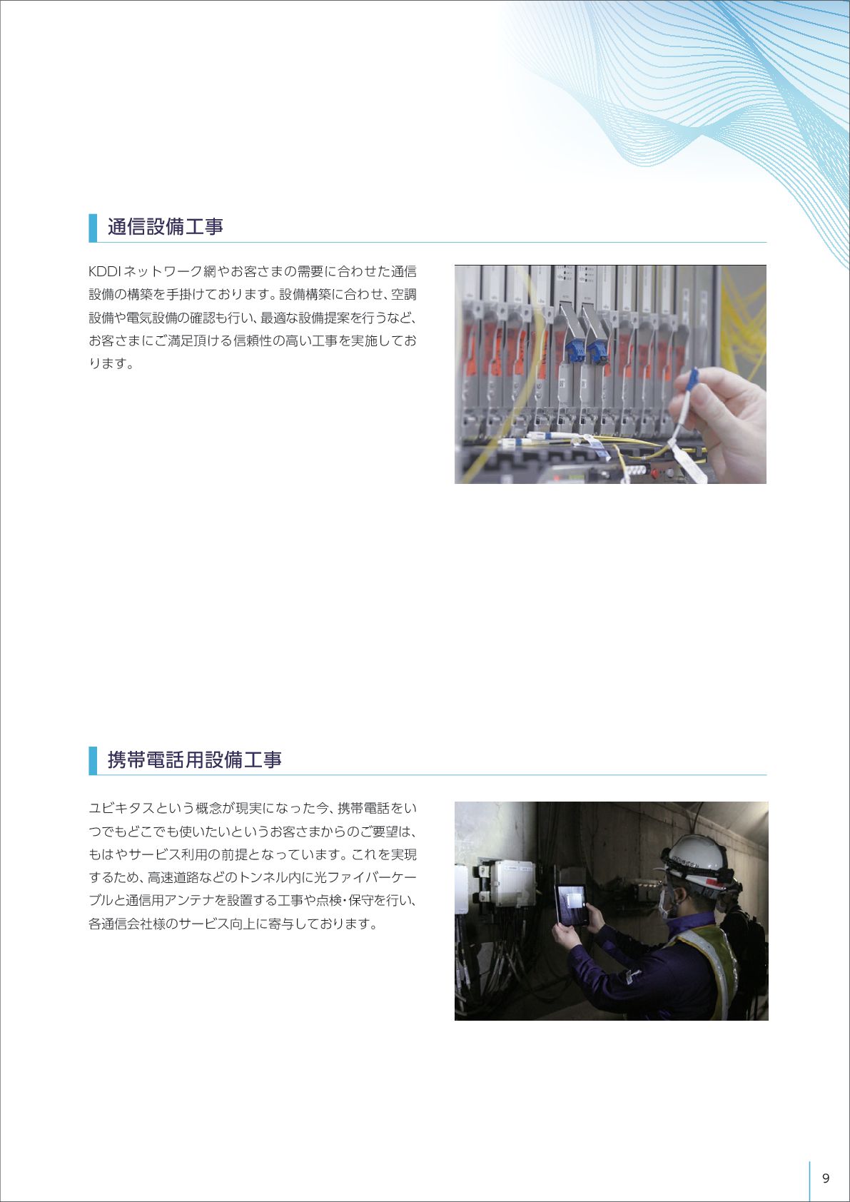 ユビキタスという概念が現実になった今、 携帯電話をい つでもどこでも使いたいというお客さまからのご要望は、 もはやサービス利用の前提となっています。 これを実現 するため、 高速道路などのトンネル内に光ファイバーケー ブルと通信用アンテナを設置する工事や点検 ・ 保守を行い、 各通信会社様のサービス向上に寄与しております。 9