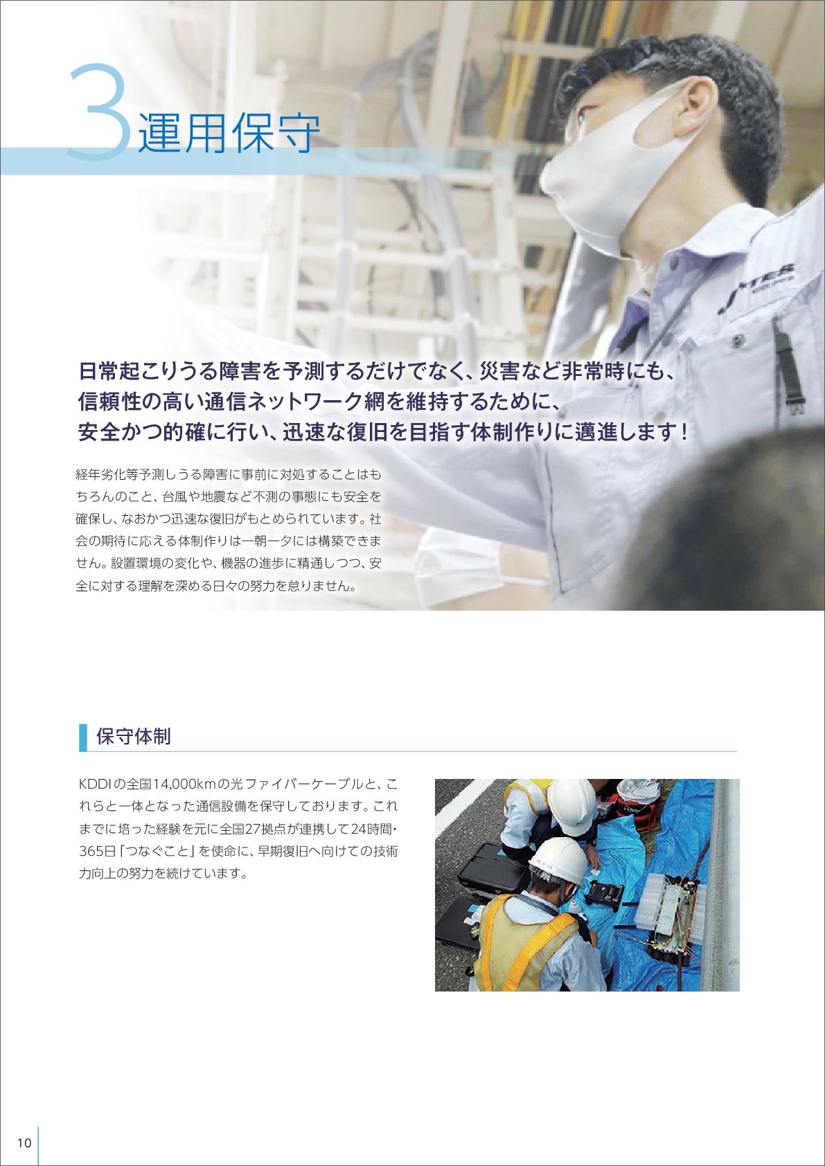 を使命に、 早期復旧へ向けての技術 力向上の努力を続けています。 日常起こりうる障害を予測するだけでなく、 災害など非常時にも、 信頼性の高い通信ネットワーク網を維持するために、 安全かつ的確に行い、 迅速な復旧を目指す体制作りに邁進します! 運用保守 3 経年劣化等予測しうる障害に事前に対処することはも ちろんのこと、 台風や地震など不測の事態にも安全を 確保し、 なおかつ迅速な復旧がもとめられています。 社 会の期待に応える体制作りは一朝一夕には構築できま せん。 設置環境の変化や、 機器の進歩に精通しつつ、 安 全に対する理解を深める日々の努力を怠りません。 10